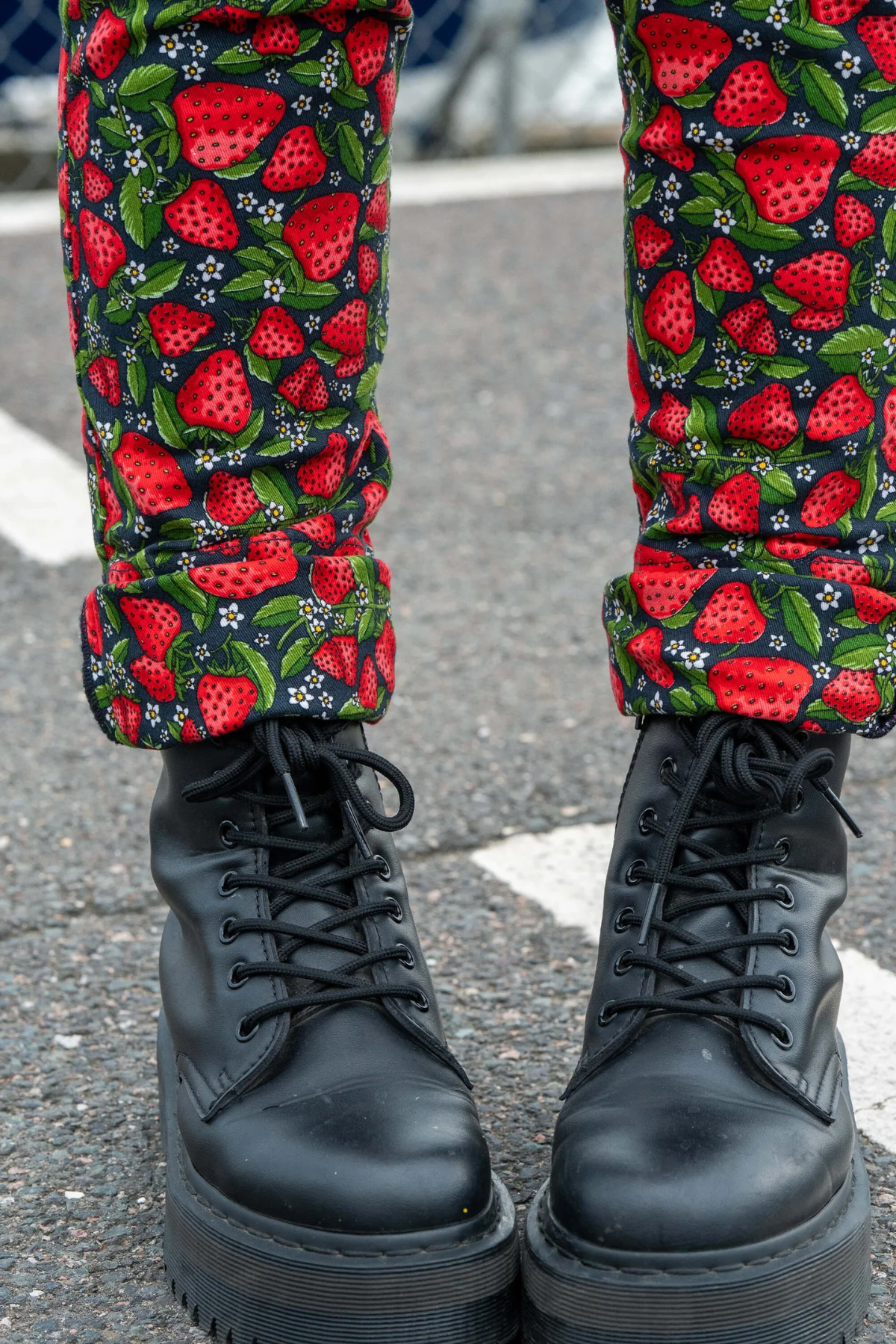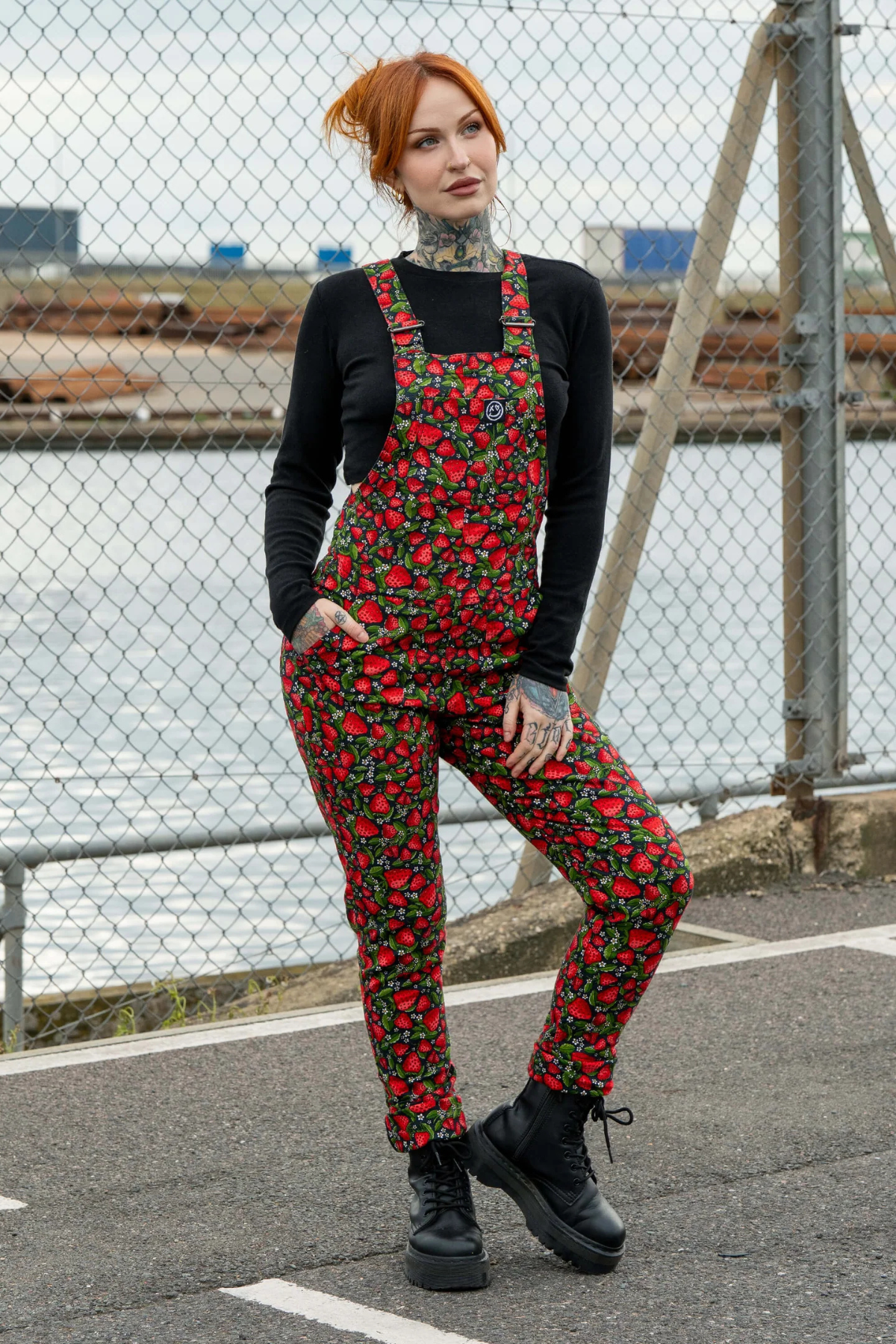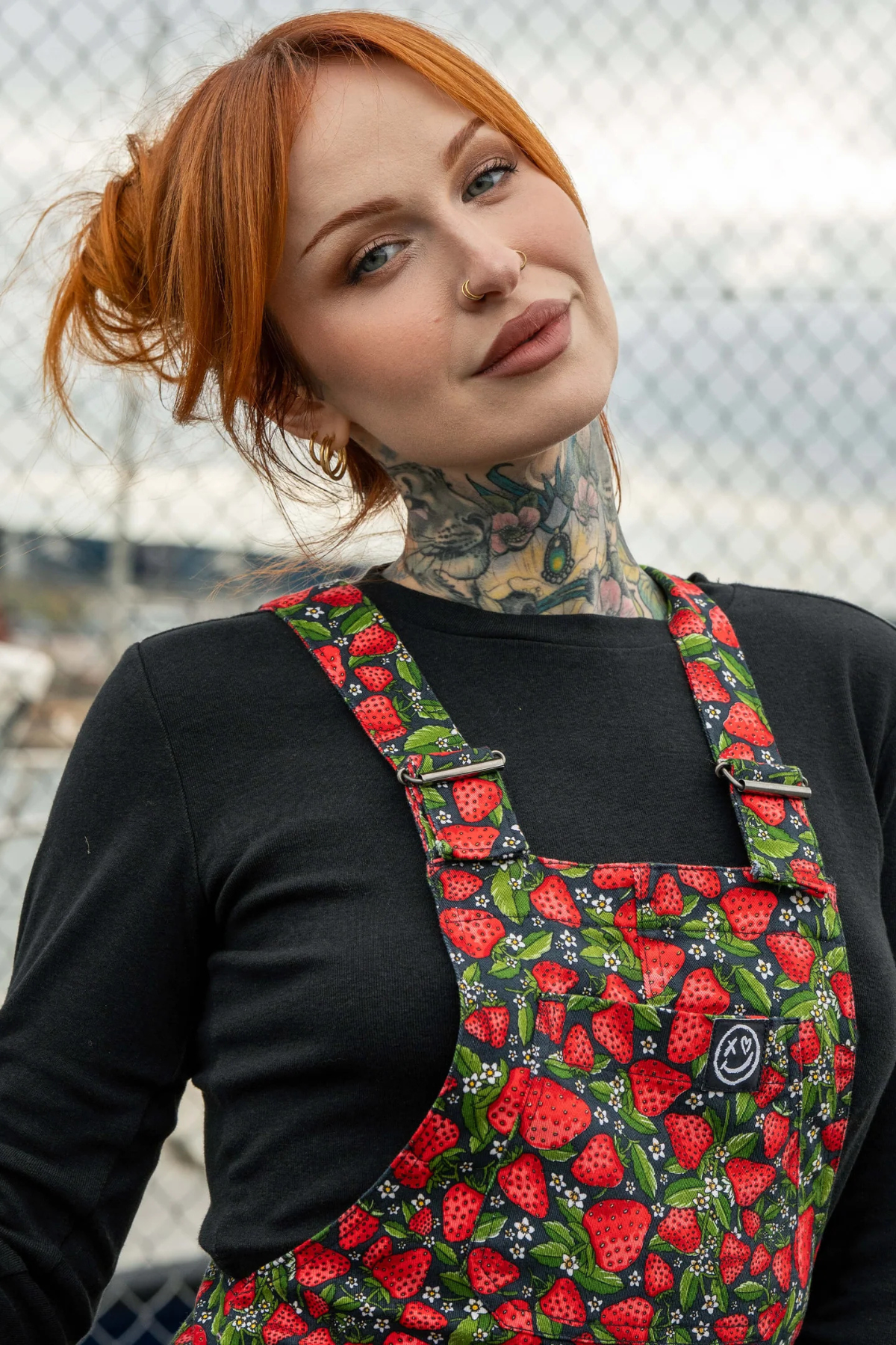Sweet, ripe & ready to wear! 🍓 De ikoniske Strawberry Field dungarees er fyldt med juicy sommerstemning og retrocharme. Printet, designet af den fantastiske Jen James, emmer af solmodne jordbær, små hvide blomster og grønne blade – en ægte dopamine dressing-drøm, hvor cottagecore møder kitsch!