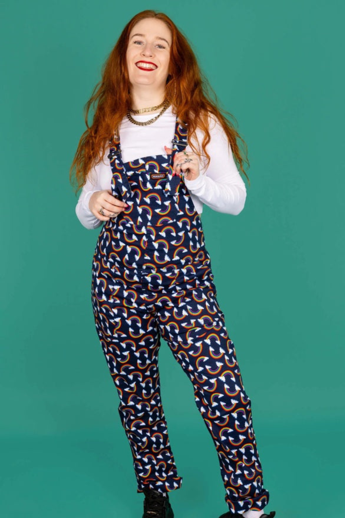 De skønneste farverige dungarees fra RUN&FLY, med retro "rullespænde" og 5 lommer. (2 forlommer, 2 baglommer og 1 "bib-lomme" med RUN&FLY logo påsyet.)