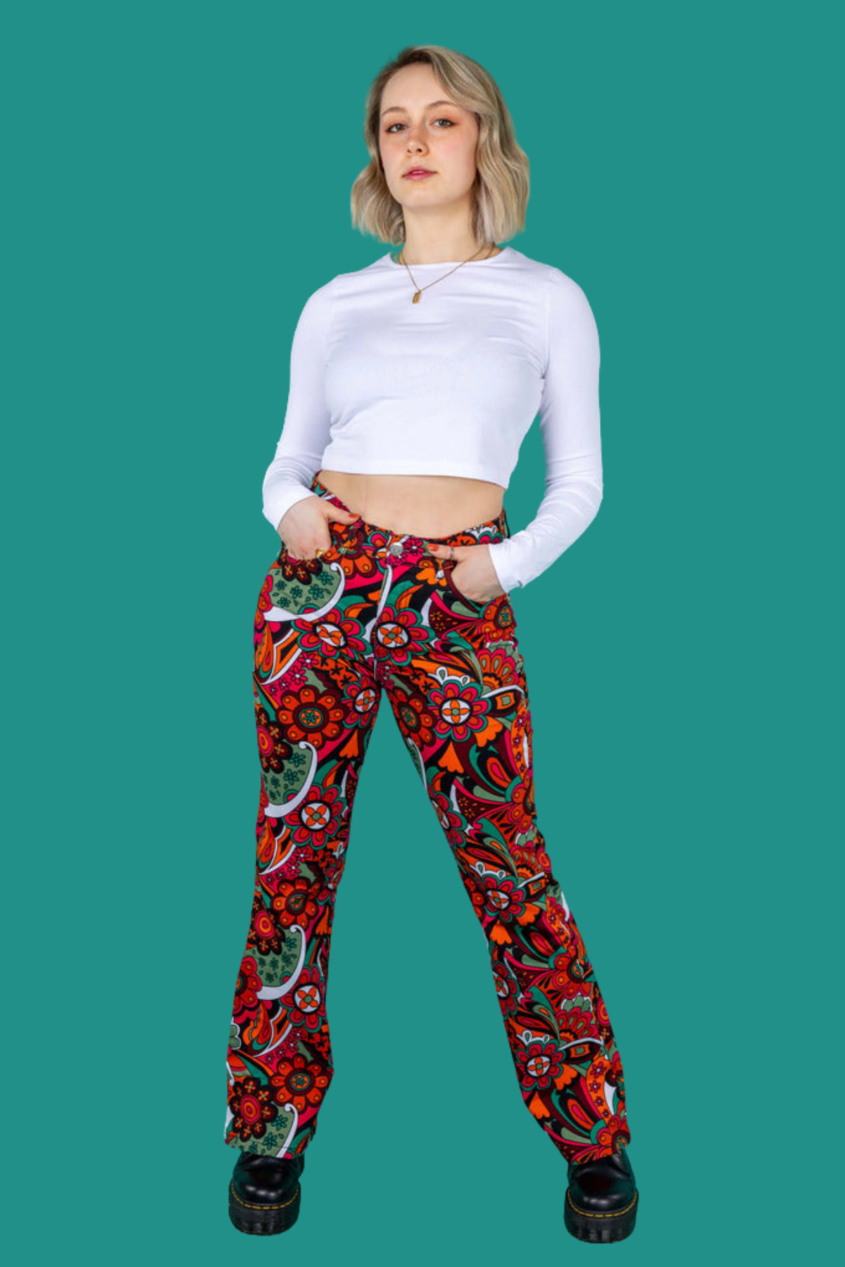 Fantastiske bukser fra RUN&FLY. Disse bukser er lavtaljede, er flared og har knap og lynlås lukning. Bukserne er i et dejligt farverigt design, inspireret af 1960-erne. Add some flower power to your wardrobe today!