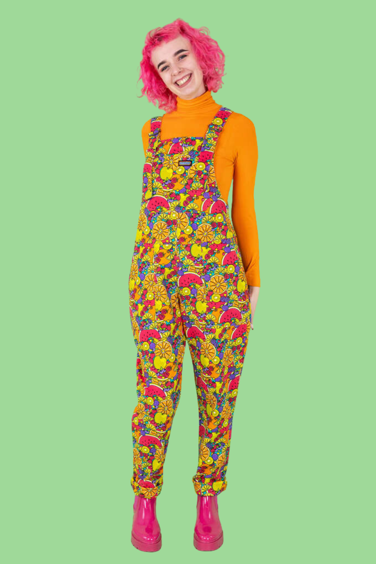 De skønneste farverige dungarees fra RUN&FLY, med retro "rullespænde" og 5 lommer. (2 forlommer, 2 baglommer og 1 "bib-lomme" med RUN&FLY logo påsyet.)