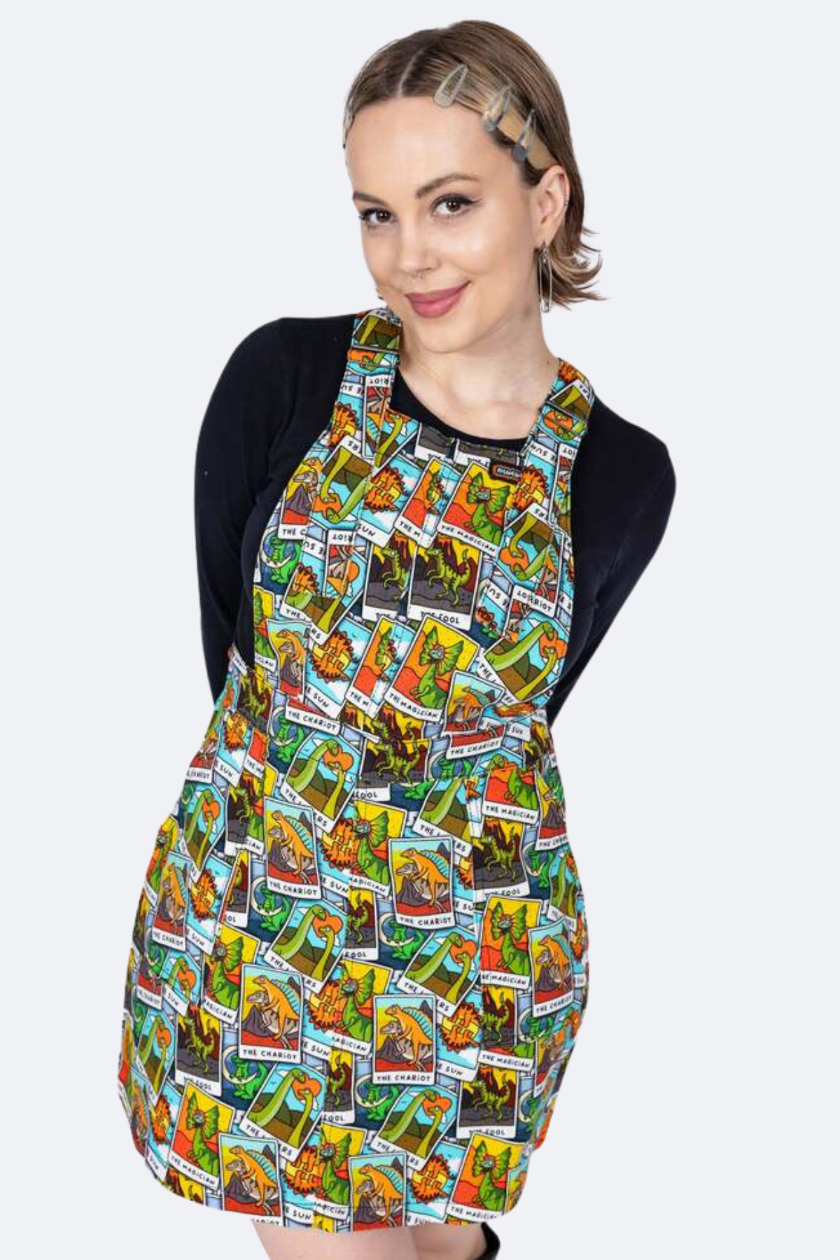 De skønneste farverige pinafore kjole fra RUN&FLY, med retro "rullespænde" og 2 lommer.