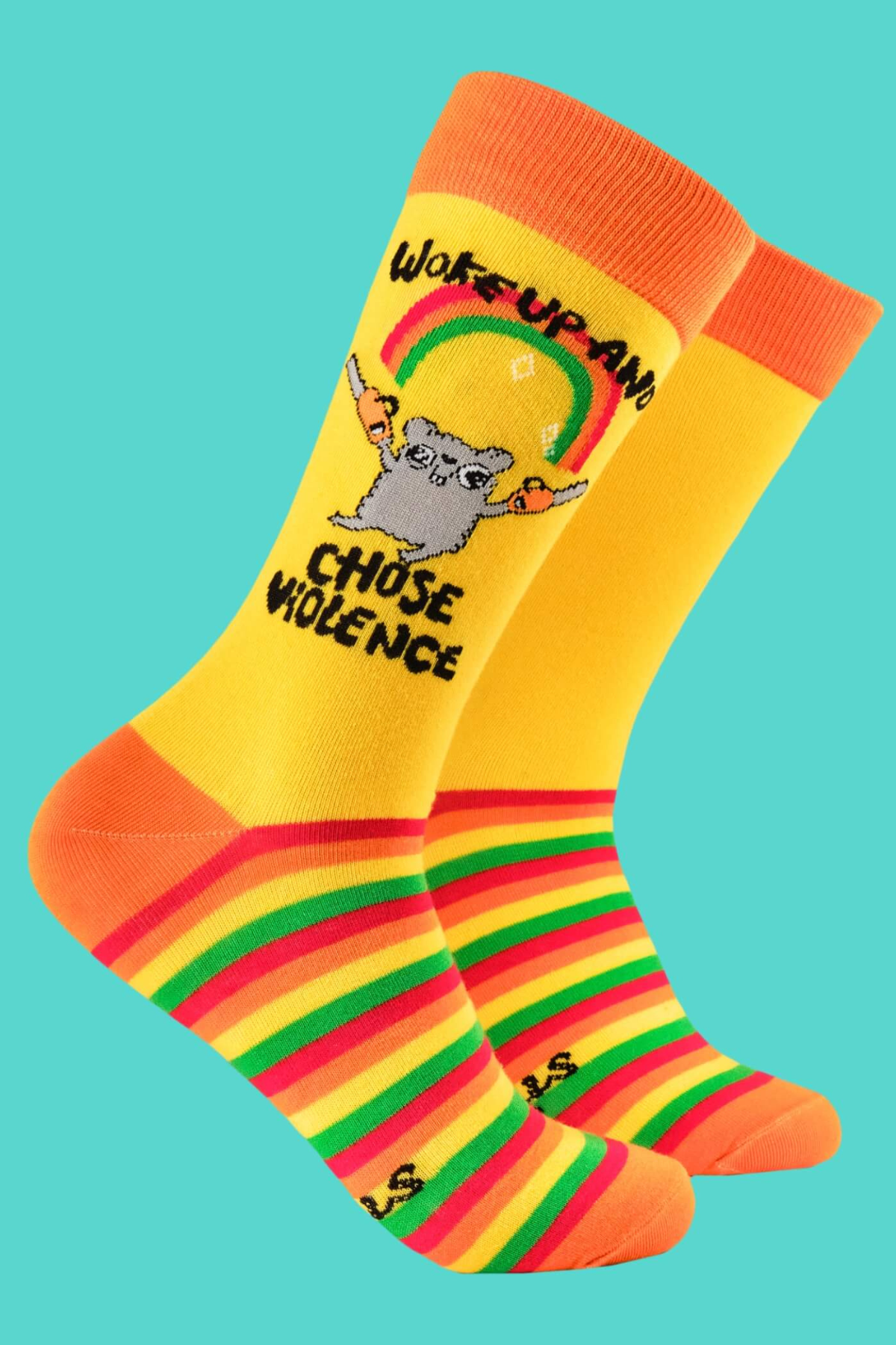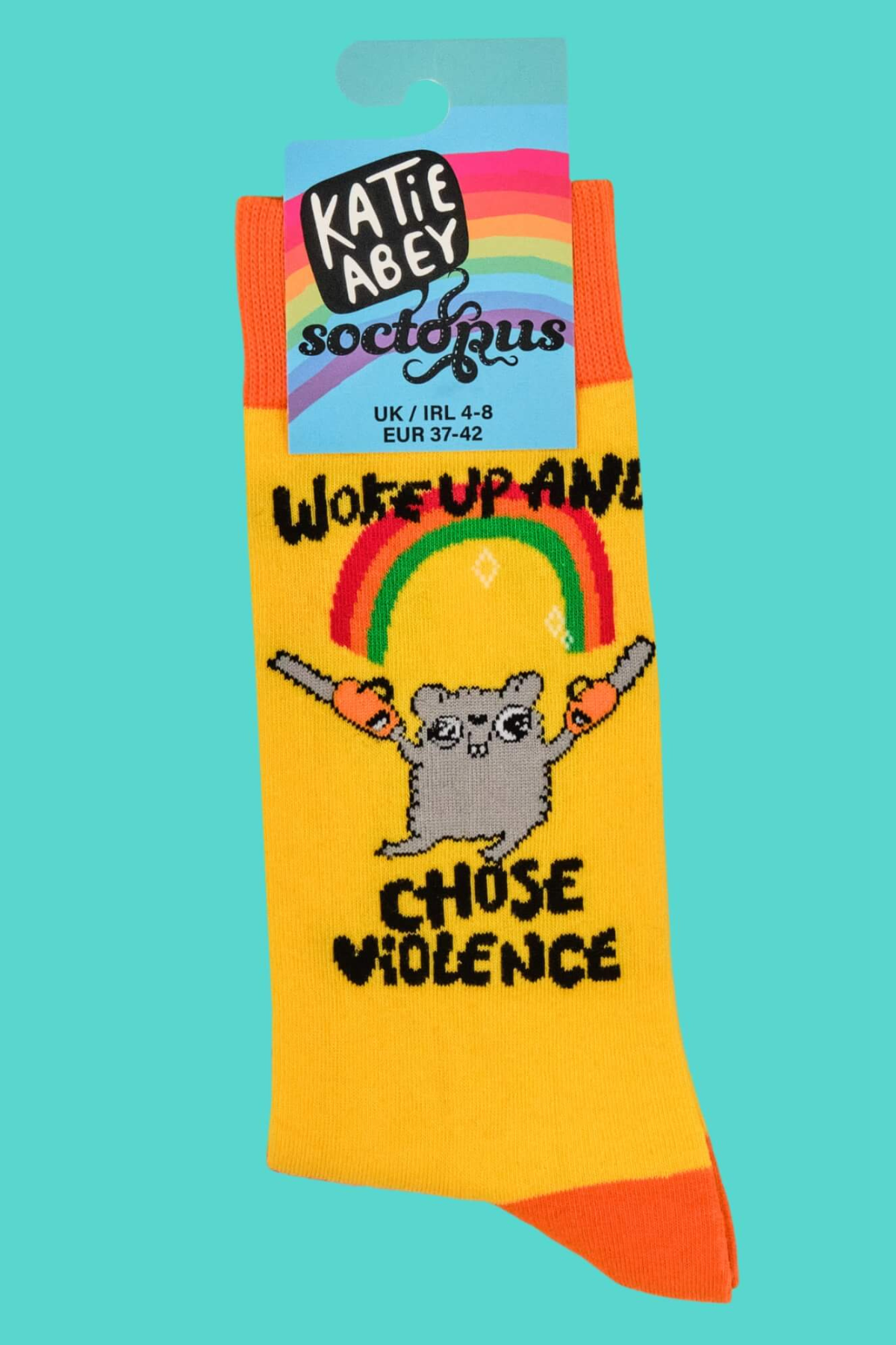 Start dagen med en god portion kaotisk energi med disse farvestrålende “Woke Up And Chose Violence” strømper fra Katie Abey x Soctopus.