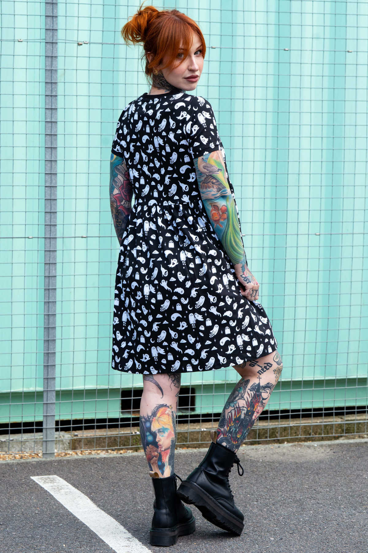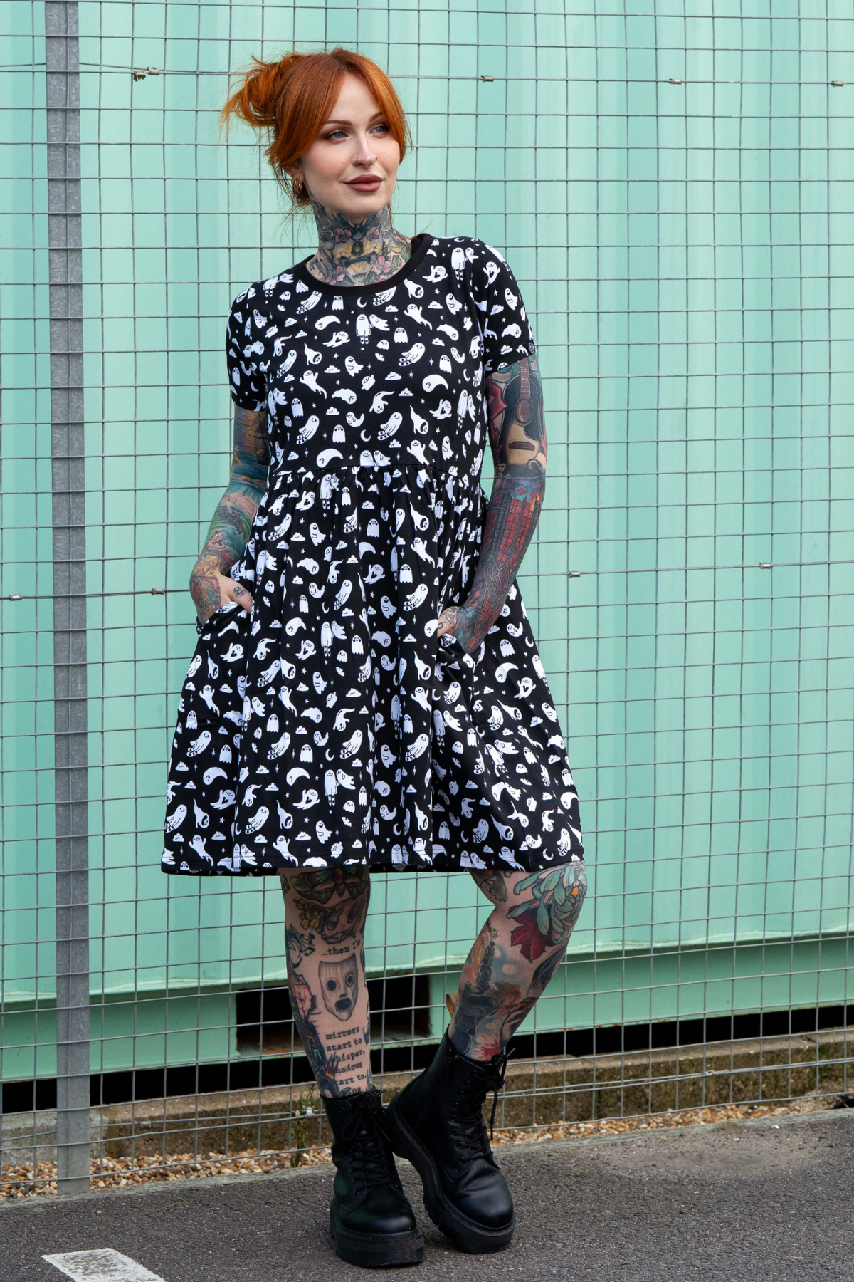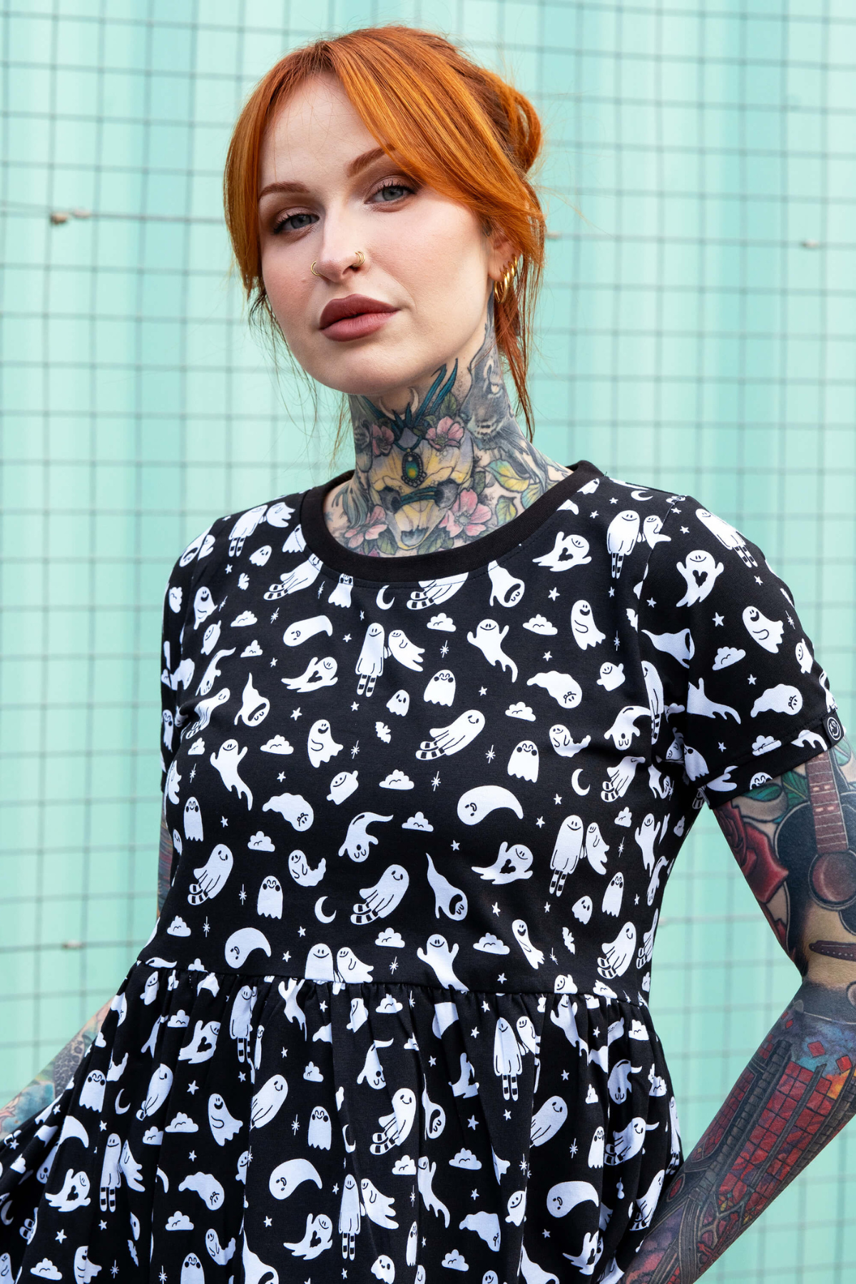 Rebel Romances skønne jersey kjole med det skræmmende søde Ghosties print, skabt af Yasmin Cousins.