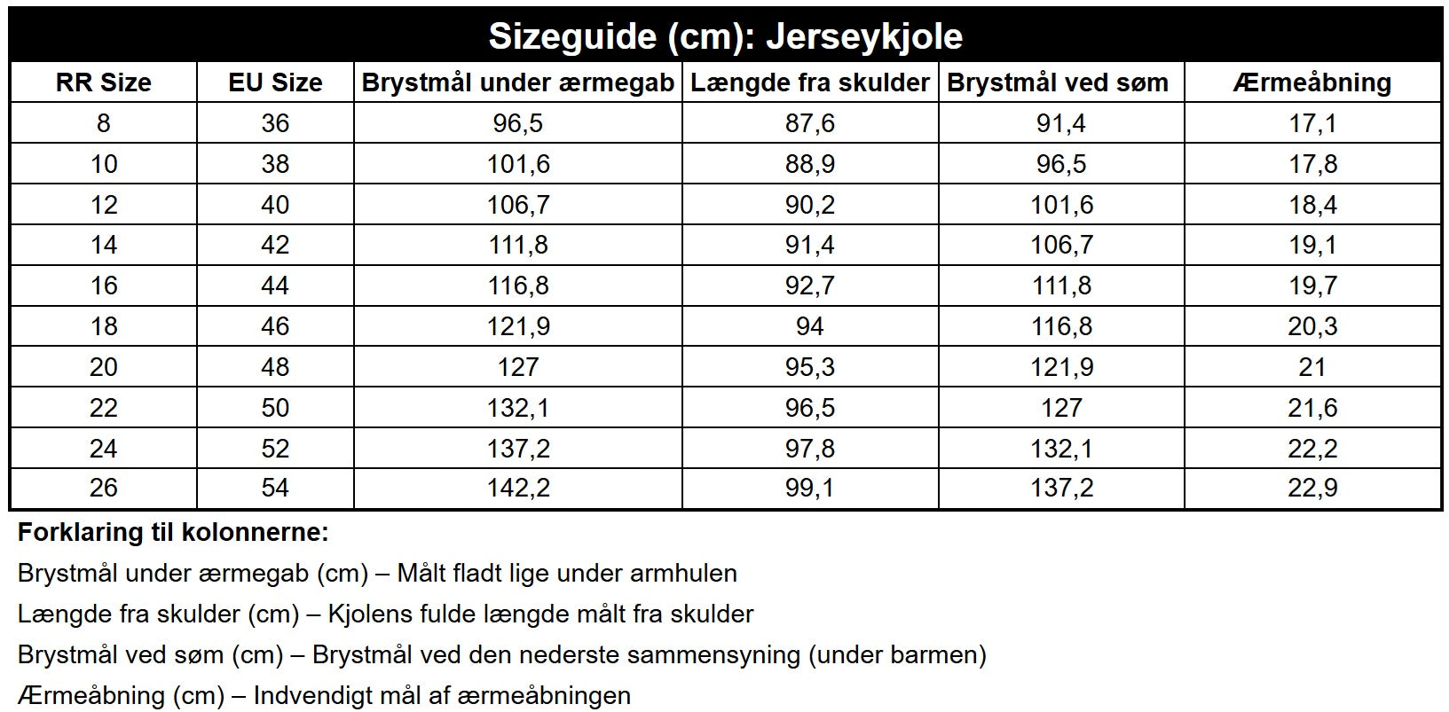 Se måleskema på sidste billeder for at finde din perfekte størrelse. Gå en størrelse ned, hvis du ønsker et mere tætsiddende fit.