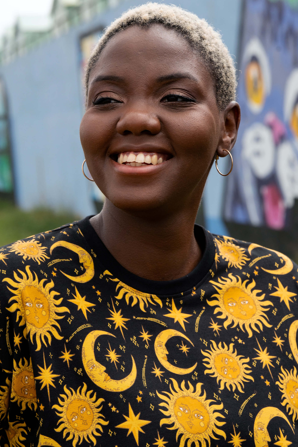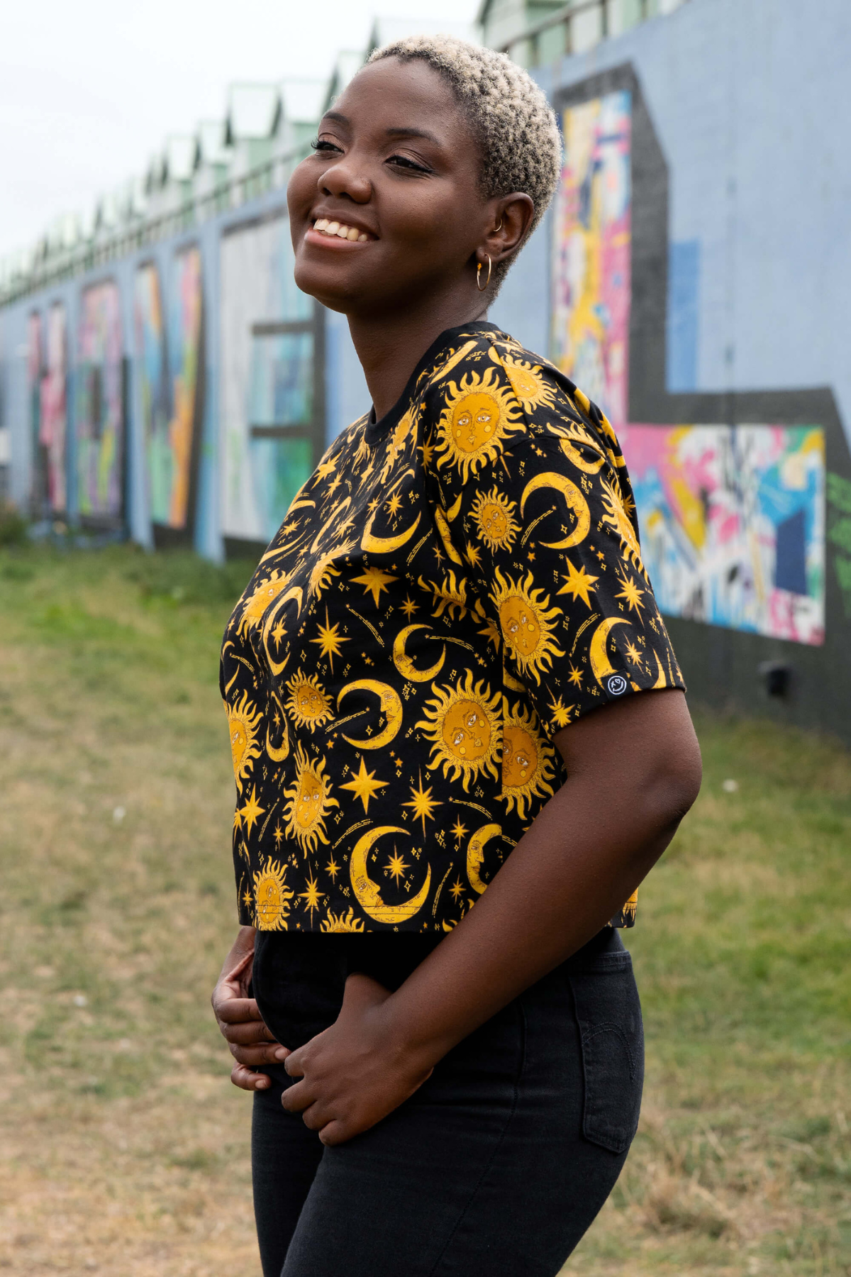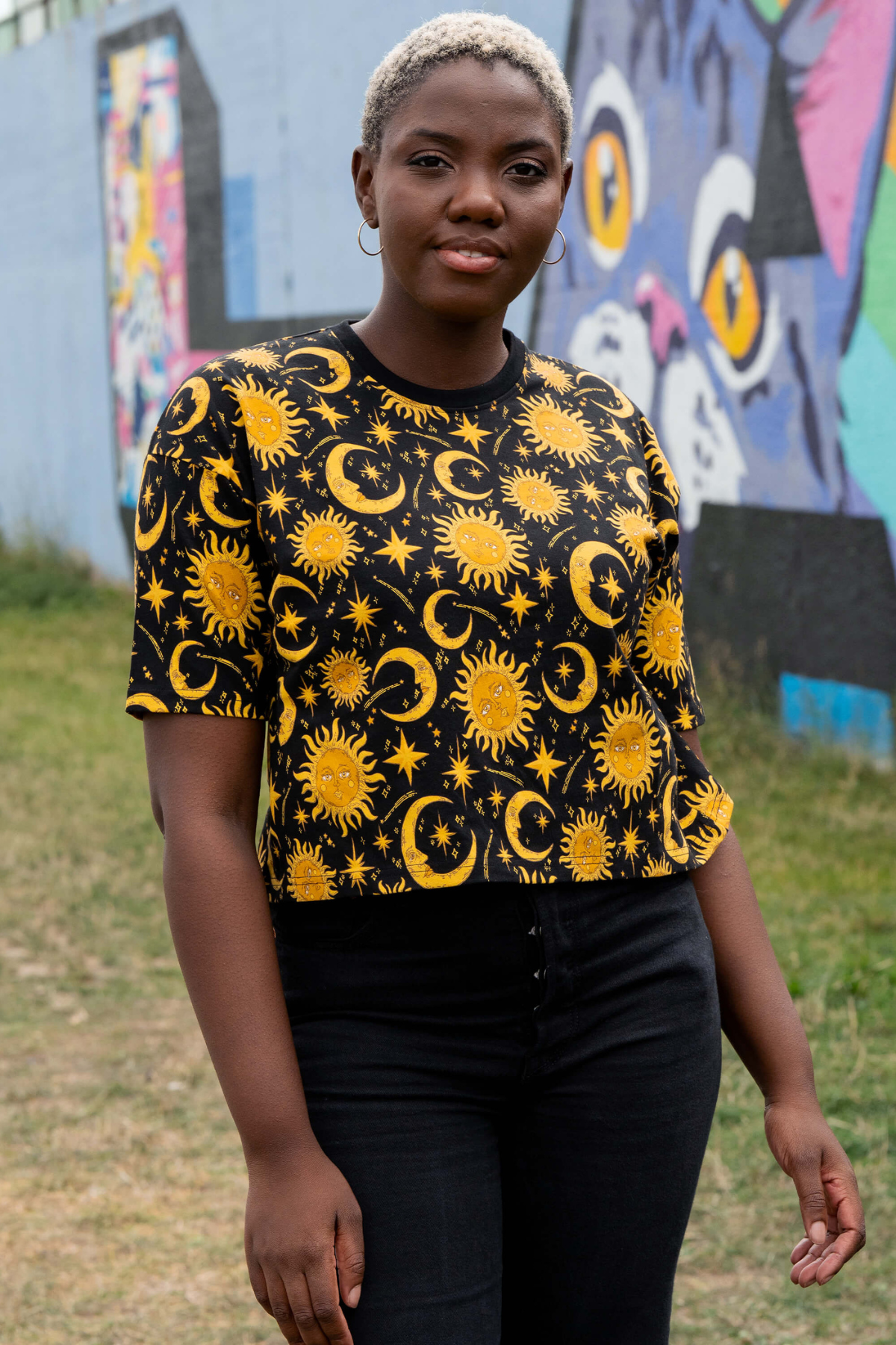 Kært barn har mange navne: cropped tee, boxy t-shirt, celestial top, sun and moon tee, Rebel Romance Danmark, Jen James Design, astrology shirt, sol og måne t-shirt, festival top, farverig mode, plussize fashion, size inclusive, alternative fashion, dopamine dressing – vi skriver det hele, så du kan finde den uanset hvad du søger efter.