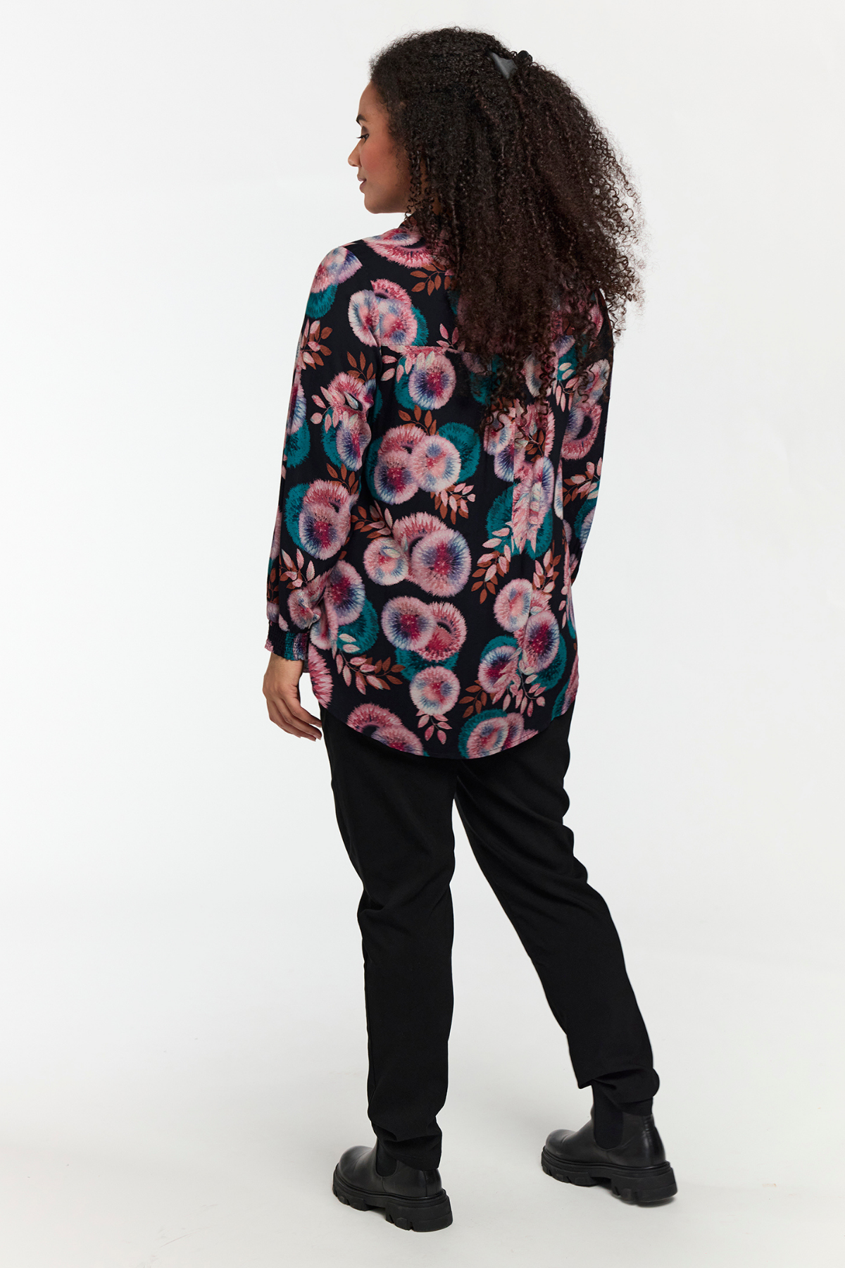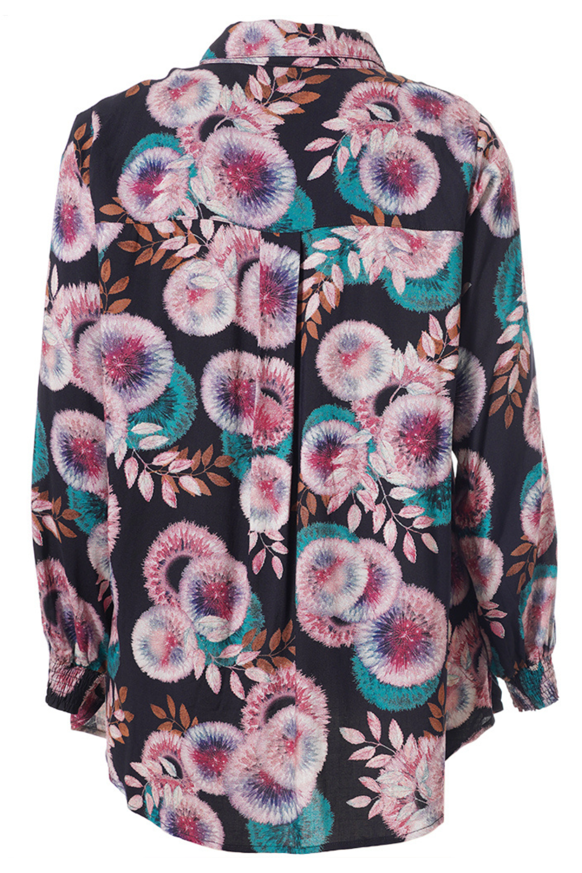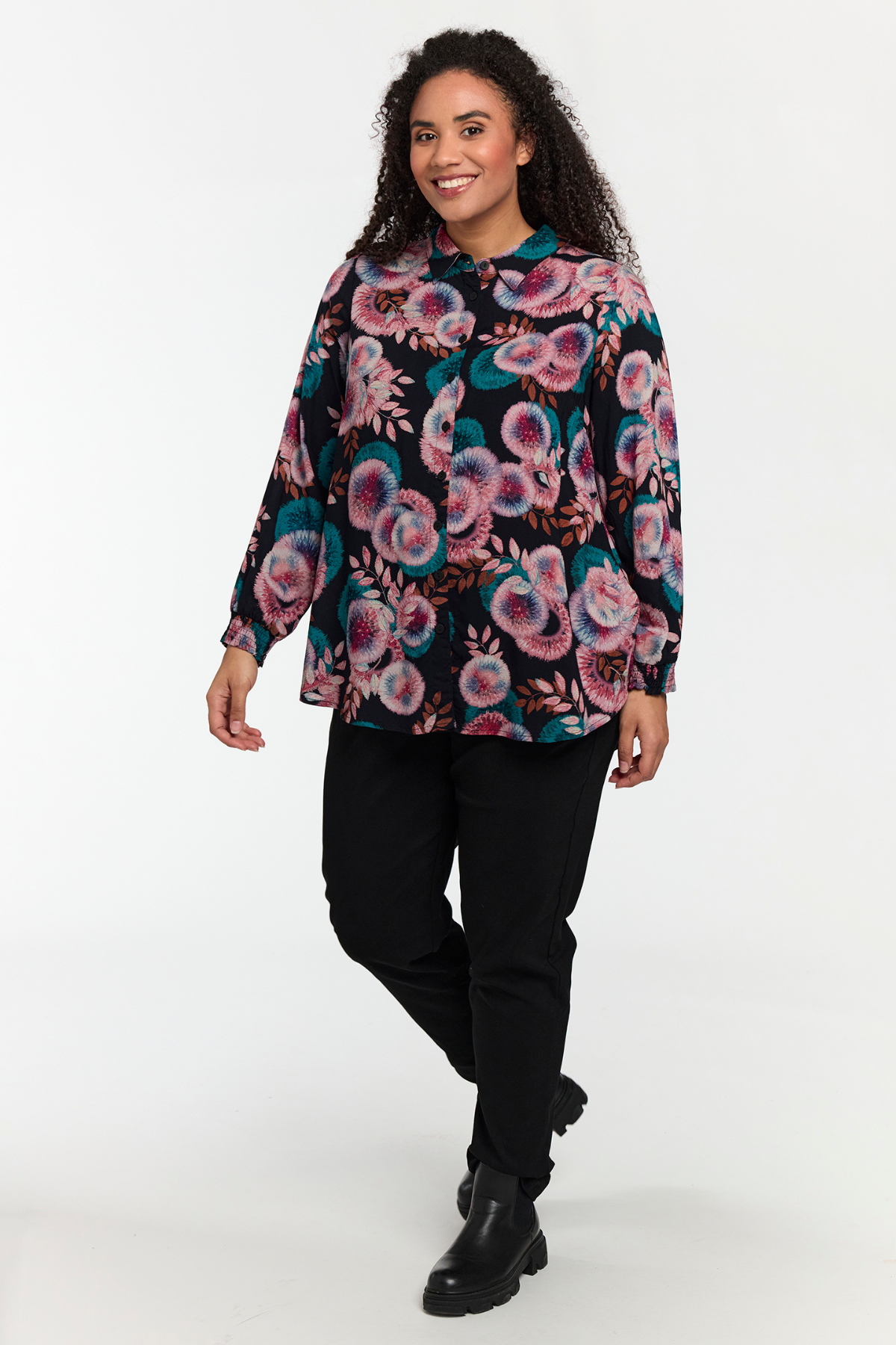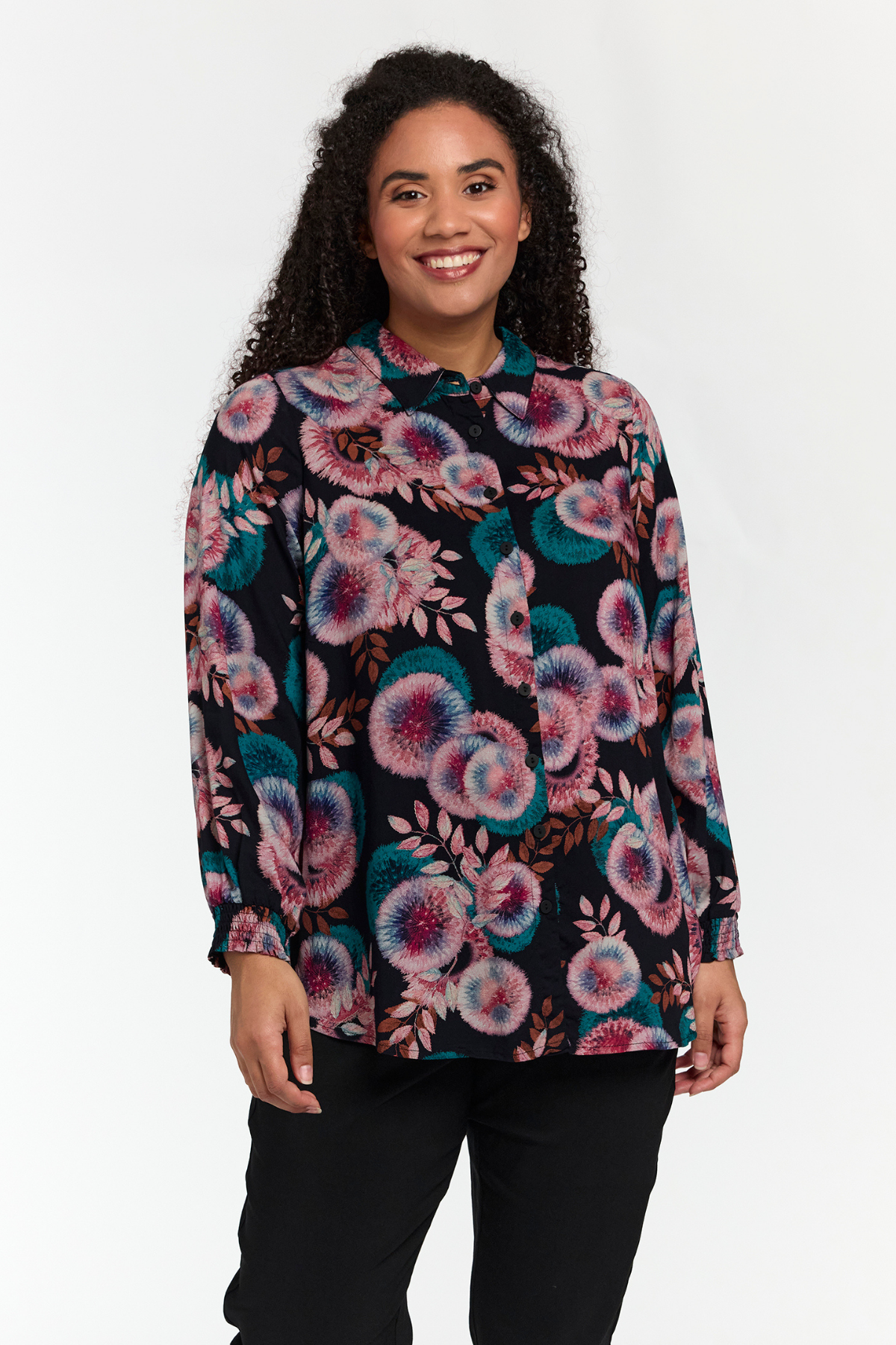 Det iøjnefaldende pink flowers-print kombinerer lyserøde, turkis og lilla nuancer på en mørk baggrund – et mønster, der virkelig skiller sig ud og giver energi til din garderobe. Den klassiske skjortekrave og gennemgående knaplukning giver et velklædt look, mens den løse pasform sikrer komfort hele dagen.
