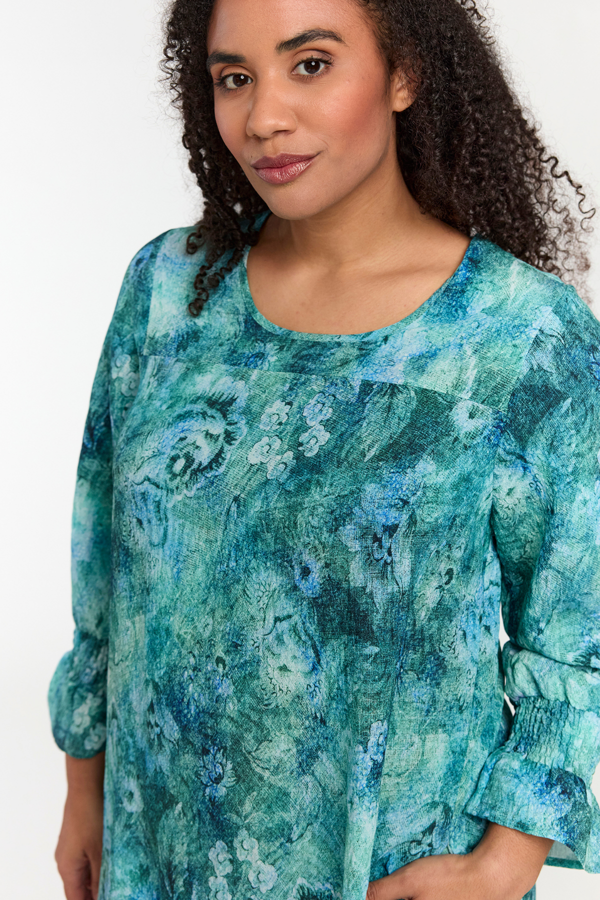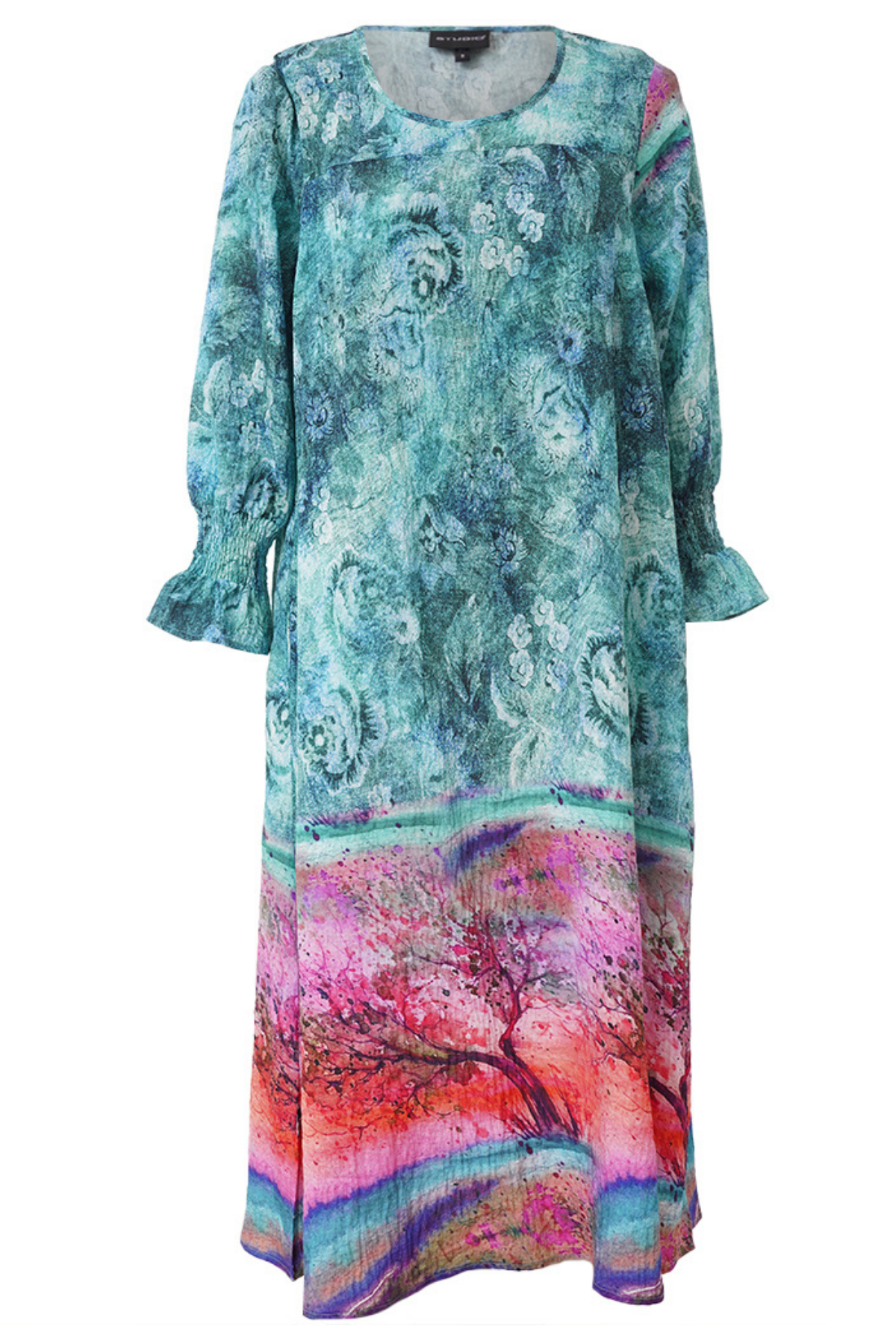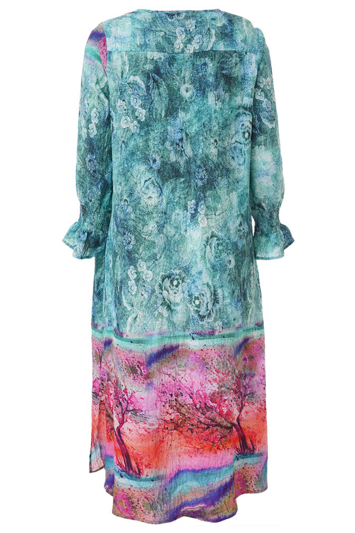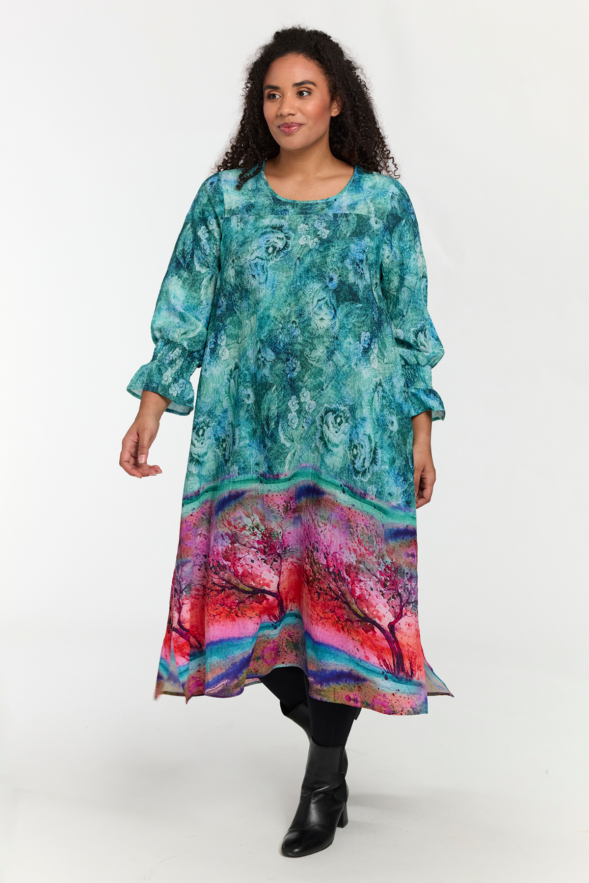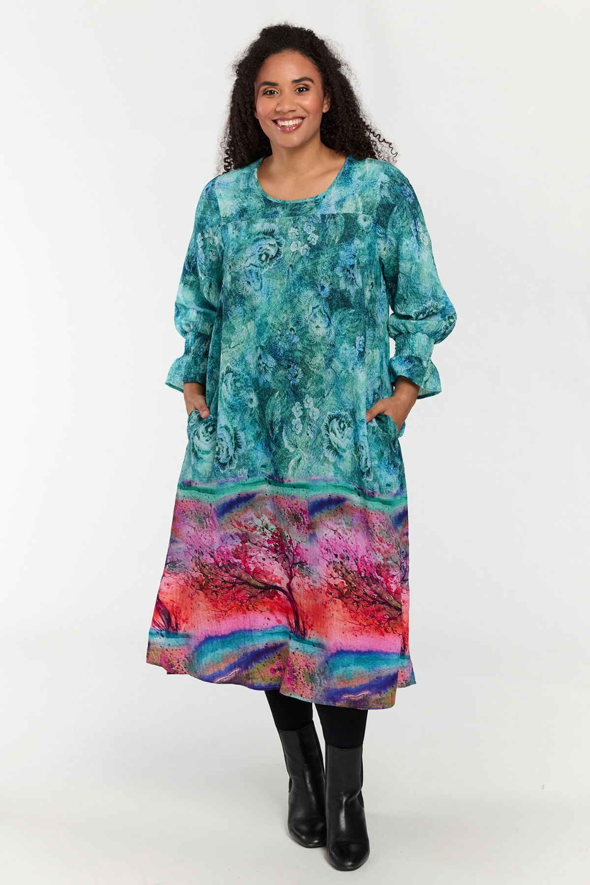Kjolen kombinerer et roligt blågrønt mønster på overdelen med et levende pink/lilla border-print nederst, der nærmest ligner et maleri. De lange ærmer har elastisk afslutning, hvilket skaber et let puf og en elegant finish.