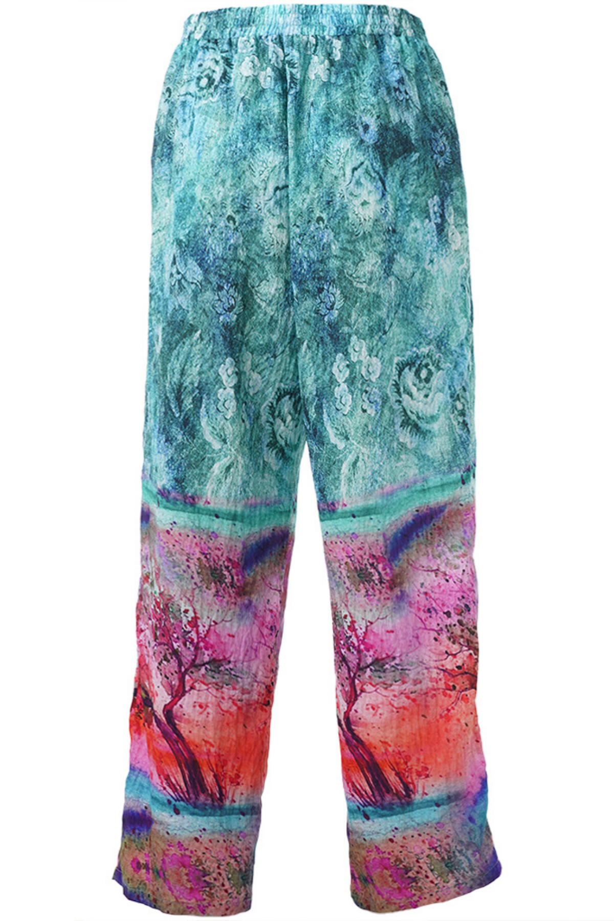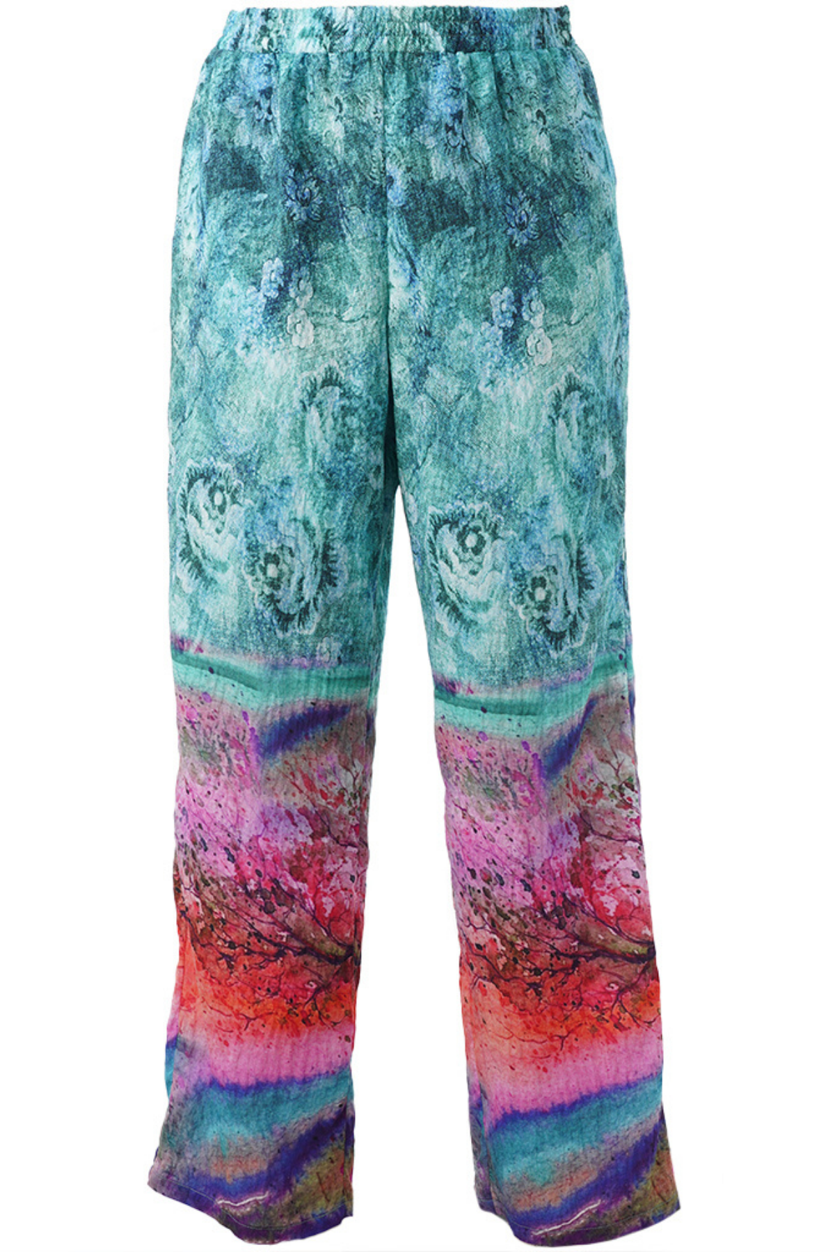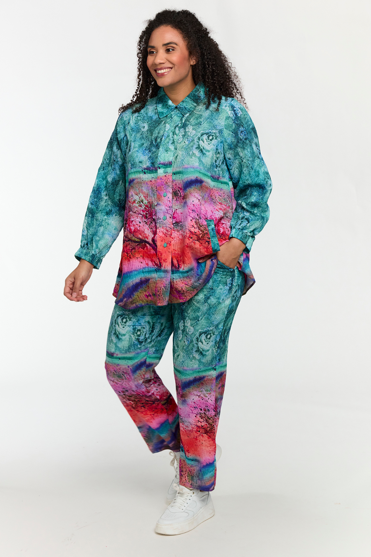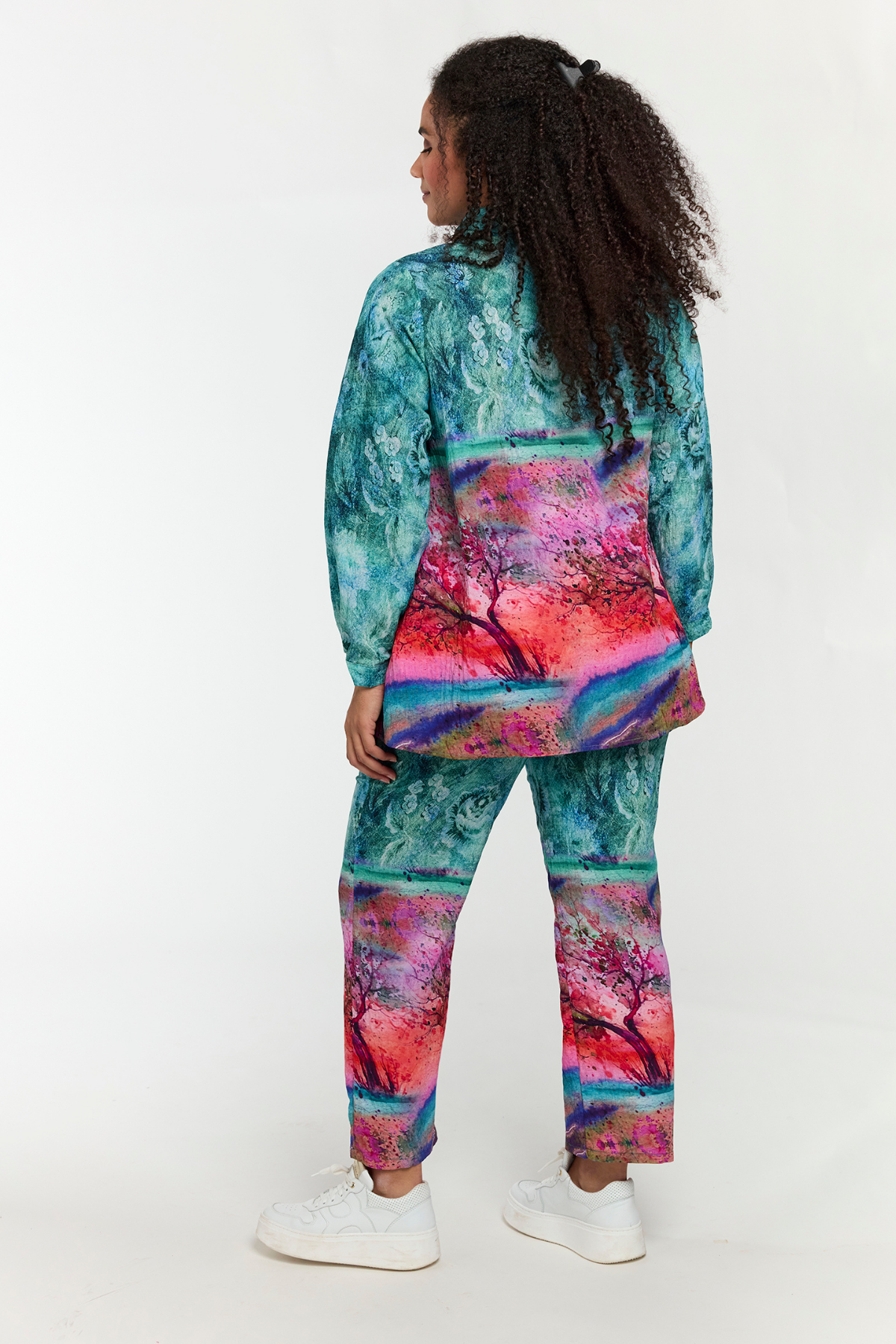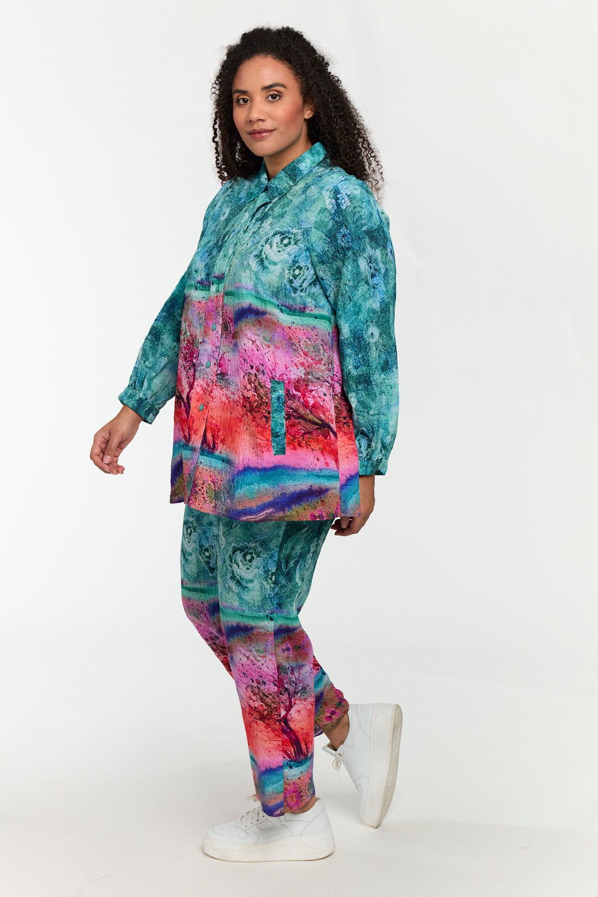 Printet er et kunstnerisk miks af turkis, pink, lilla og orange nuancer – et visuelt univers, der minder om abstrakte landskaber og akvarelmaleri. Perfekt til dig, der vil have et statement-piece, der både er afslappet og stilfuldt.