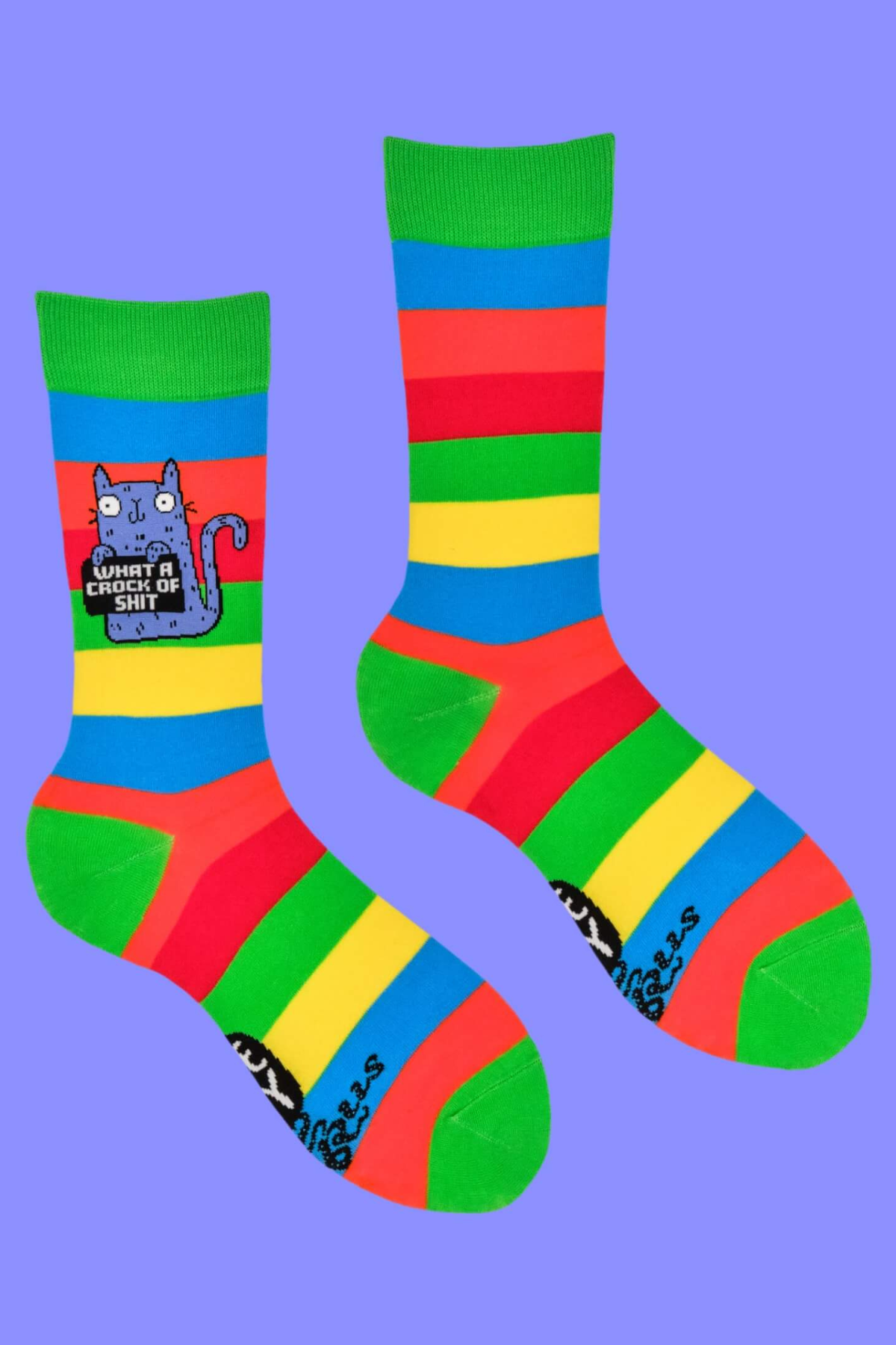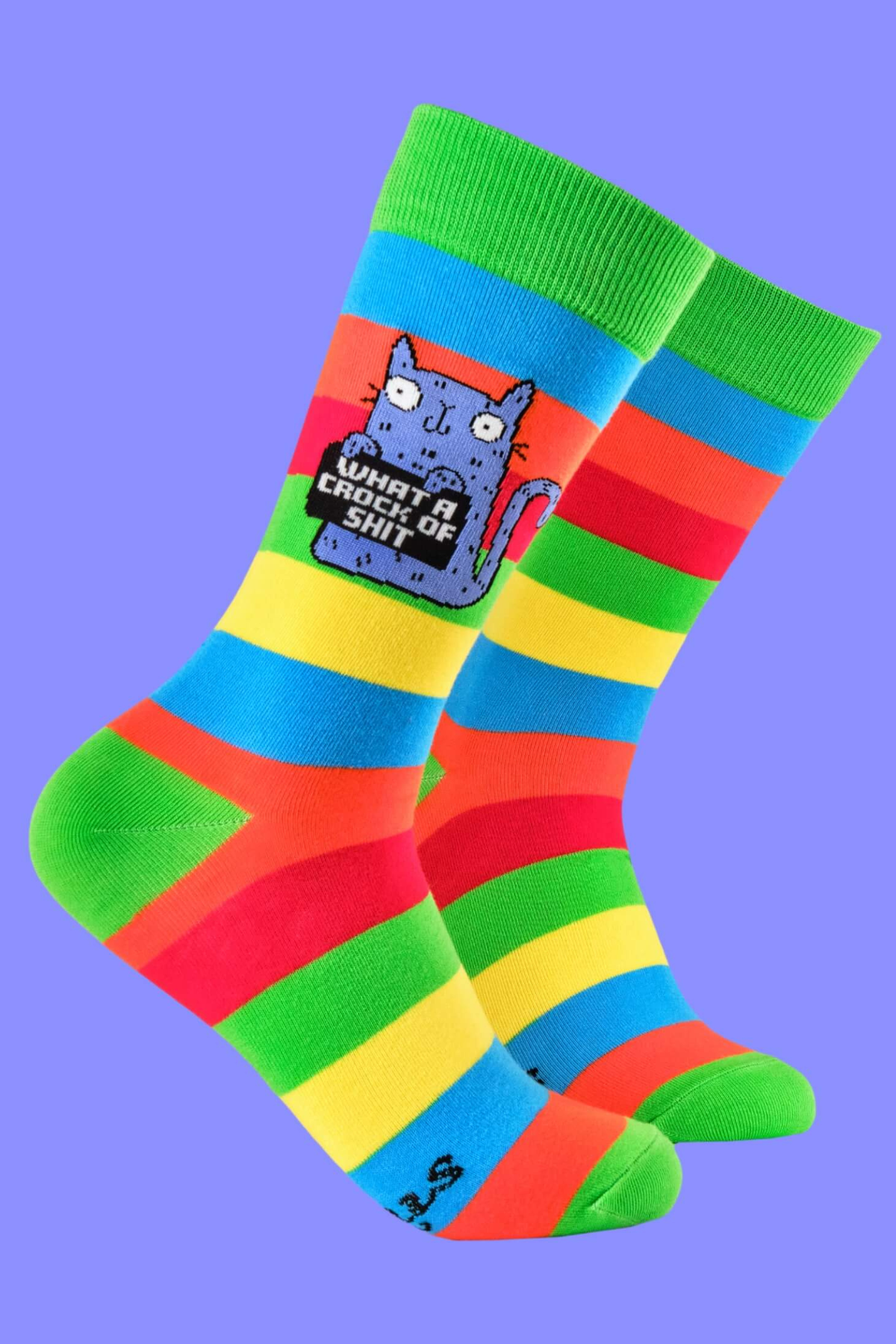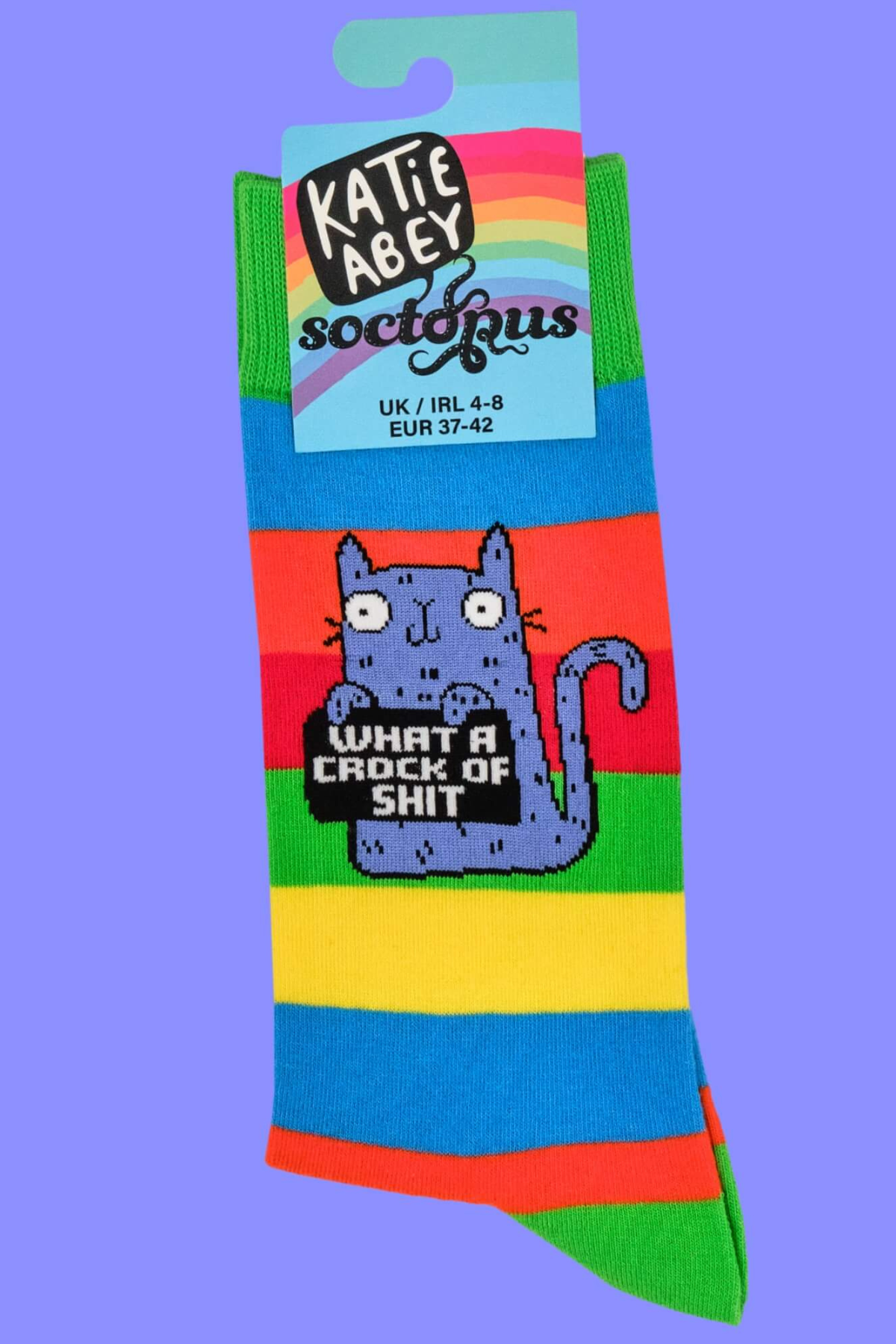 Disse “What a Crock of Sh*t”-strømper fra Katie Abey x Soctopus leverer den perfekte kombination af fræk humor, stærke regnbuestriber og en ikonisk blå kat med verdens mest opgivende blik.