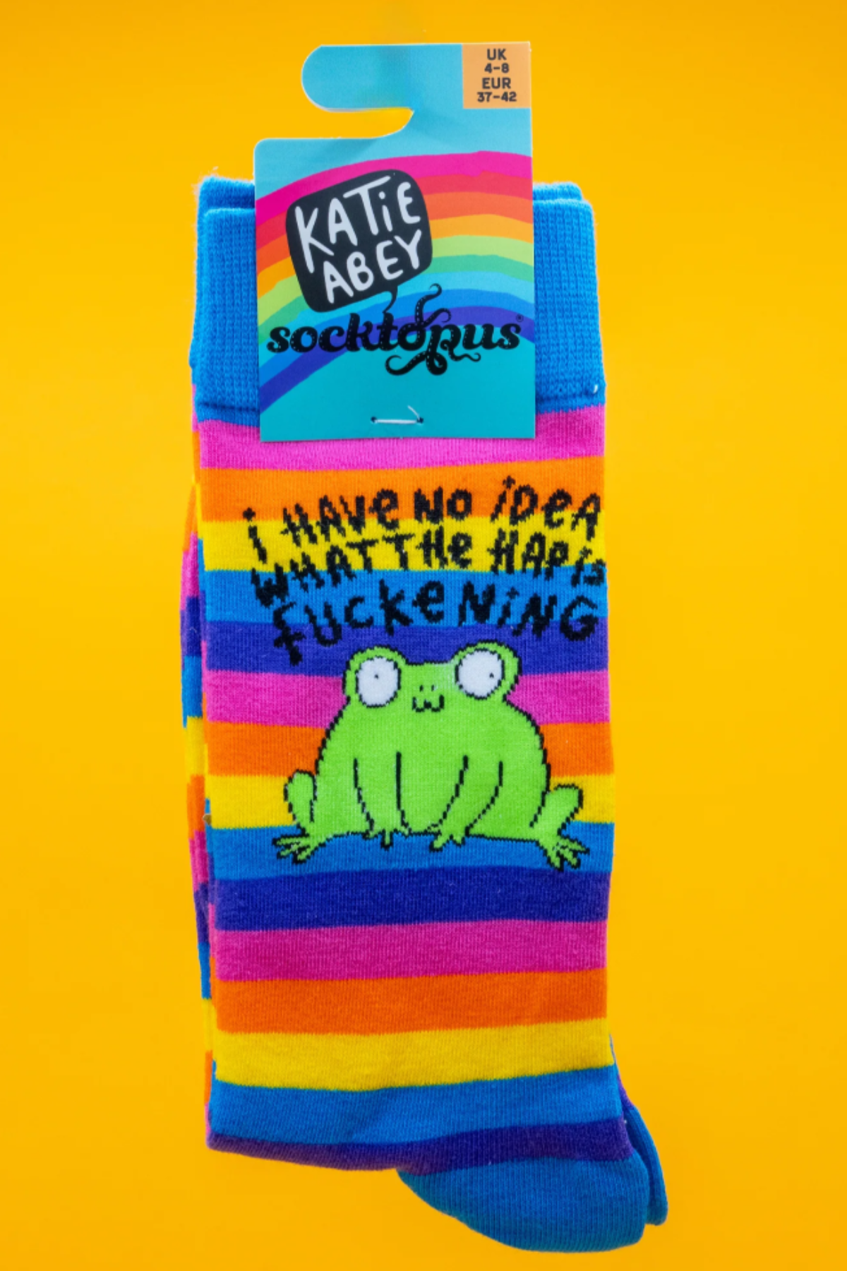 Kært barn har mange navne:: Katie Abey strømper, frog socks, frø strømper, sjove strømper, statement strømper, regnbuestrømper, quirky socks, socks with attitude, Socktopus socks, gaveidé strømper, unisex strømper.
