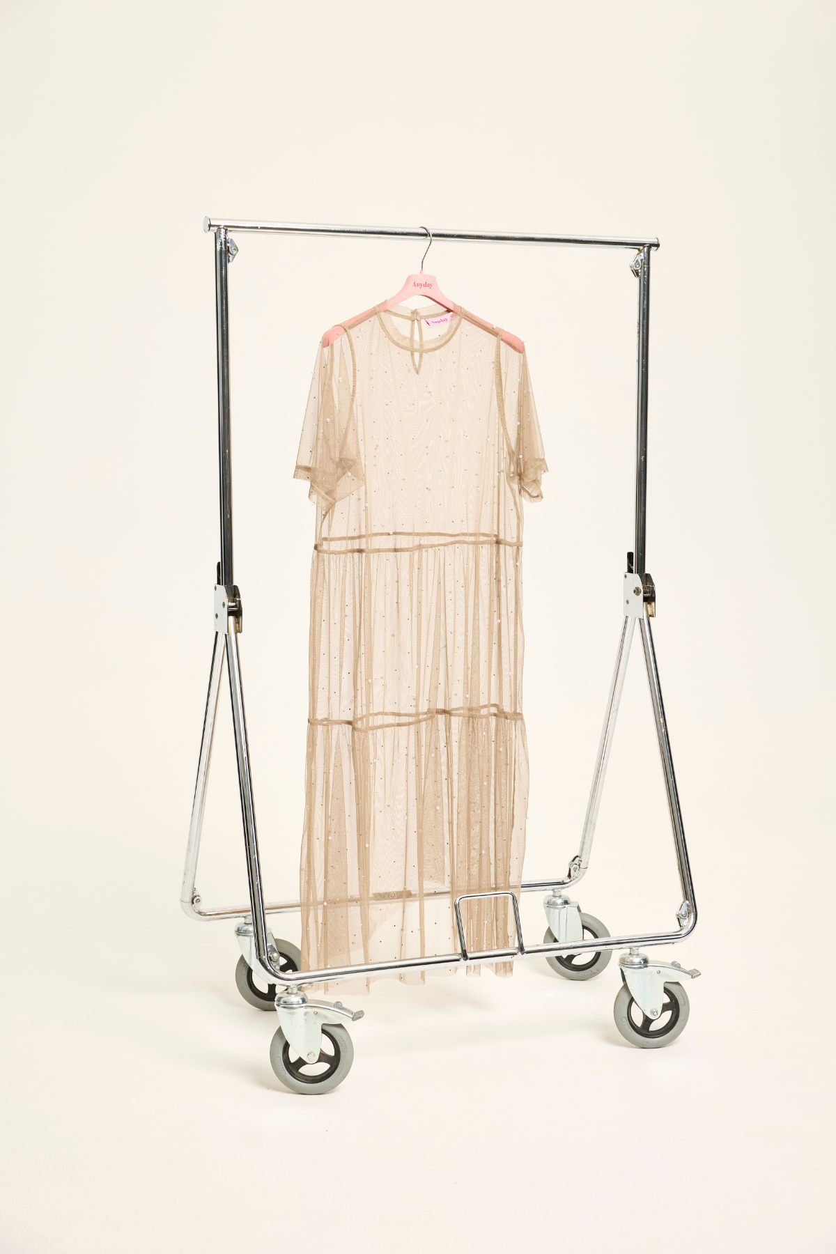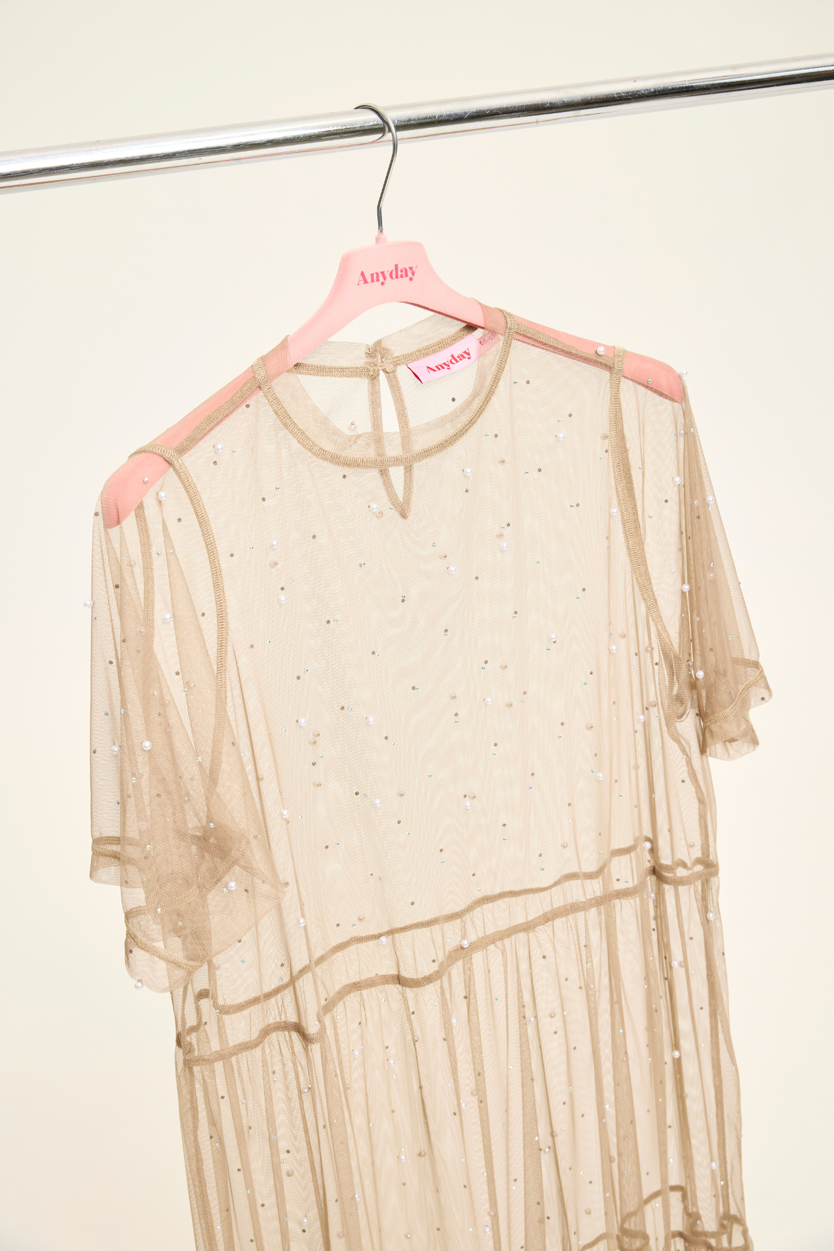 Ligera Mesh Kjole m/ Perler og Simili Sten Nude/Mørk Beige