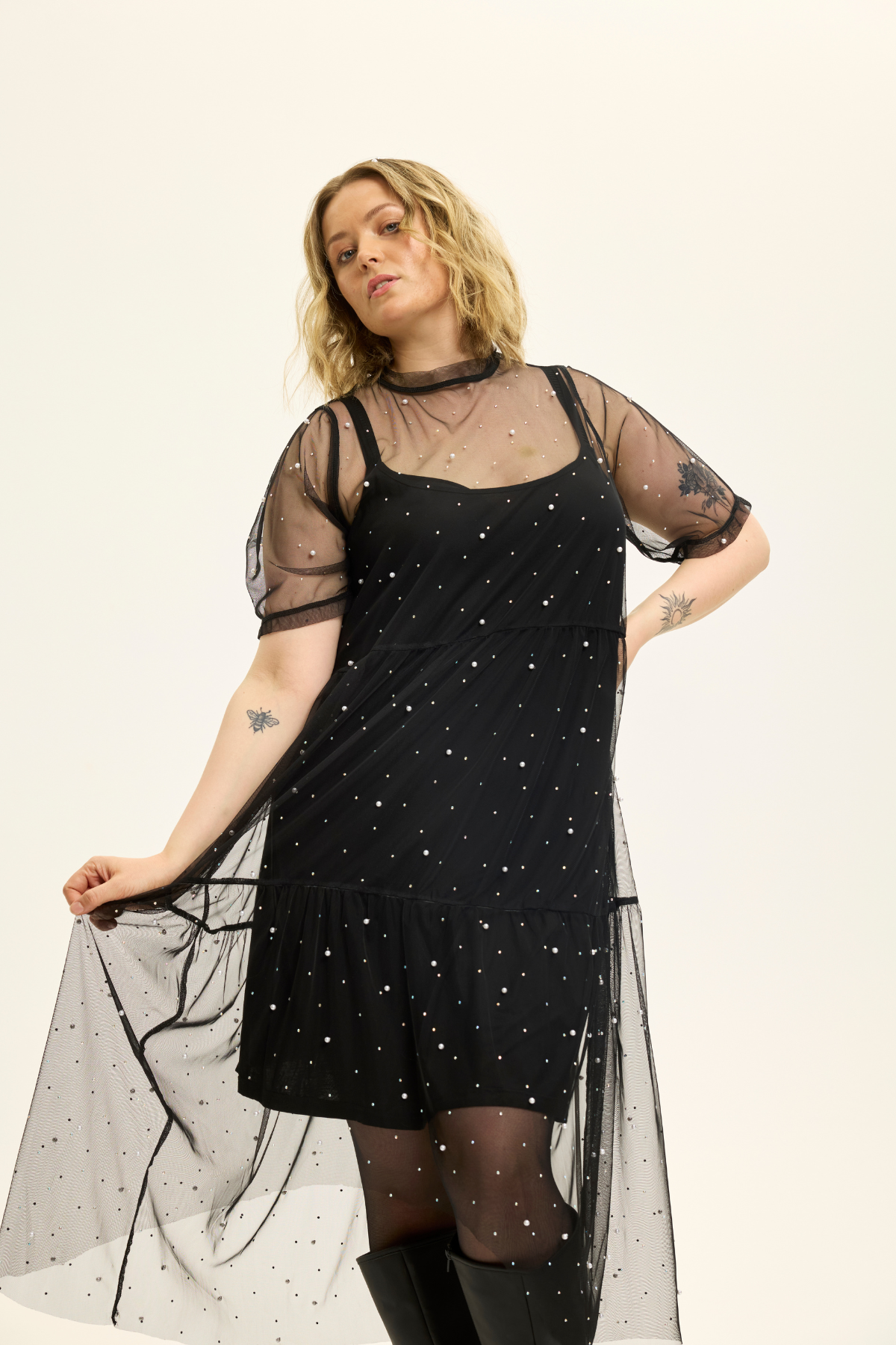Ligera Mesh Kjole m/ Perler og Simili Sten Sort