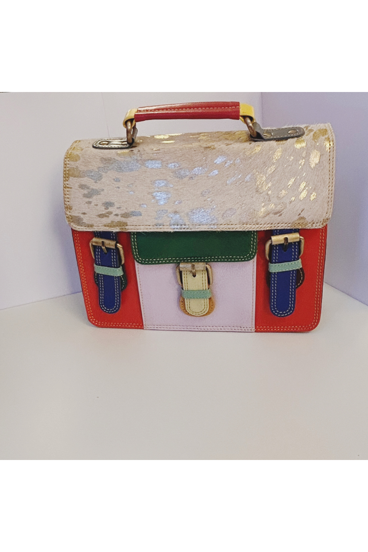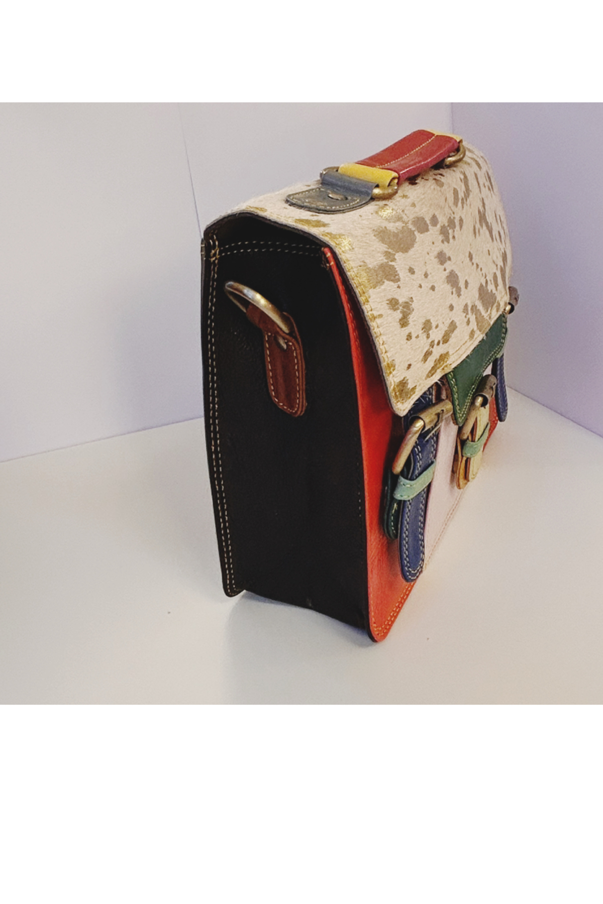 Denne udgave af Akira-satchelen er til dig, der ikke er bange for at skille dig ud. Klappen i hair-on læder er dekoreret med smukke guld- og sølvstænk, der fanger lyset og giver tasken et eksklusivt twist. Kombineret med klare farveblokke i rød, lilla, grøn og blå får du en taske, der emmer af kreativitet og selvtillid.
