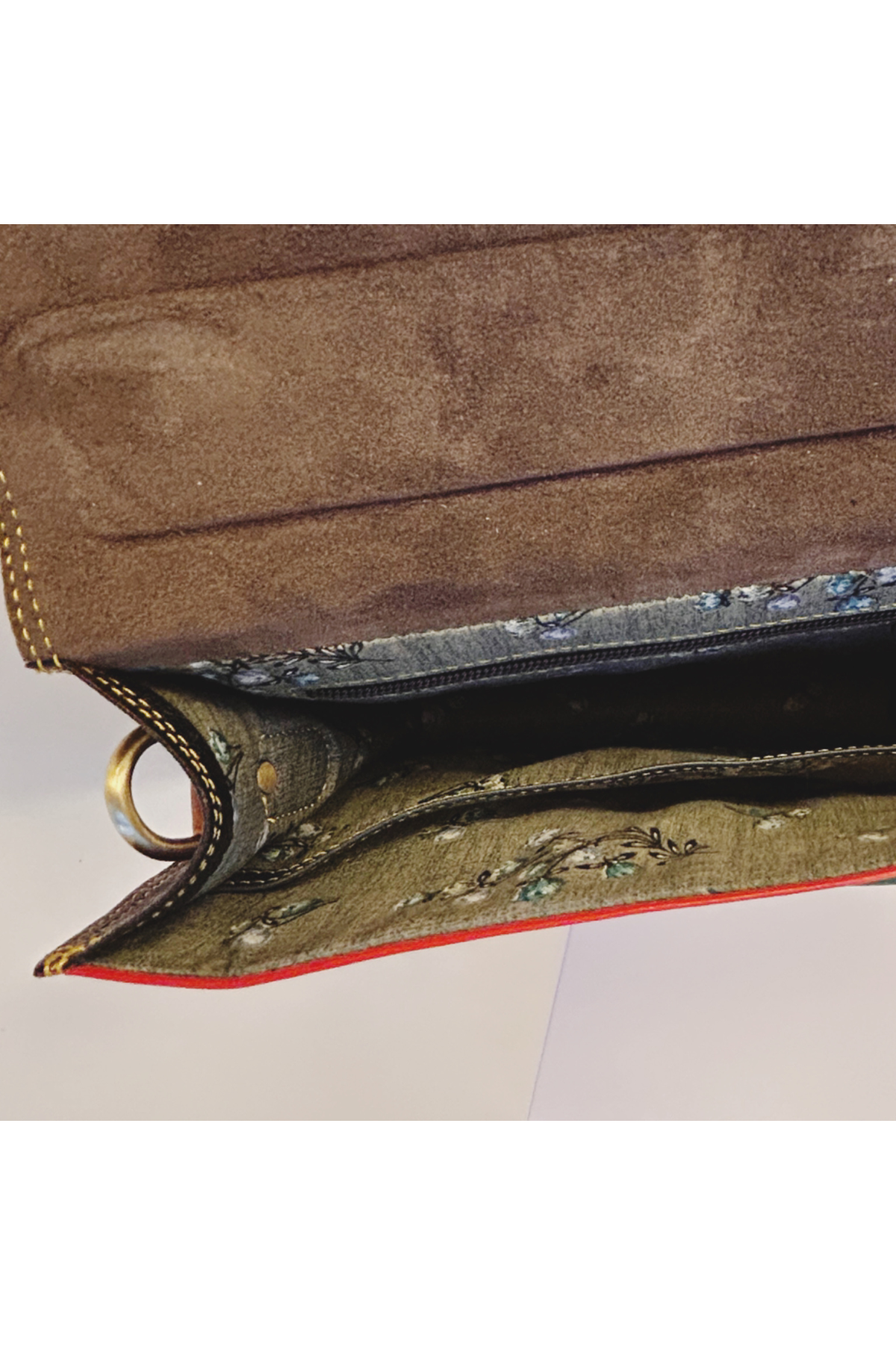 Tasken er håndlavet af genanvendt læder og designet i klassisk satchel-form med tre dekorative spænder på fronten. Spænderne lukkes nemt med magnetfunktion, så du får både vintage-look og praktisk hverdag.