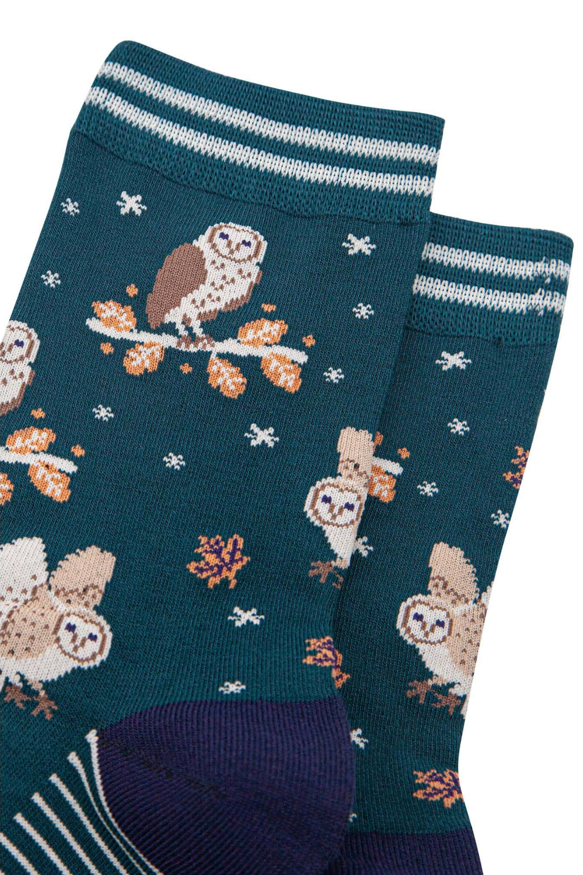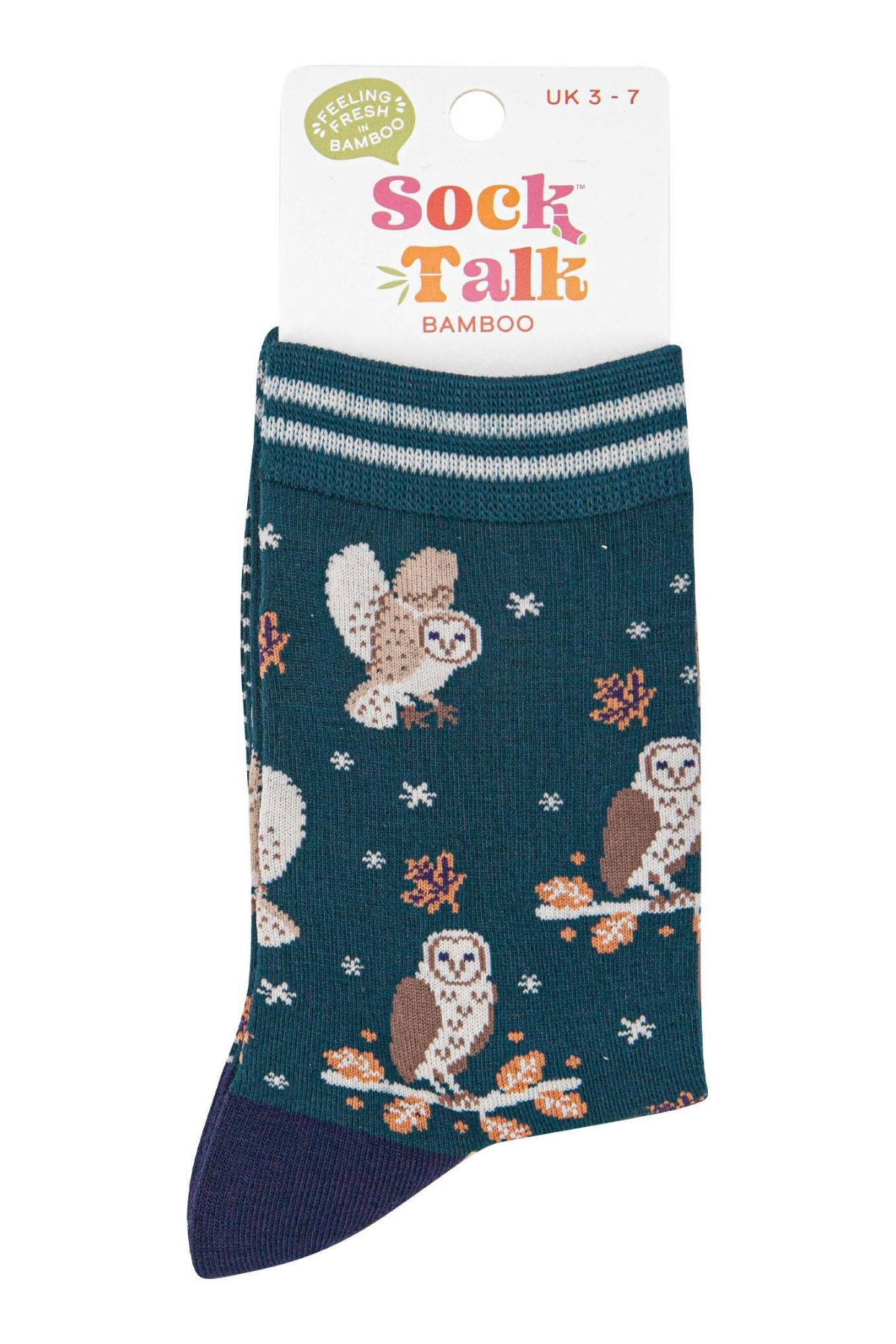 Par Sock Talk bambusstrømper i blågrøn med ladeugler og stribet manchet