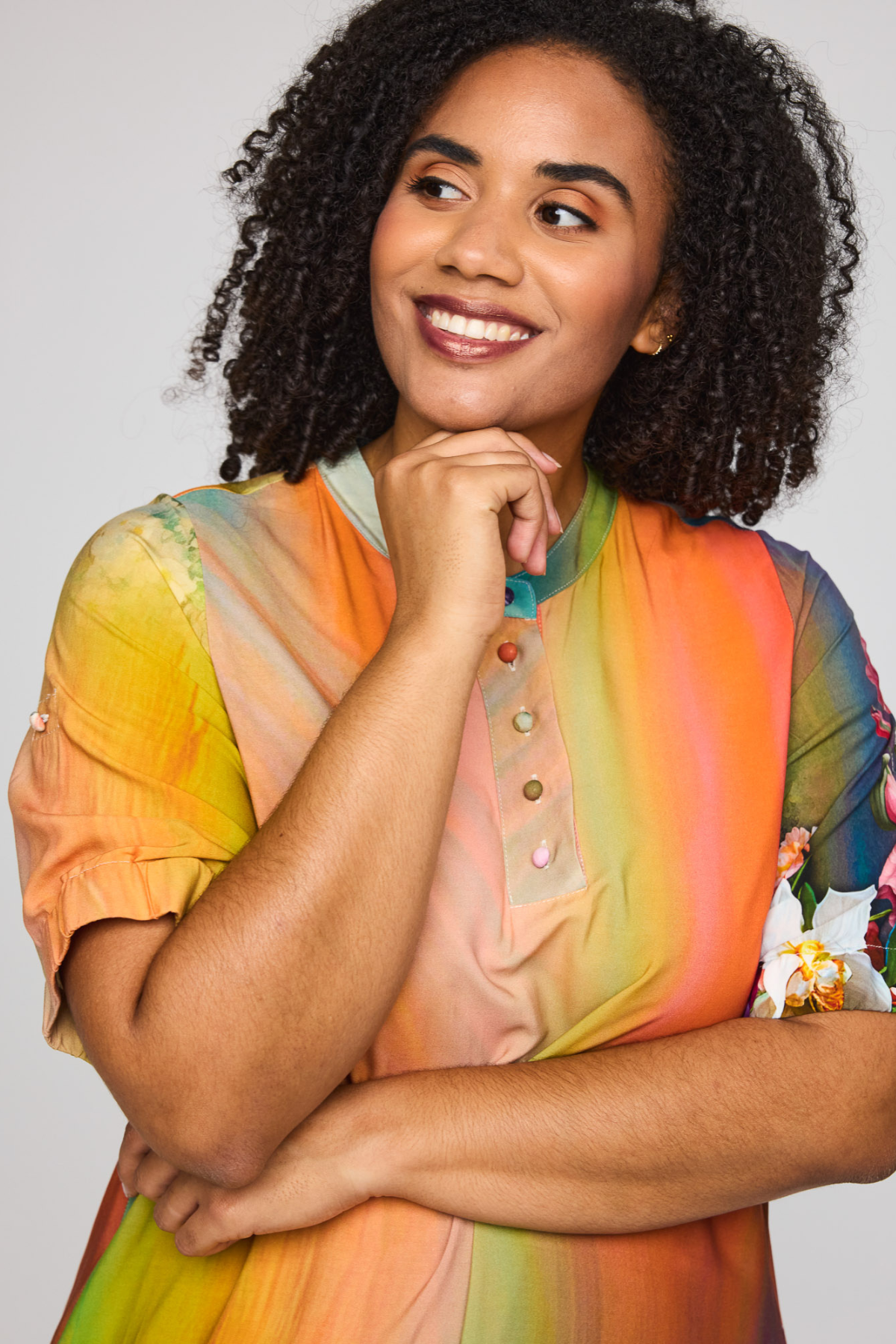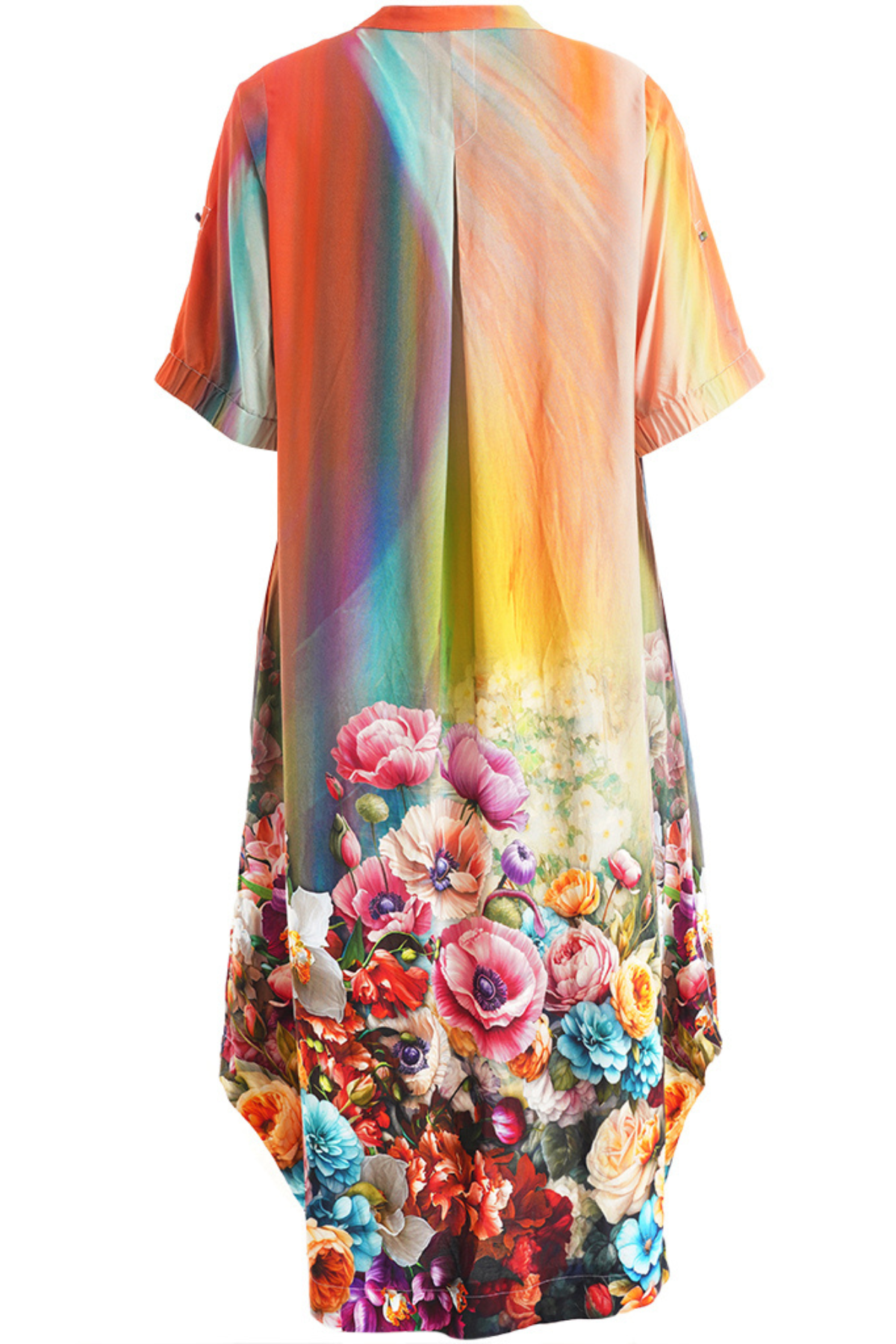 Det kunstneriske farveforløb i varme orange, gyldne, grønne og turkise nuancer smelter sammen med det overdådige blomsterprint nederst og skaber et udtryk, der er både roligt og wow på samme tid. Silhuetten er løs og faldende – den bevæger sig naturligt omkring kroppen og giver dig den der lette, ubesværede fornemmelse, vi elsker hos Happy Fashion.