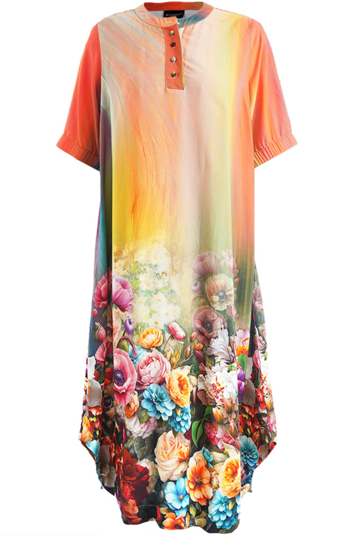 Lang farverig kjole, blomsterkjole, viskosekjole, plus size kjole, STUDIO kjole, sommerkjole med print, løs midi kjole, kjole med korte ærmer, kunstnerisk print kjole, farvegradient kjole – Vi skriver det hele, så du kan finde den, uanset hvad du søger efter.