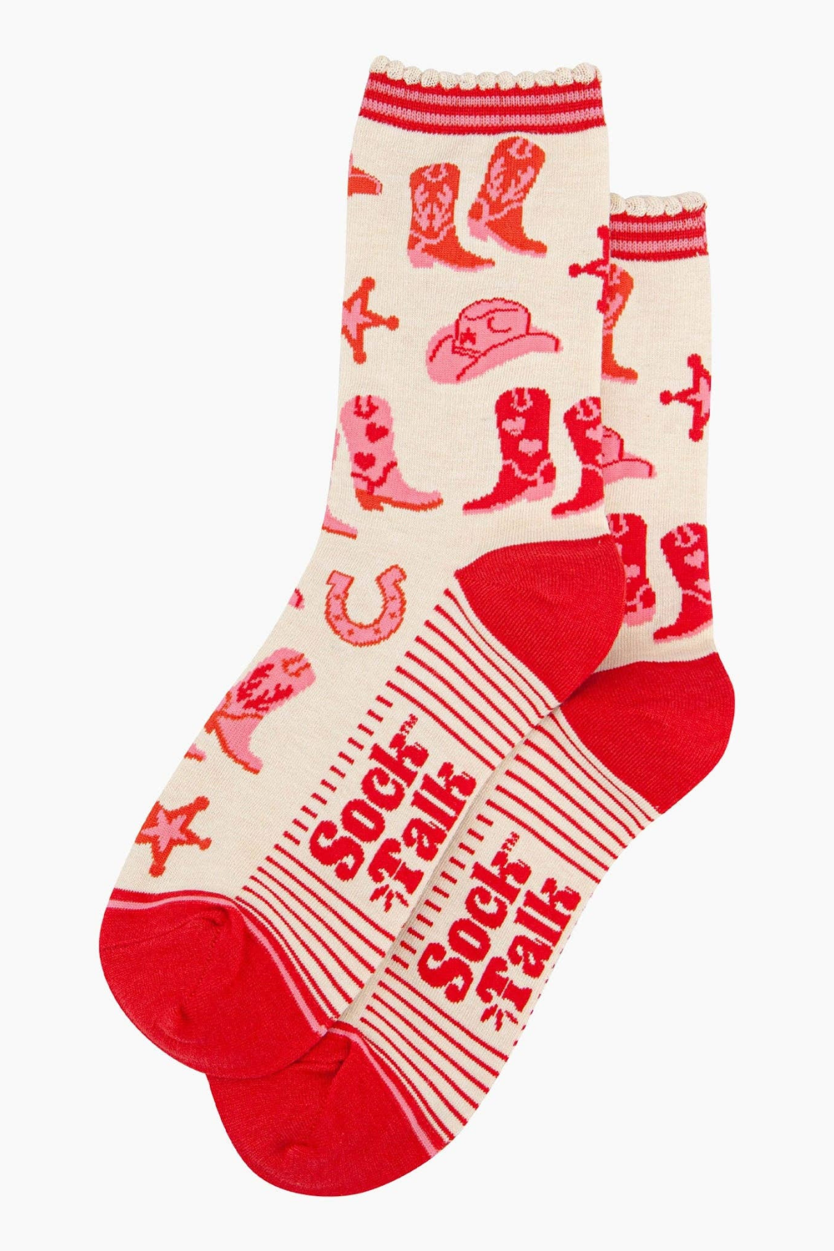 Sæt lidt western-vibes på hverdagen med de sjove Cowgirl Boots bambusstrømper fra Sock Talk! 🤩 Disse strømper emmer af cowgirl-attitude med print af støvler, hatte, hestesko og sherifstjerner – alt sammen i de fineste pink og røde nuancer.