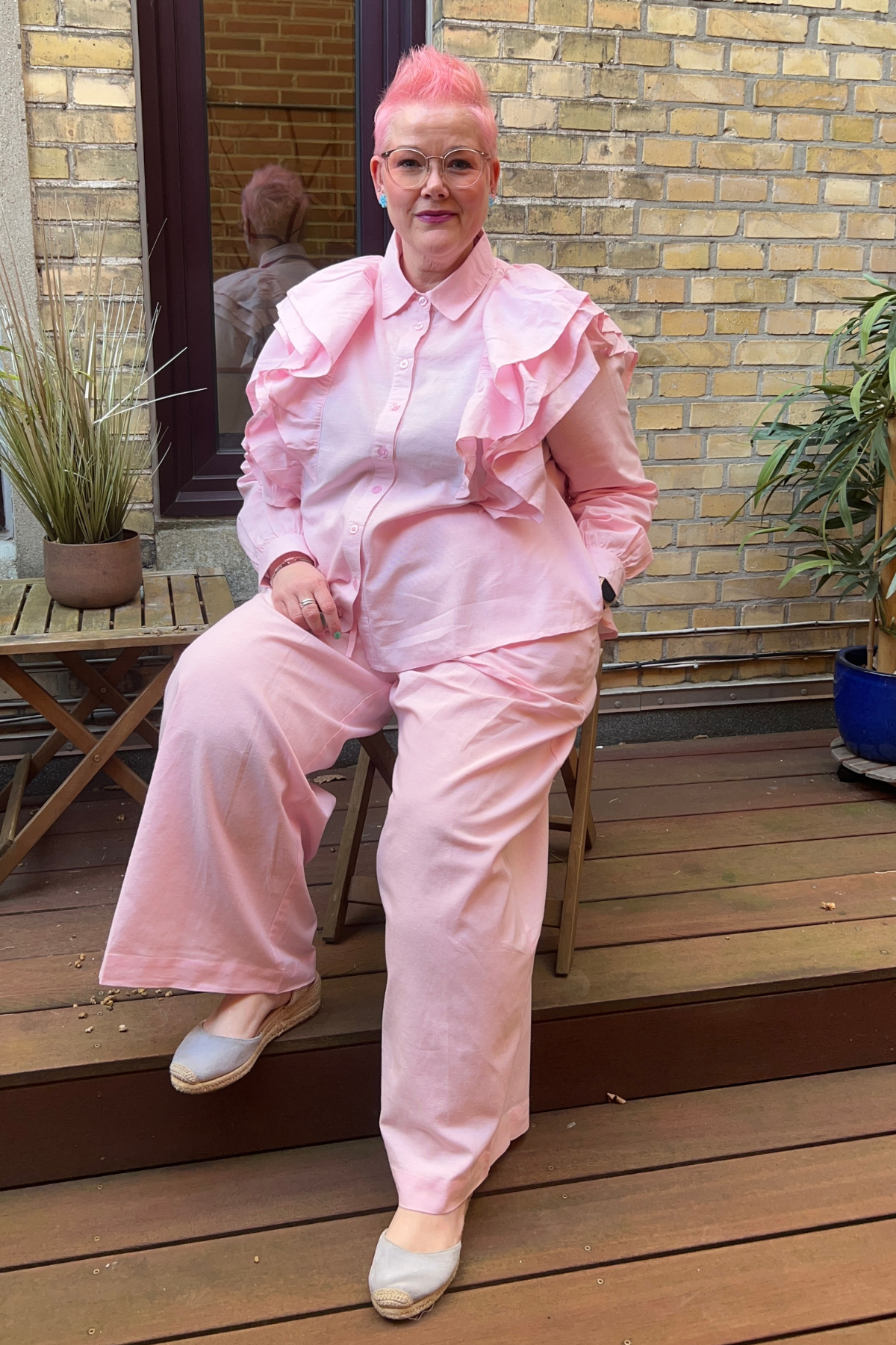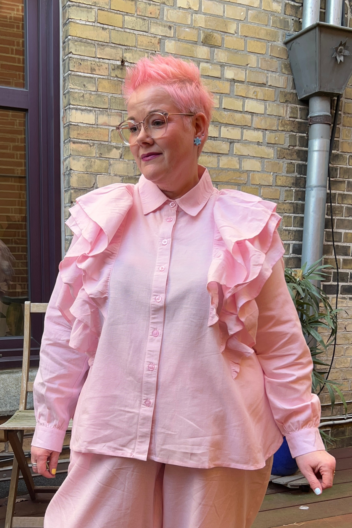 Blusen er designet med klassisk skjortekrave, gennemgående knaplukning og lange ærmer, mens de store flæsedetaljer foran skaber blikfang og tilfører masser af liv til stylen. Den lyserøde farve giver et blødt og friskt udtryk, som både kan styles sødt, cool og festligt – alt efter humør og anledning.