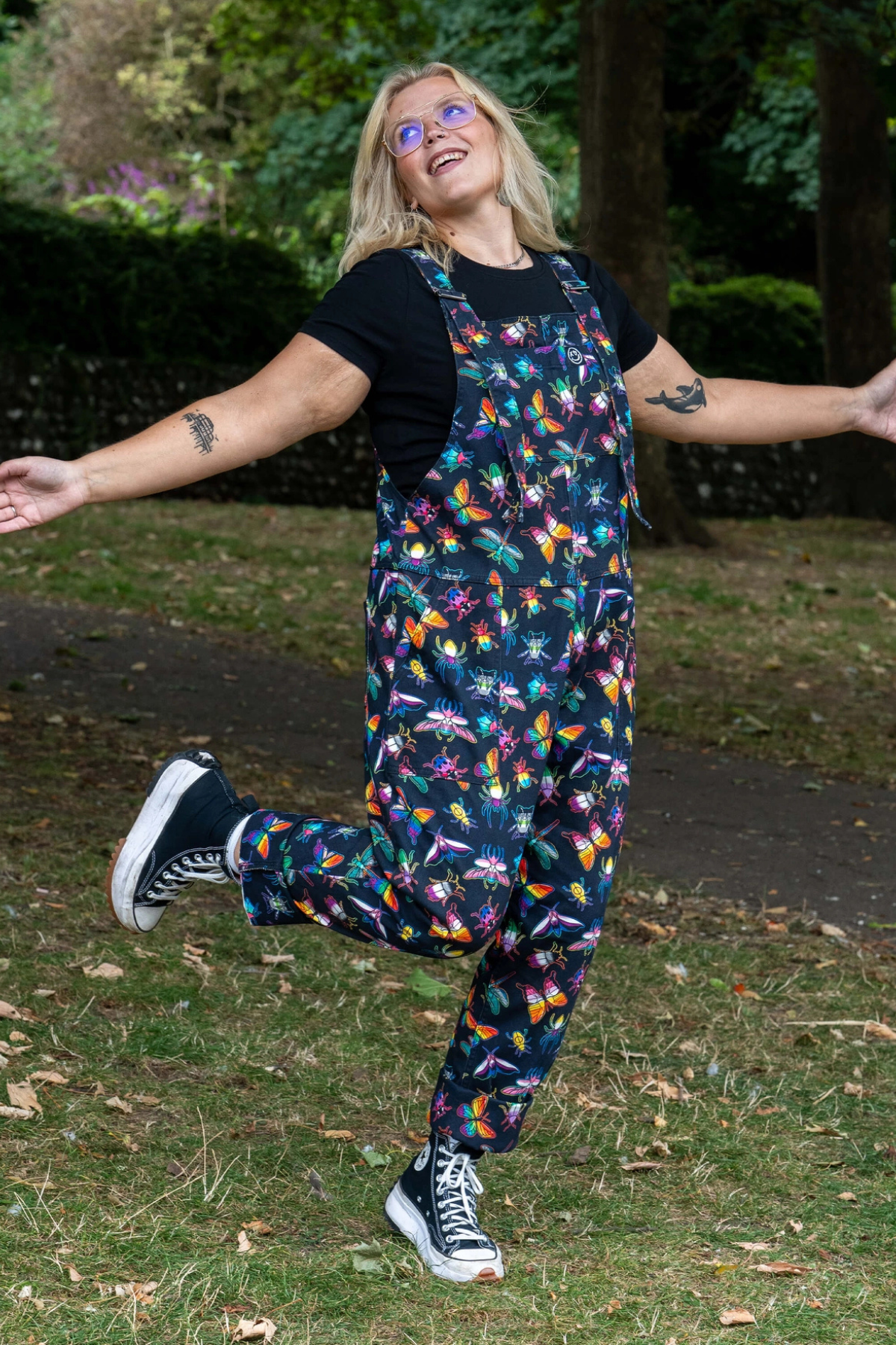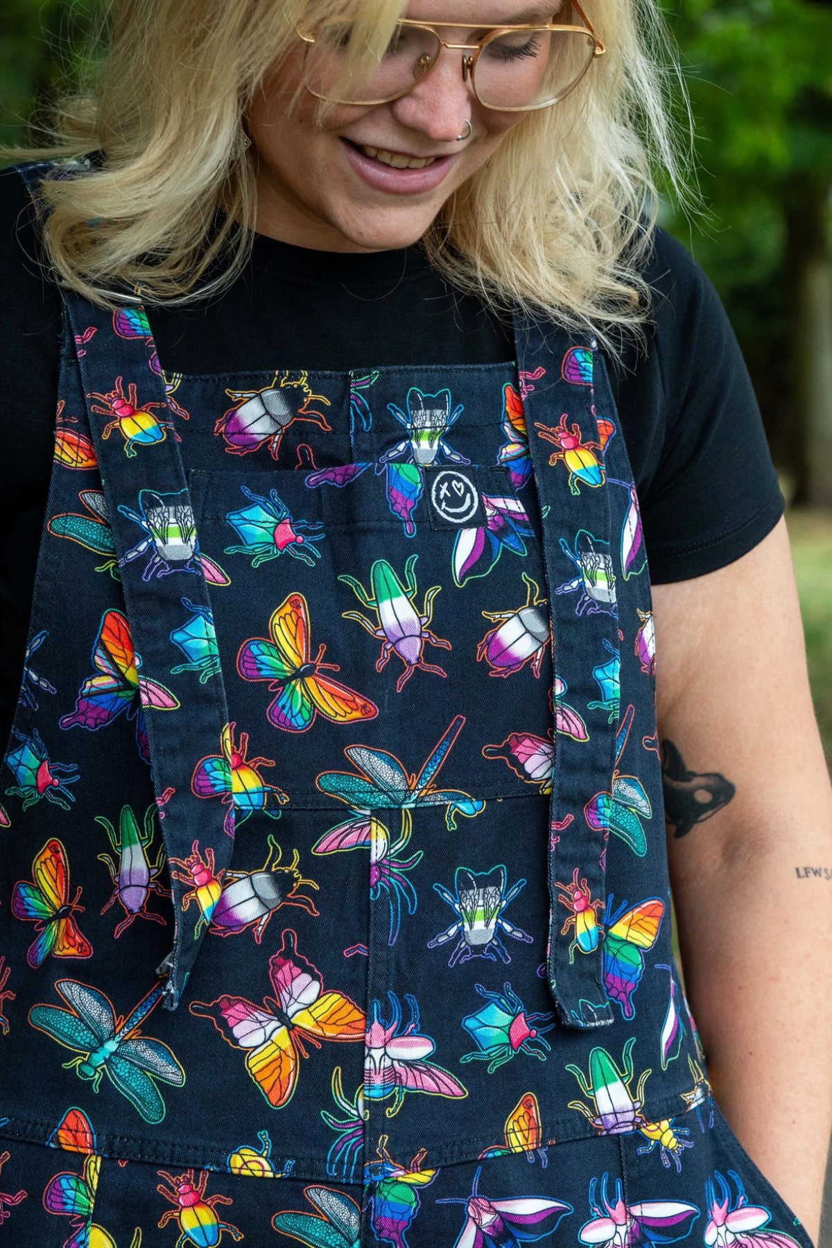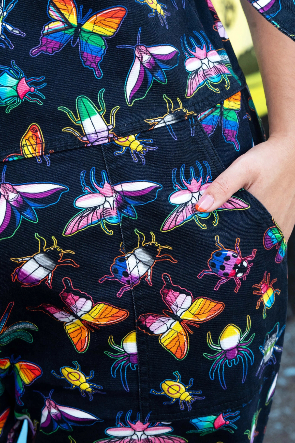 Disse dungarees er fyldt med regnbuefarvede biller, sommerfugle, guldsmede og små finurlige kryb – et legende print designet af Weirdling Designs, der gør hvert eneste skridt lidt sjovere.