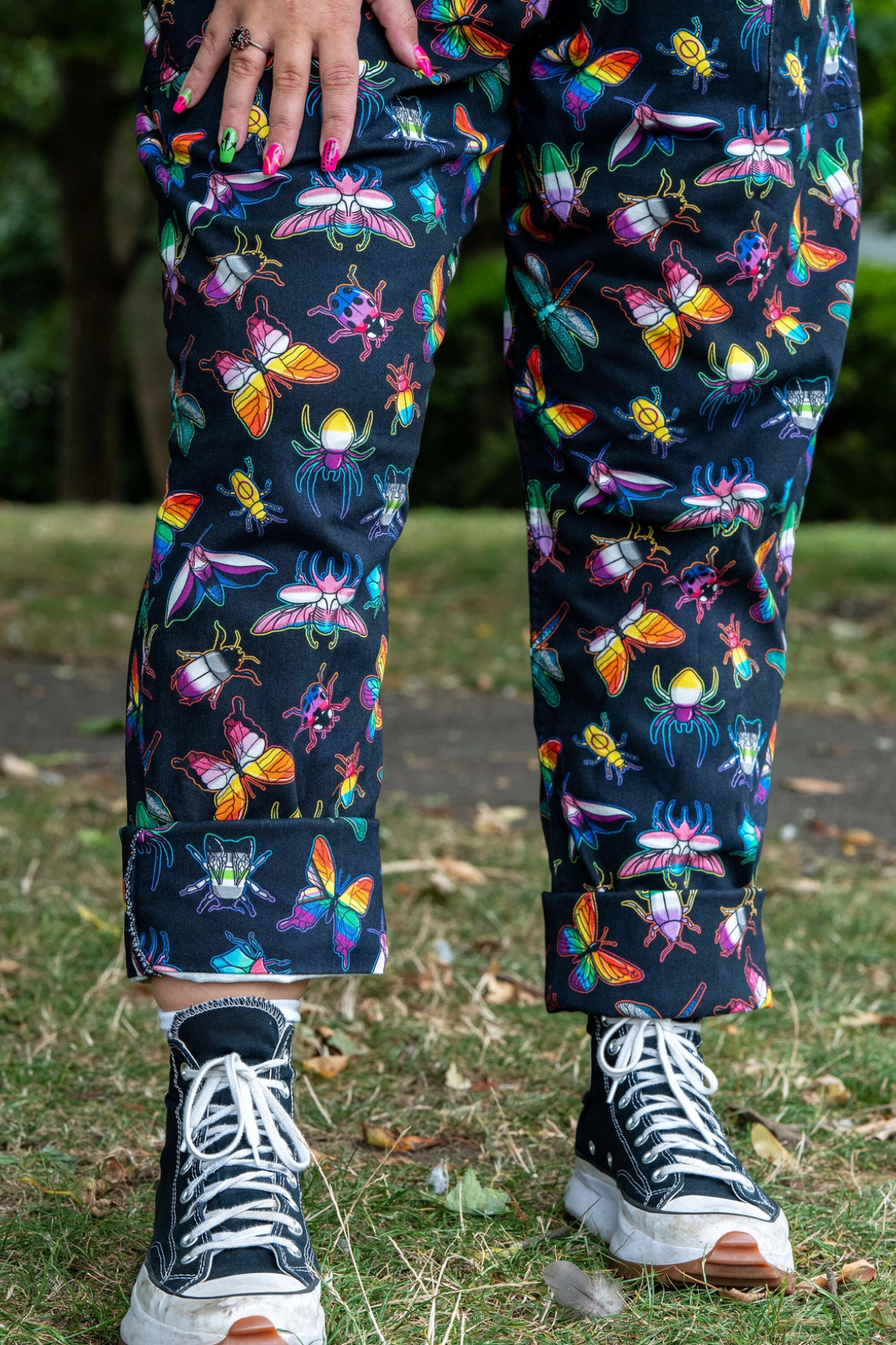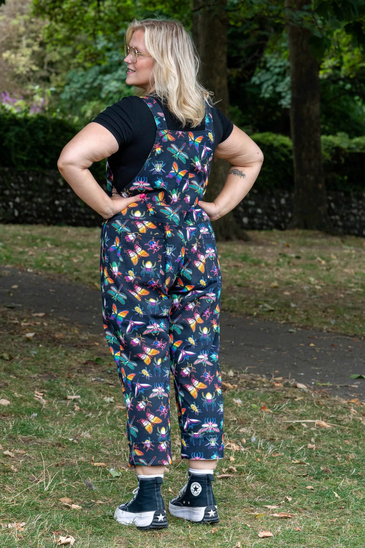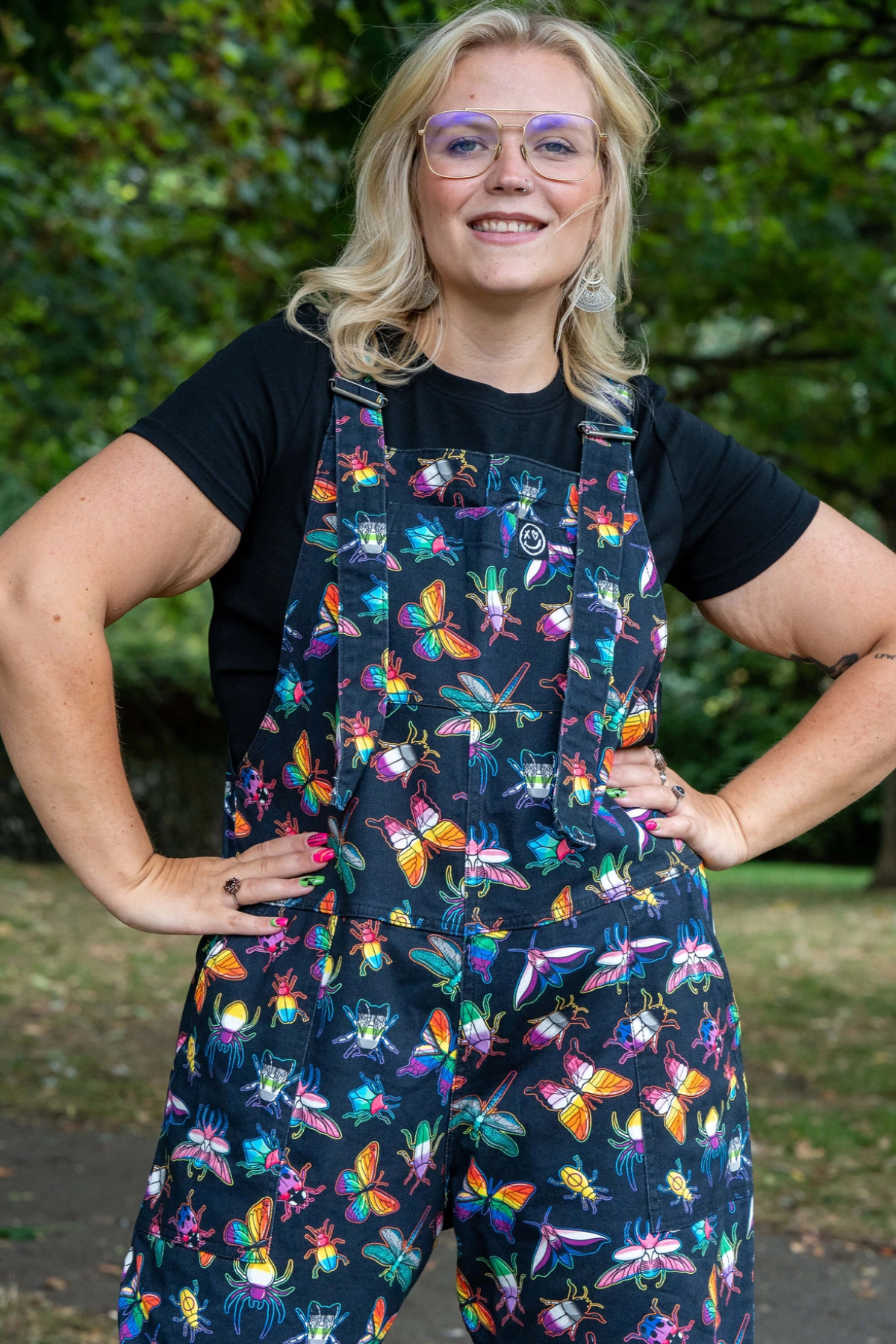 Disse dungarees er fyldt med regnbuefarvede biller, sommerfugle, guldsmede og små finurlige kryb – et legende print designet af Weirdling Designs, der gør hvert eneste skridt lidt sjovere.