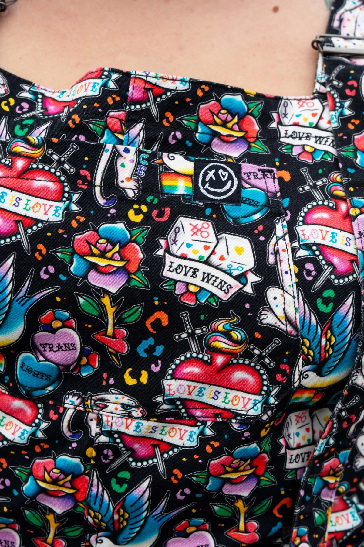 Fyldt med rainbow ink, klassiske tattoo-motiver, hjerter, svaler, blomster og “Love Wins”-budskaber – et print der skriger selvudtryk, fællesskab og frihed.