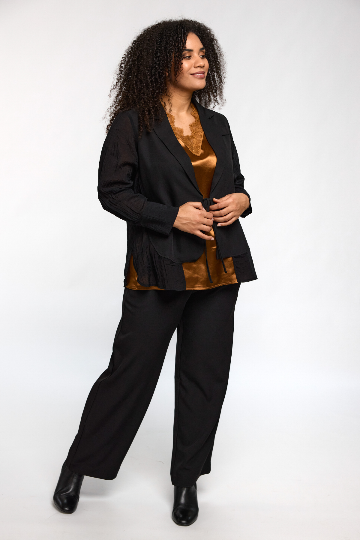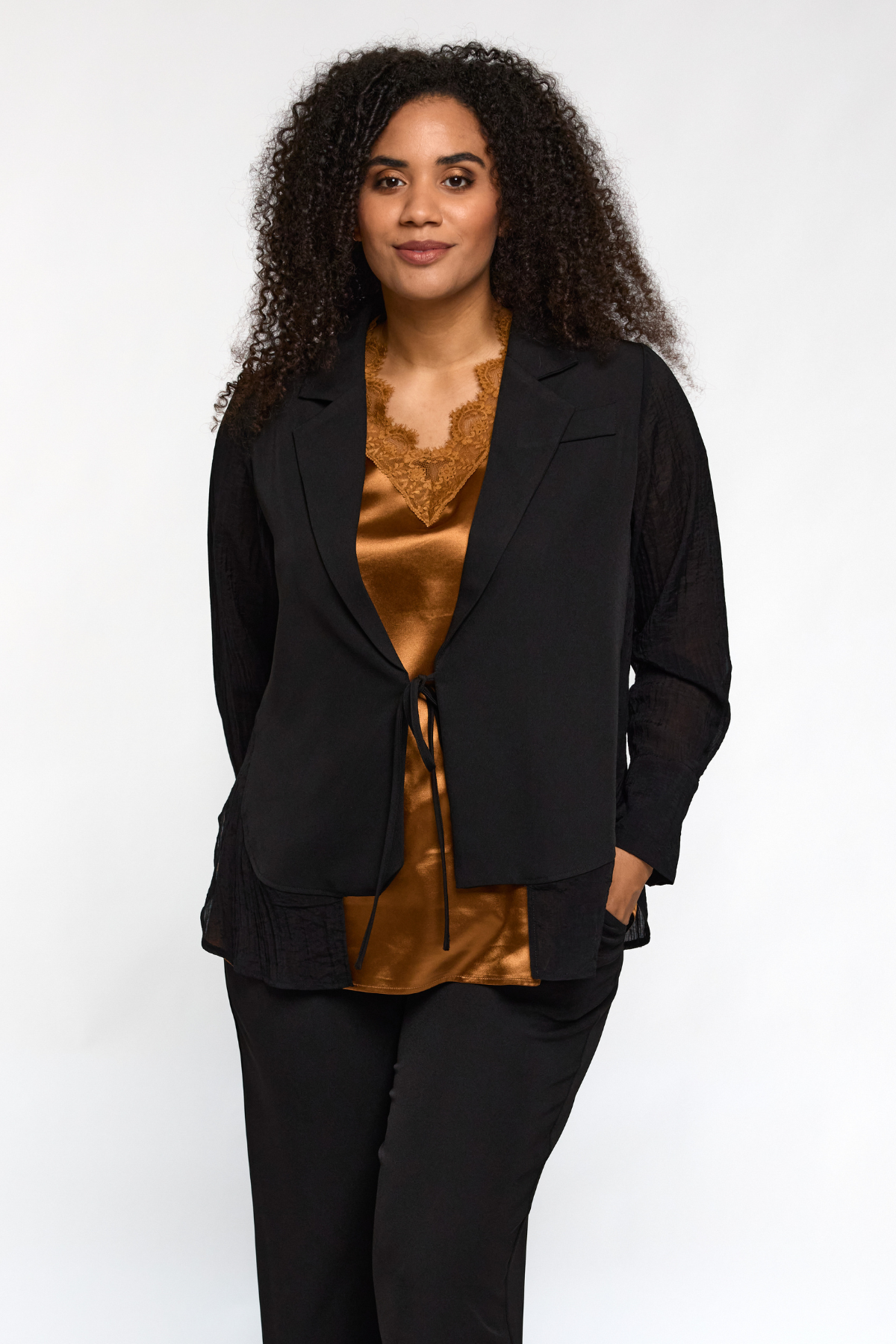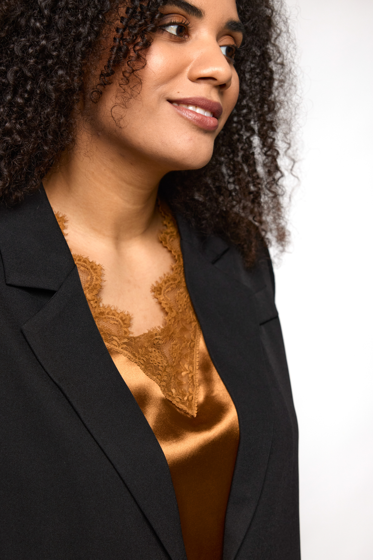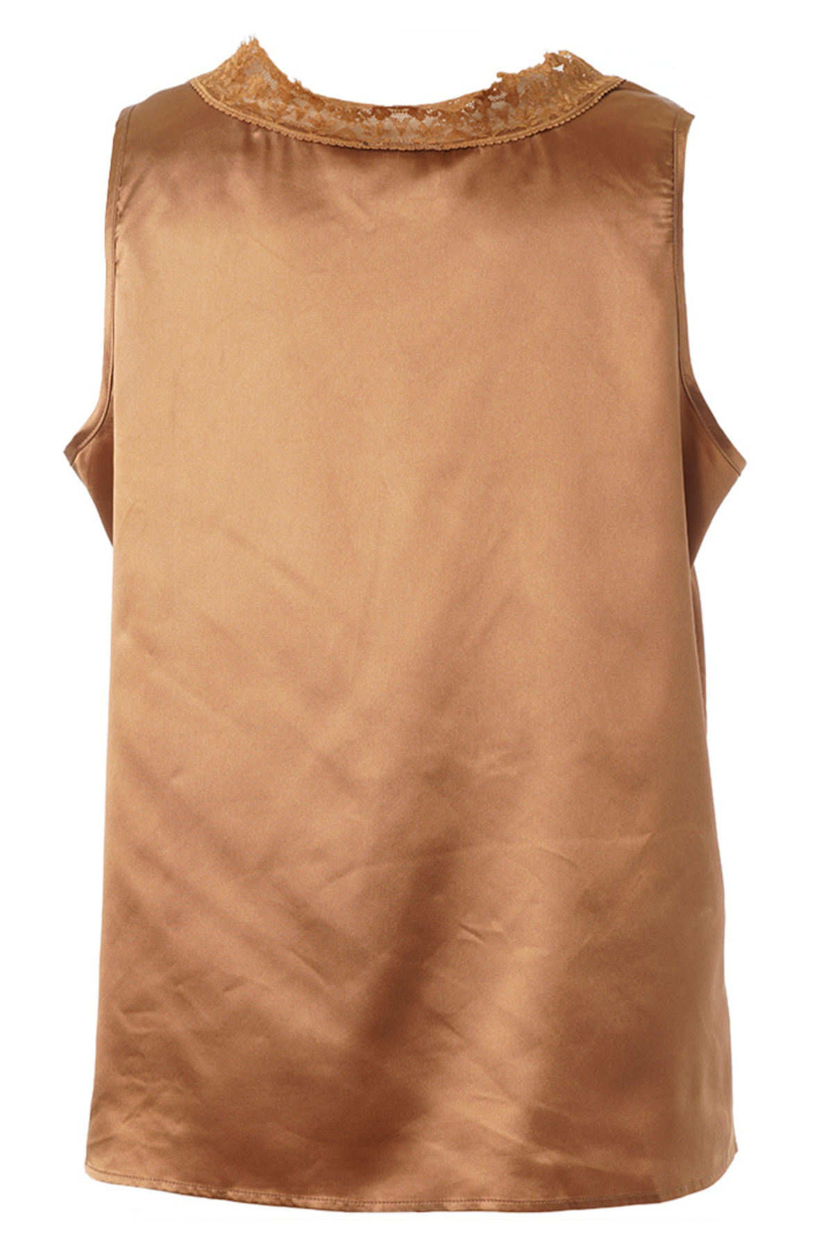 Ingrid Top i den smukkeste kobberfarve kombinerer luksuriøs satin-glans med et feminint touch fra den fine blondekant. Den ærmeløse pasform og V-udskæringen giver et let og elegant udtryk, der både kan styles til hverdagsbrug under en blazer – eller til festlige anledninger, hvor du gerne vil tilføje lidt gylden glød til looket.