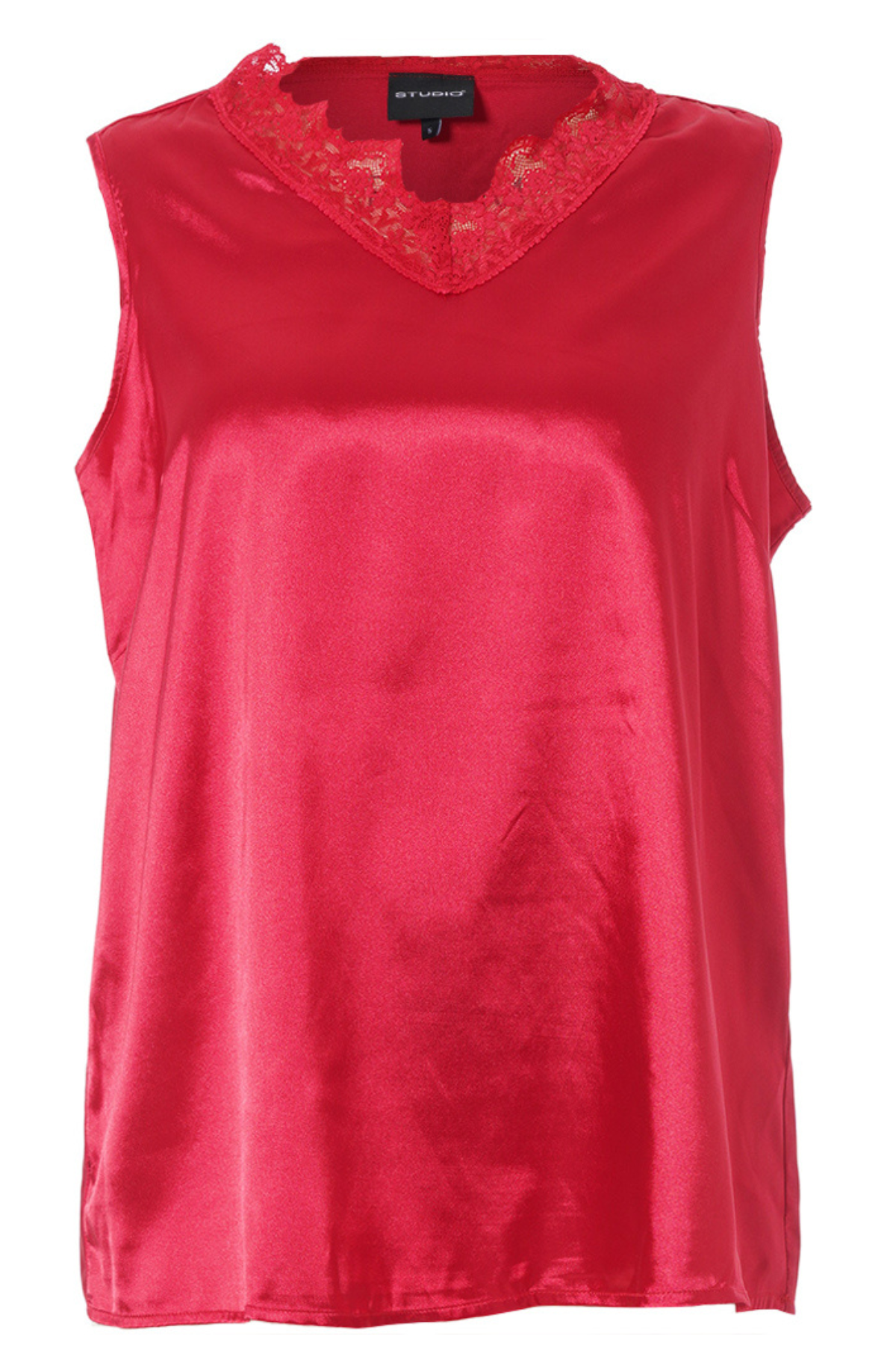 Denne røde udgave af den populære Ingrid Top fra STUDIO kombinerer et glansfuldt satinlook med en feminin blondekant ved V-udskæringen. Den ærmeløse pasform og det elegante fald gør den til et oplagt valg, når outfittet skal have lidt ekstra power og farve – perfekt både til kontoret med en blazer eller til fest med smykker og høje hæle.