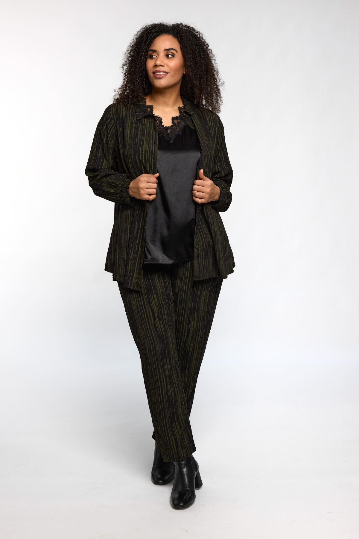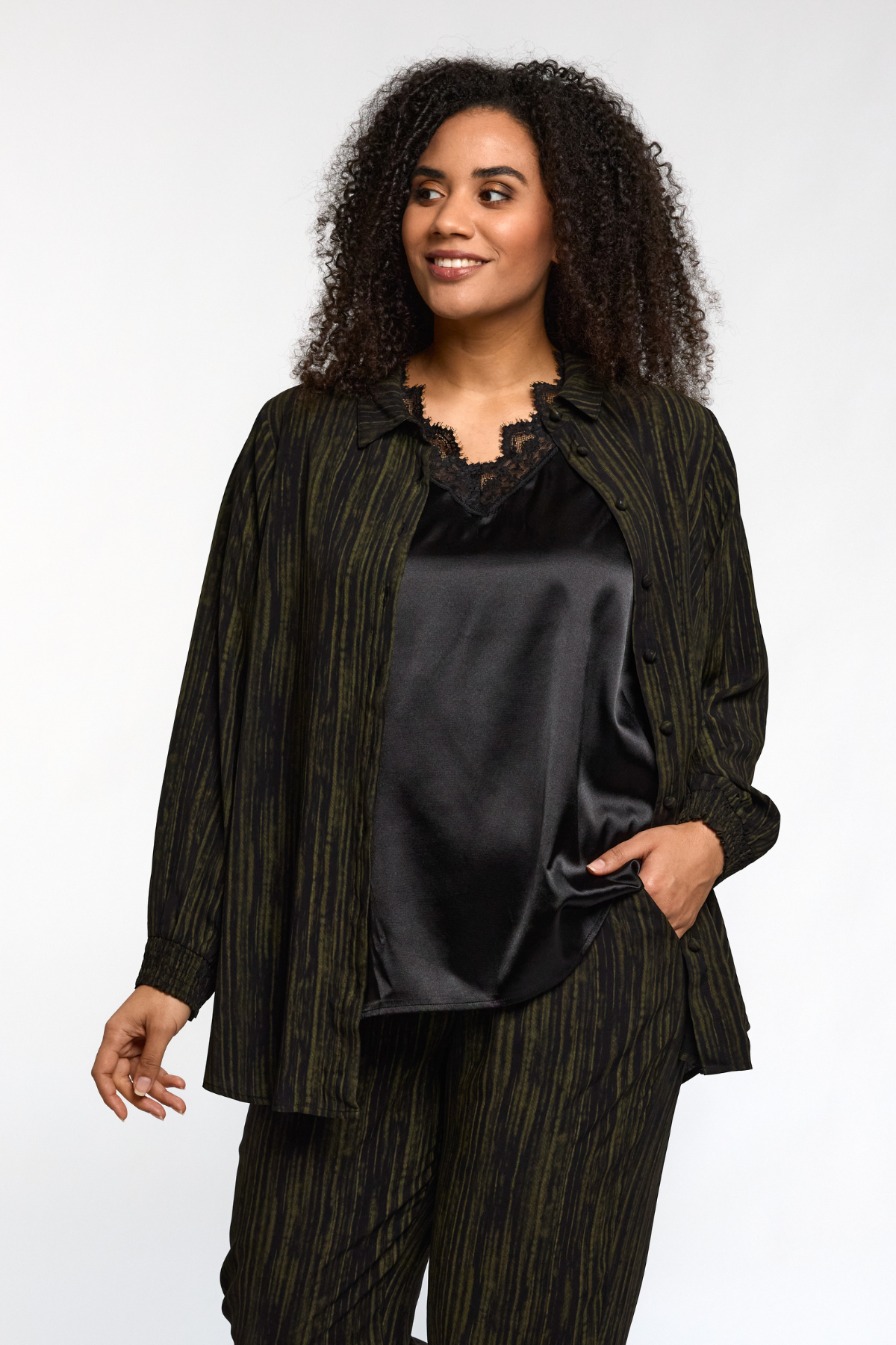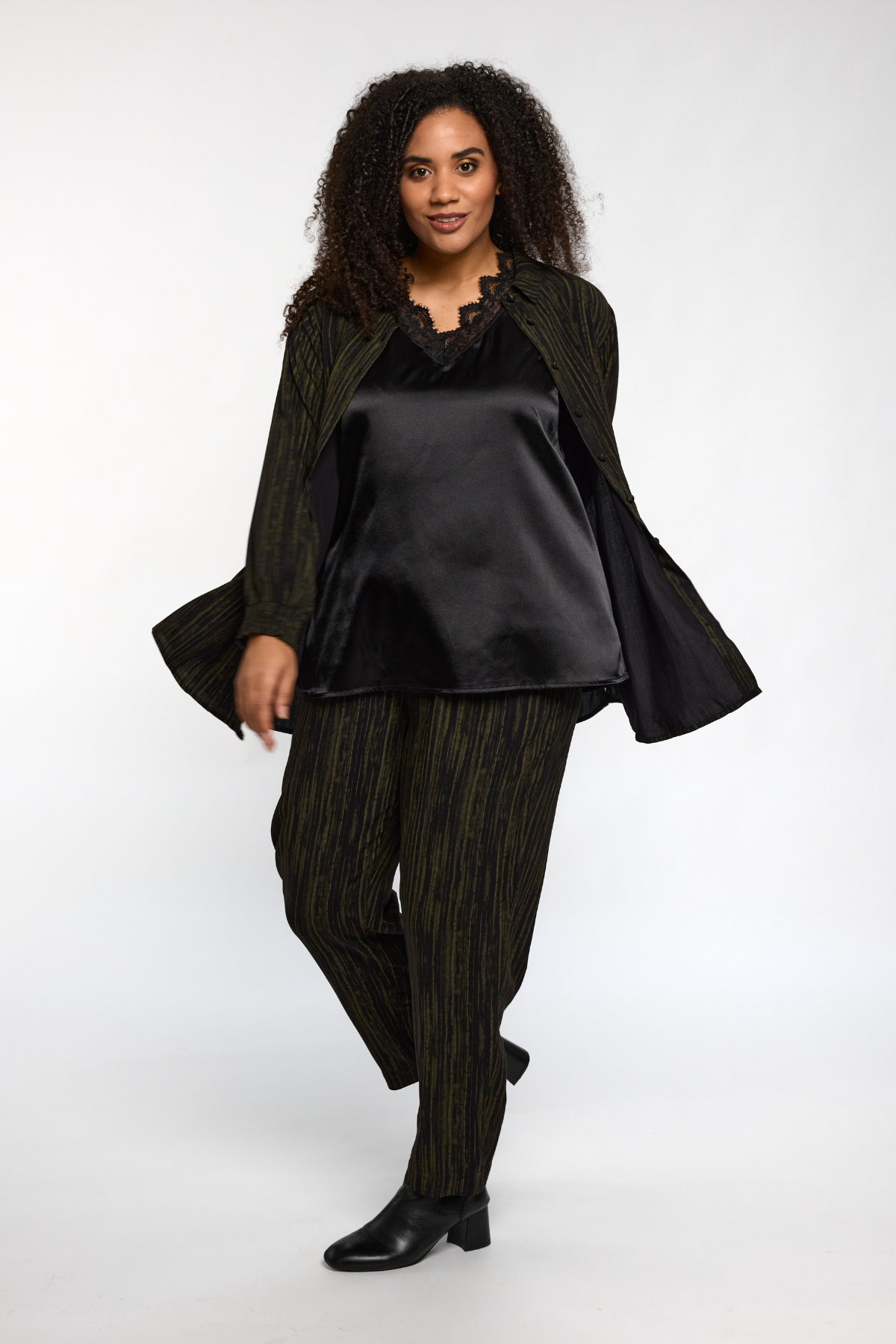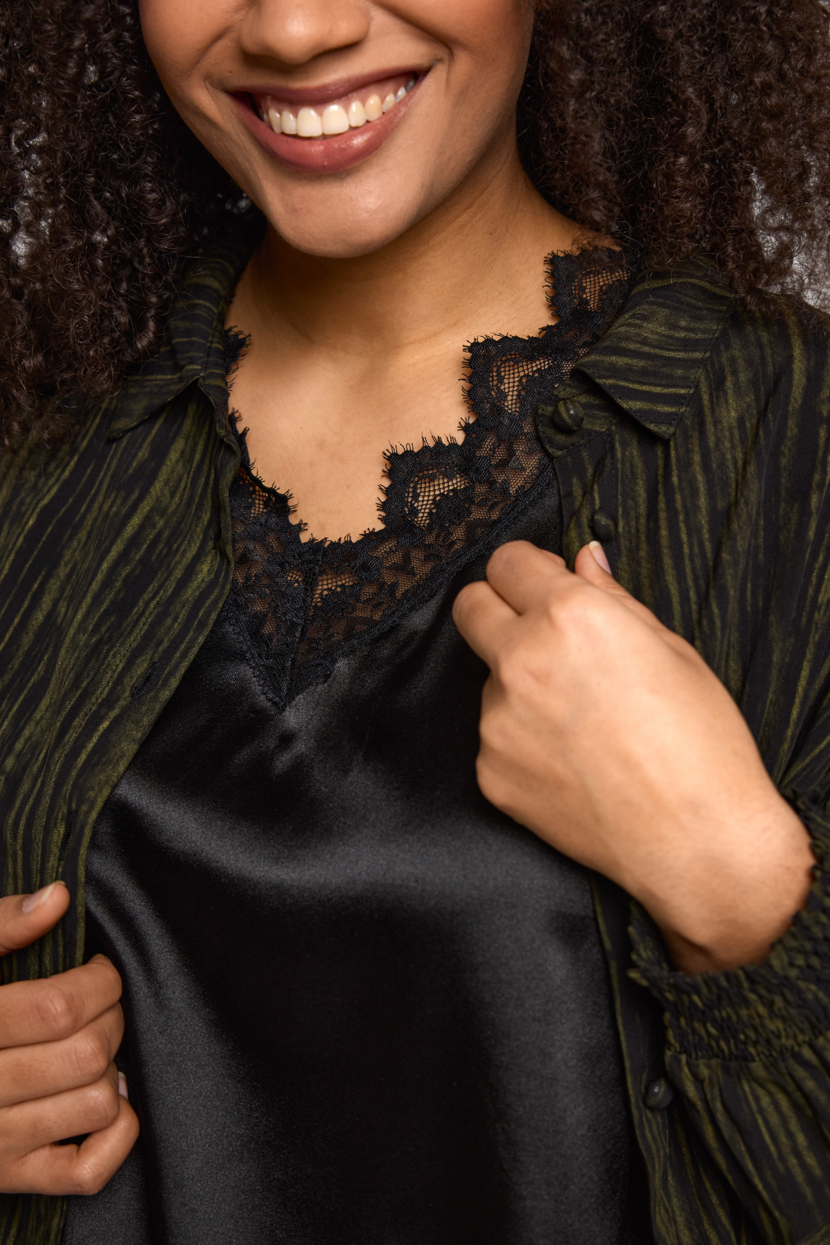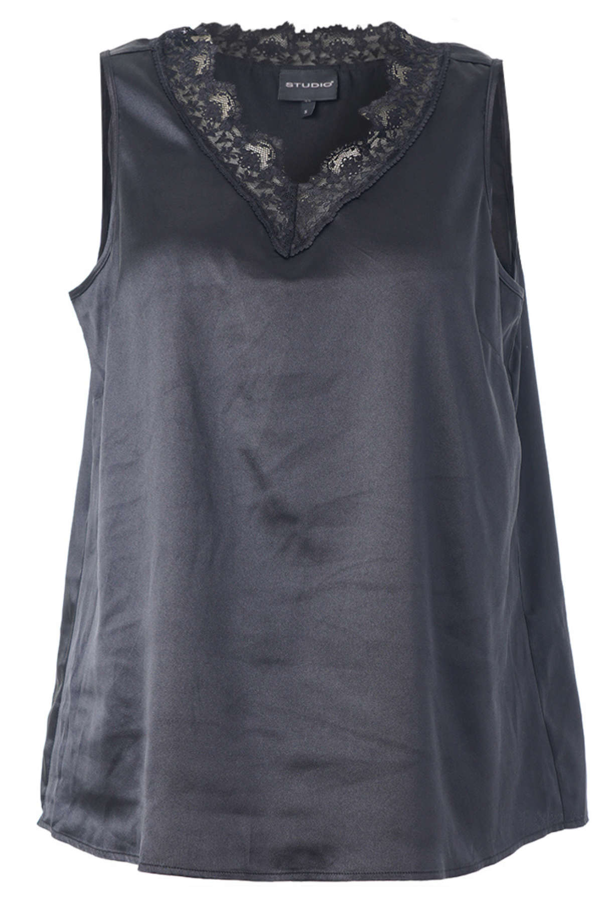 Denne smukke top fra STUDIO er fremstillet i glansfuldt satinlook, der føles lige så godt, som det ser ud. Designet har en flatterende V-udskæring pyntet med delikat blondekant – et klassisk, men moderne twist, der gør den oplagt både til hverdagsbrug og til de aftener, hvor outfittet skal have lidt ekstra wow-effekt.