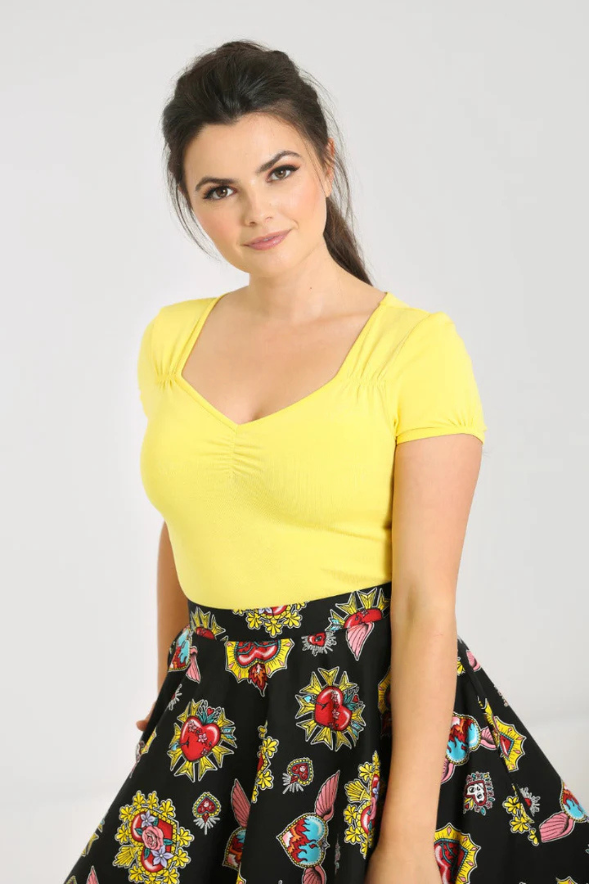 Kært barn har mange navne: Mia Top kan også søges som retro top, vintage top, jersey top, gul top, bomuldstop, pinup top, rockabilly top, basis top til nederdel, Hell Bunny top og stretchy bomuldstop.