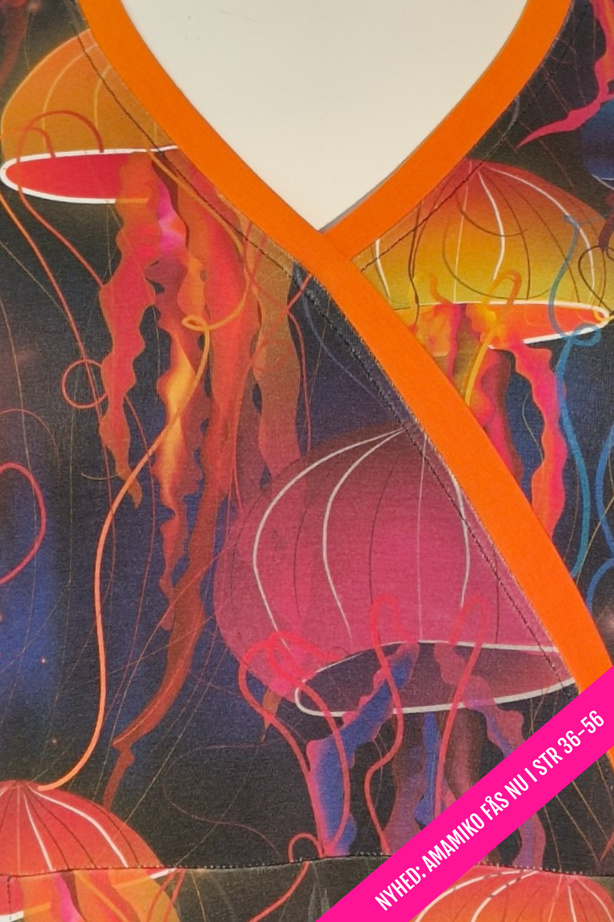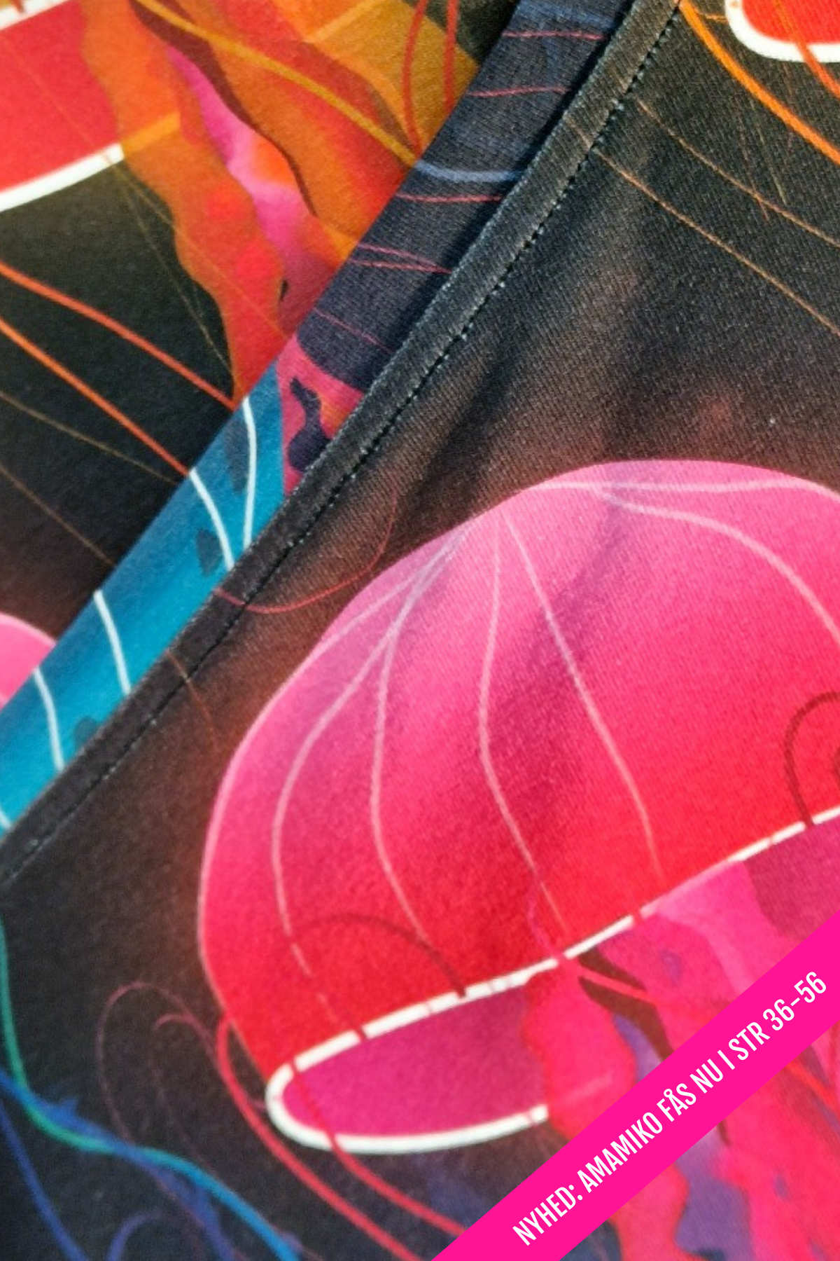 Bika Jellyfish fra danske Amamiko føles næsten som et lille stykke undervandsunivers. Printet er fyldt med svævende, lysende vandmænd i pink, orange og blå nuancer, der flyder hen over en mørk og dyb baggrund – lidt som havets eget nordlys.