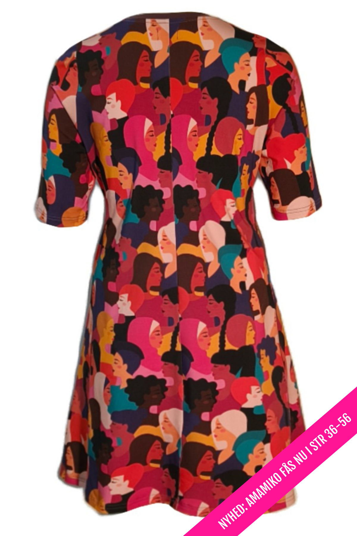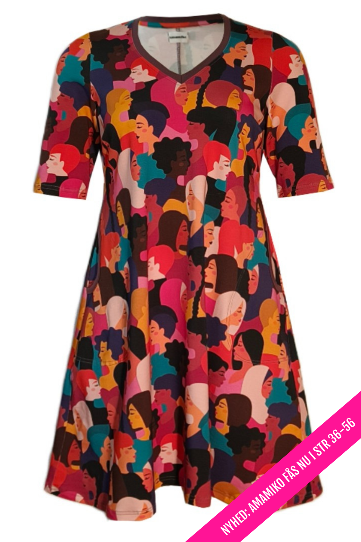 Kært barn har mange navne: Amamiko kjole, diversity kjole, farverig kjole, grafisk print kjole, A-formet kjole, dansk design kjole, bomuldsjersey kjole, kjole med lommer, plus size kjole, kjole med ansigtsprint, kunstnerisk print kjole – Vi skriver det hele, så du kan finde den, uanset hvad du søger efter.