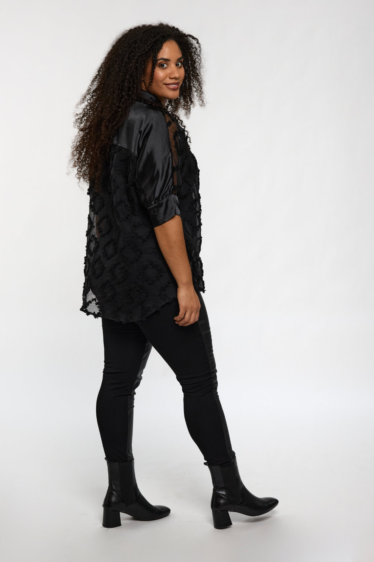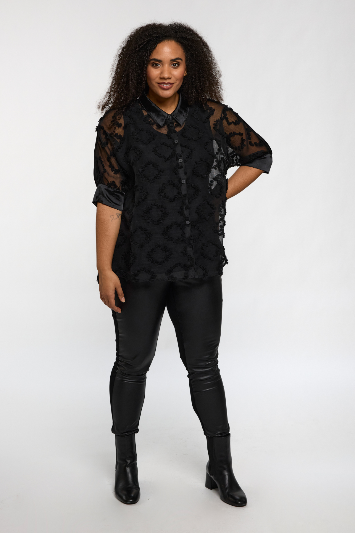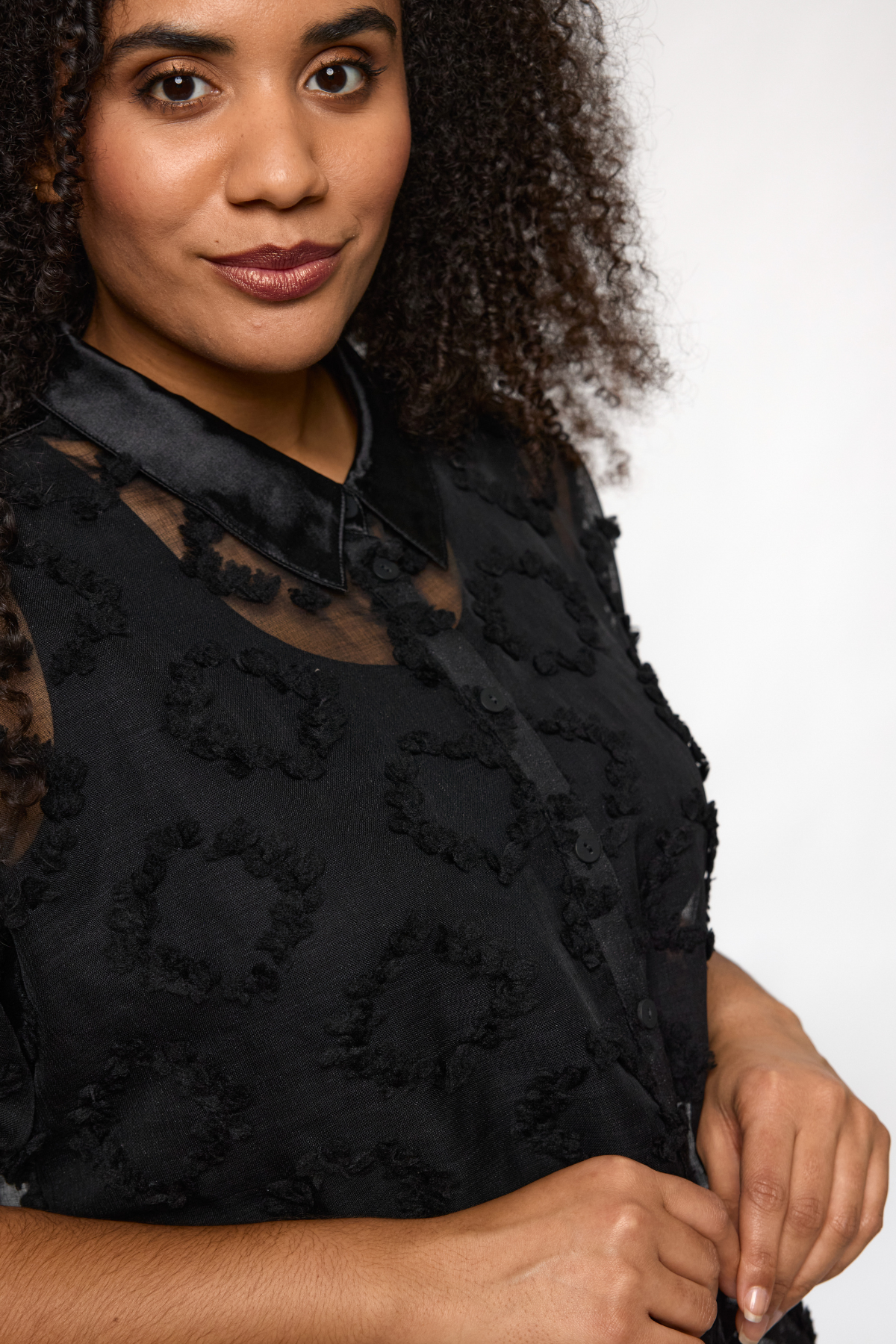 En let og stilren bluse i 100% polyester med et elegant sort udtryk. Designet har klassisk skjortekrave og gengående knappe-lukning, lange ærmer og en lige pasform, som gør blusen ideel til både arbejde og fritid.