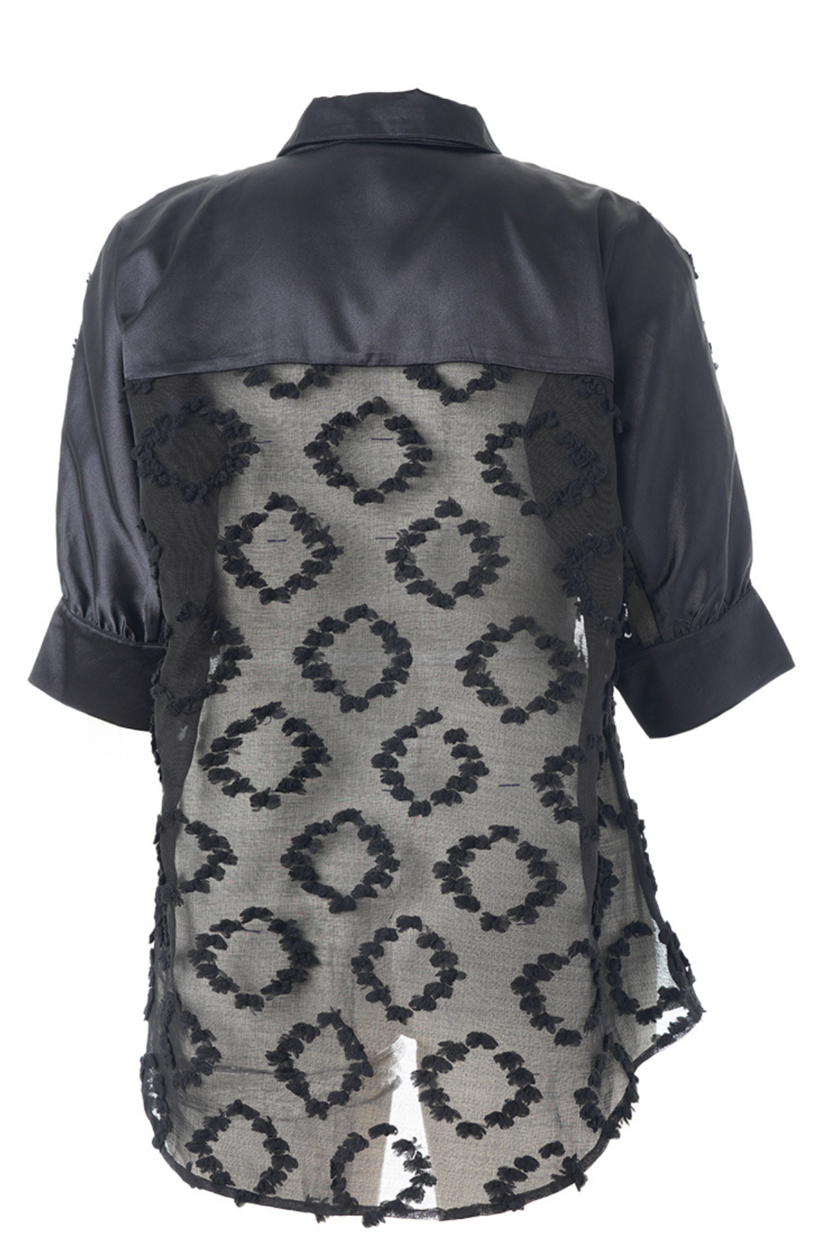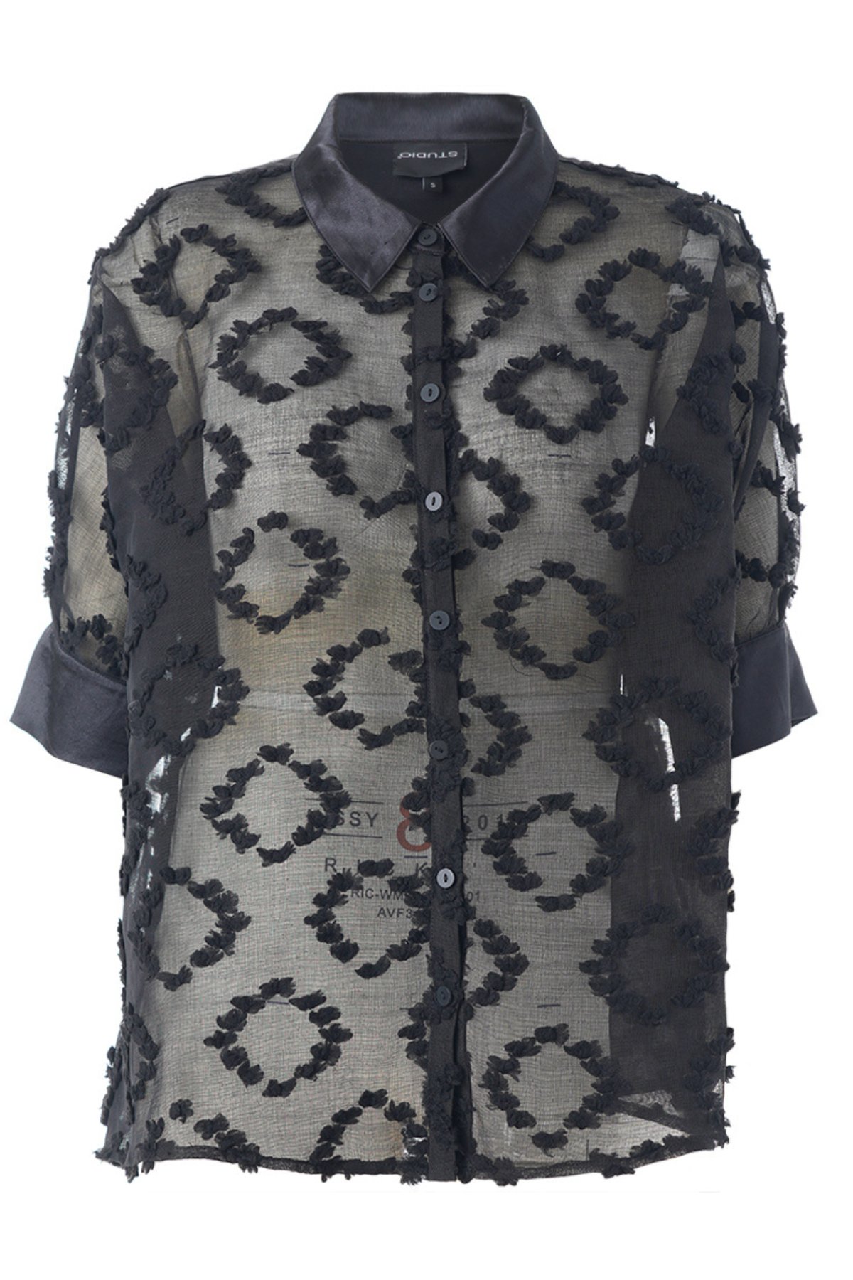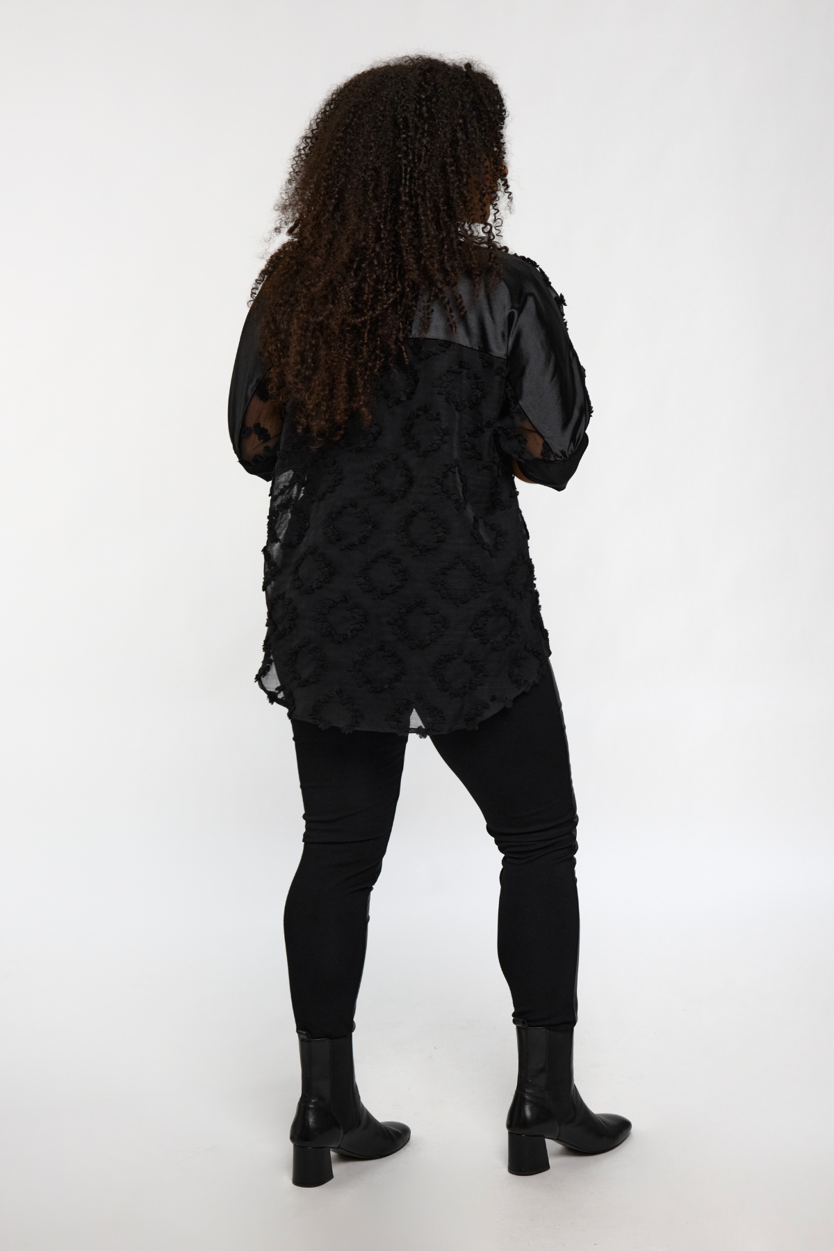En let og stilren bluse i 100% polyester med et elegant sort udtryk. Designet har klassisk skjortekrave og gengående knappe-lukning, lange ærmer og en lige pasform, som gør blusen ideel til både arbejde og fritid.