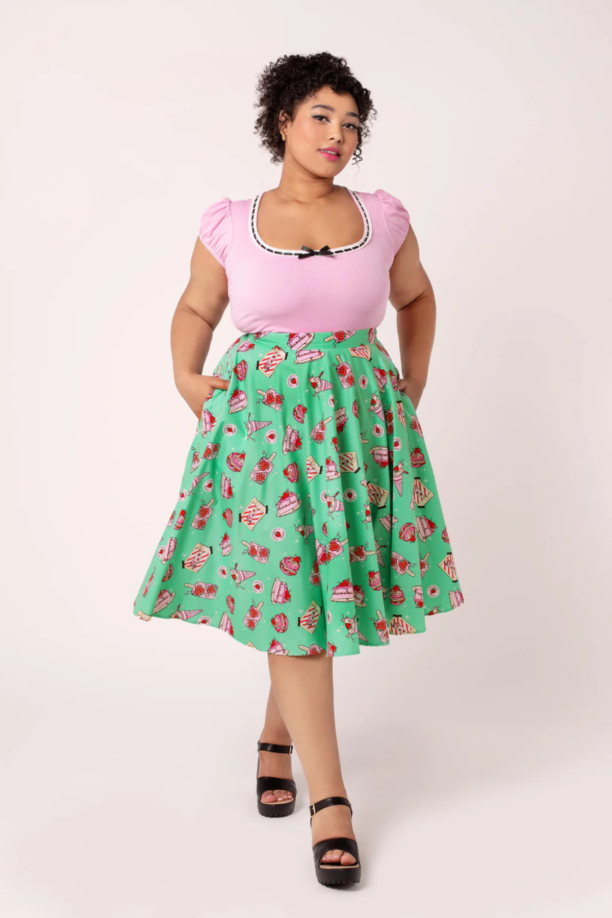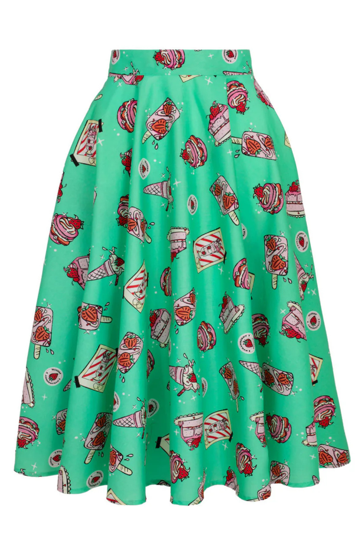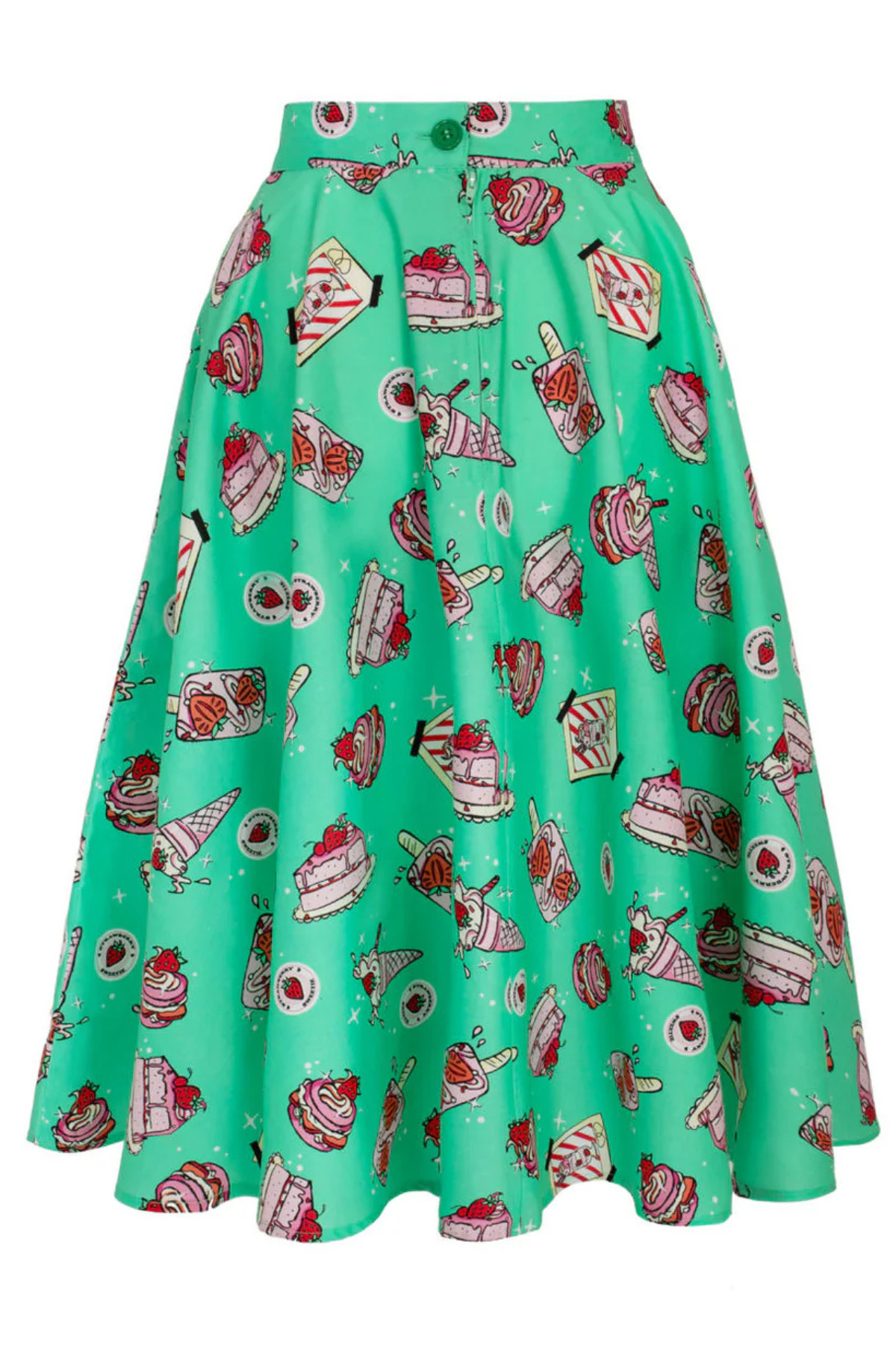 Nothing says sweet like Sweetie Pie Skirt 🍓 En ægte 50’er-inspireret cirkelnederdel i den fineste mintgrønne nuance, dekoreret med kager, is, jordbær og andre søde fristelser. Printet er legende og farverigt – præcis den slags, der får smilet frem.