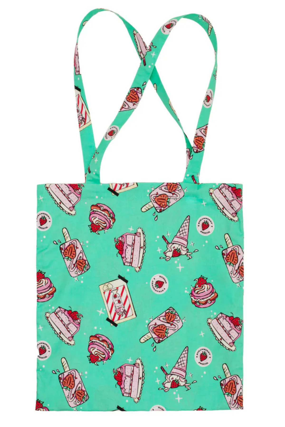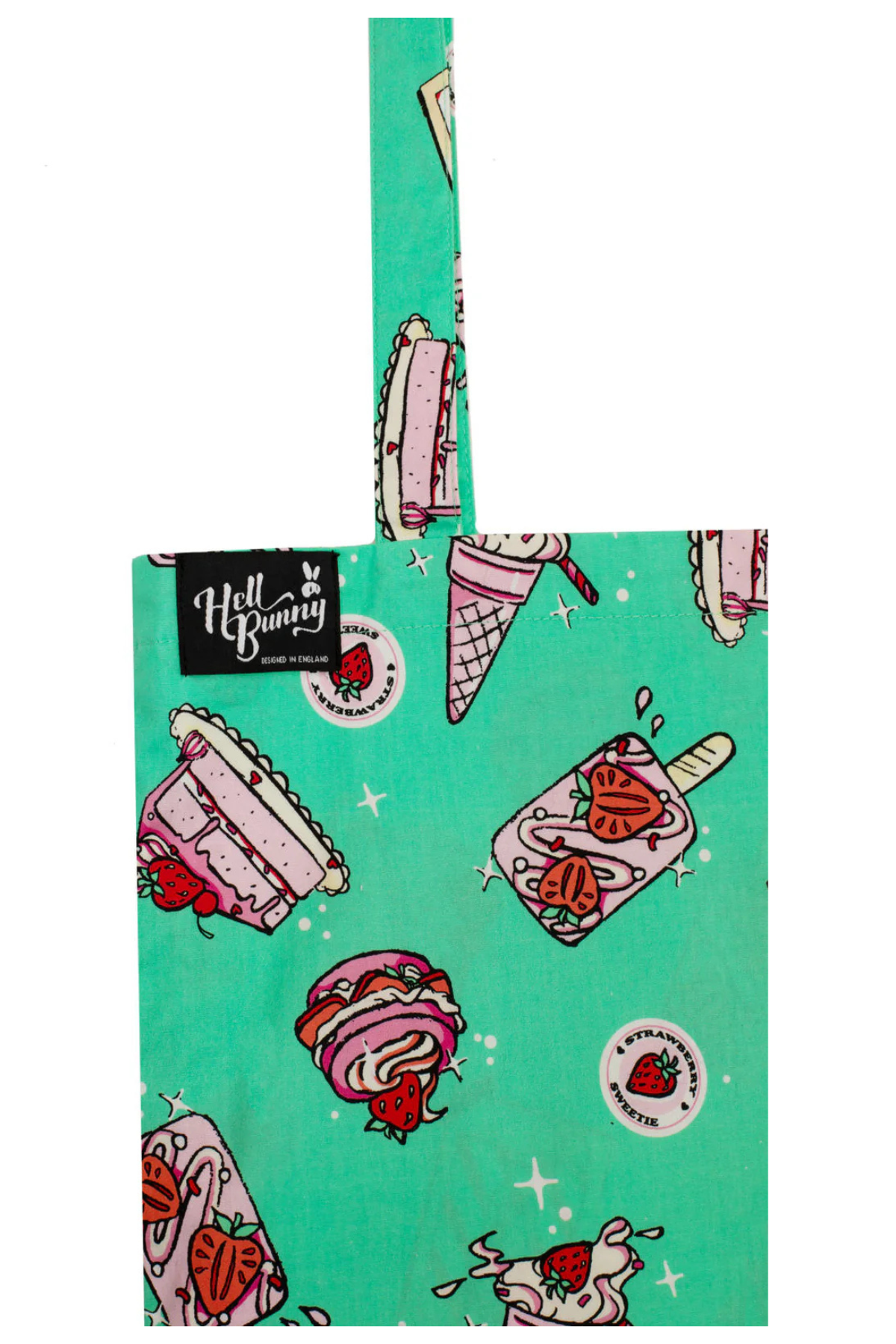Muleposen har den fineste mintgrønne bund med print af kager, is og jordbær. Den er rummelig, let og ideel til både shopping, arbejde eller som ekstra taske i hverdagen. En ægte candy-coated accessory til dit Happy Fashion-look 💚