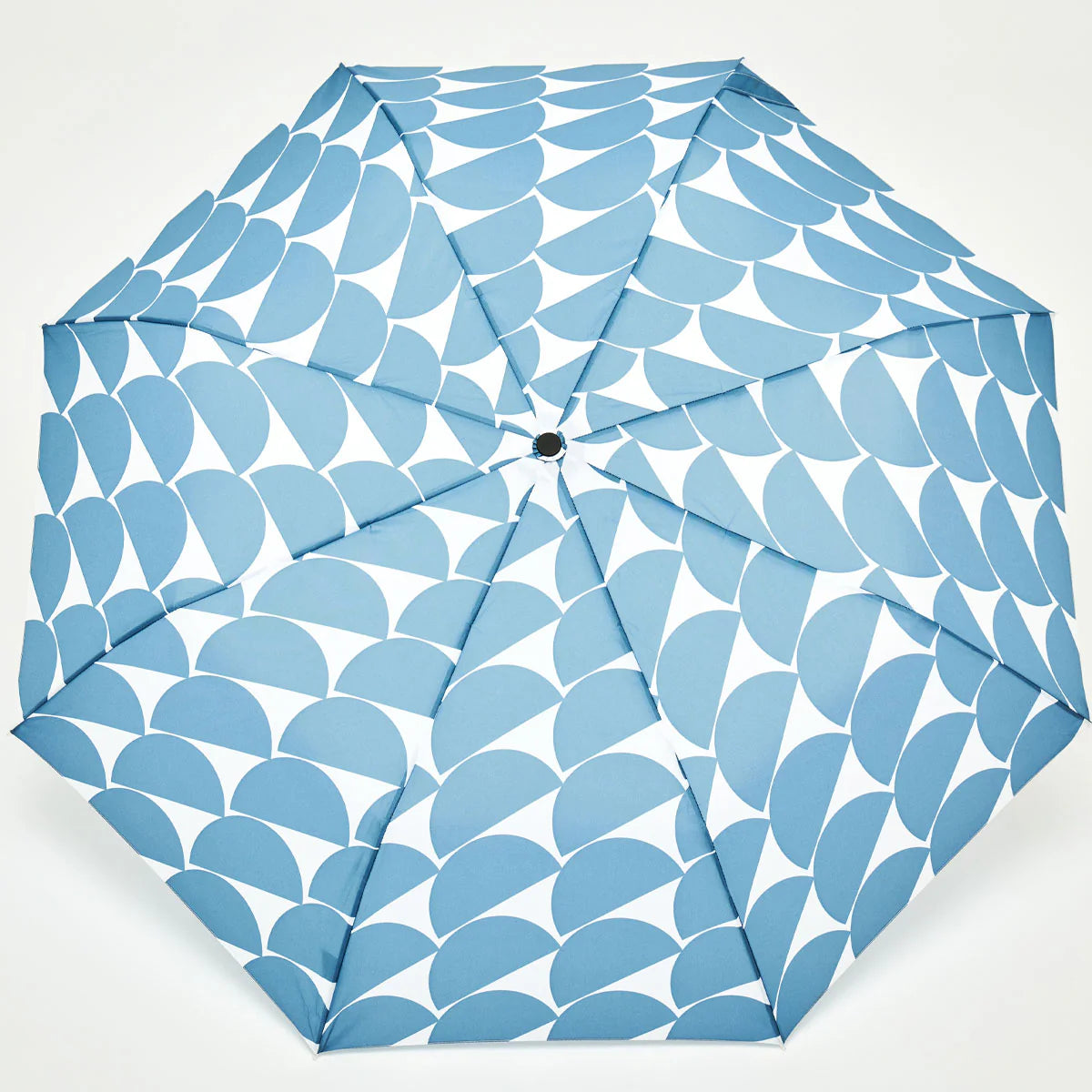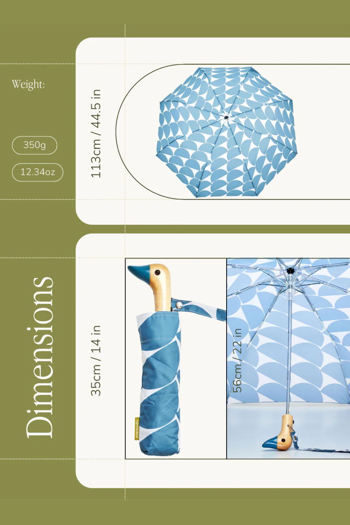 Denim Moon Duck Umbrella er til dig, der elsker et mere roligt udtryk – men stadig vil have noget, der føles helt igennem Happy. Det denimblå mønster med hvide, buede “måneformer” giver et cool, grafisk look, der passer til alt (og ser virkelig lækkert ud på gaden i regnvejr). Og ja… den ikoniske and er selvfølgelig med: håndtaget er udskåret i ét solidt stykke birketræ med et blå “næb”, der gør paraplyen til en ægte samtalestarter. 🦆💙