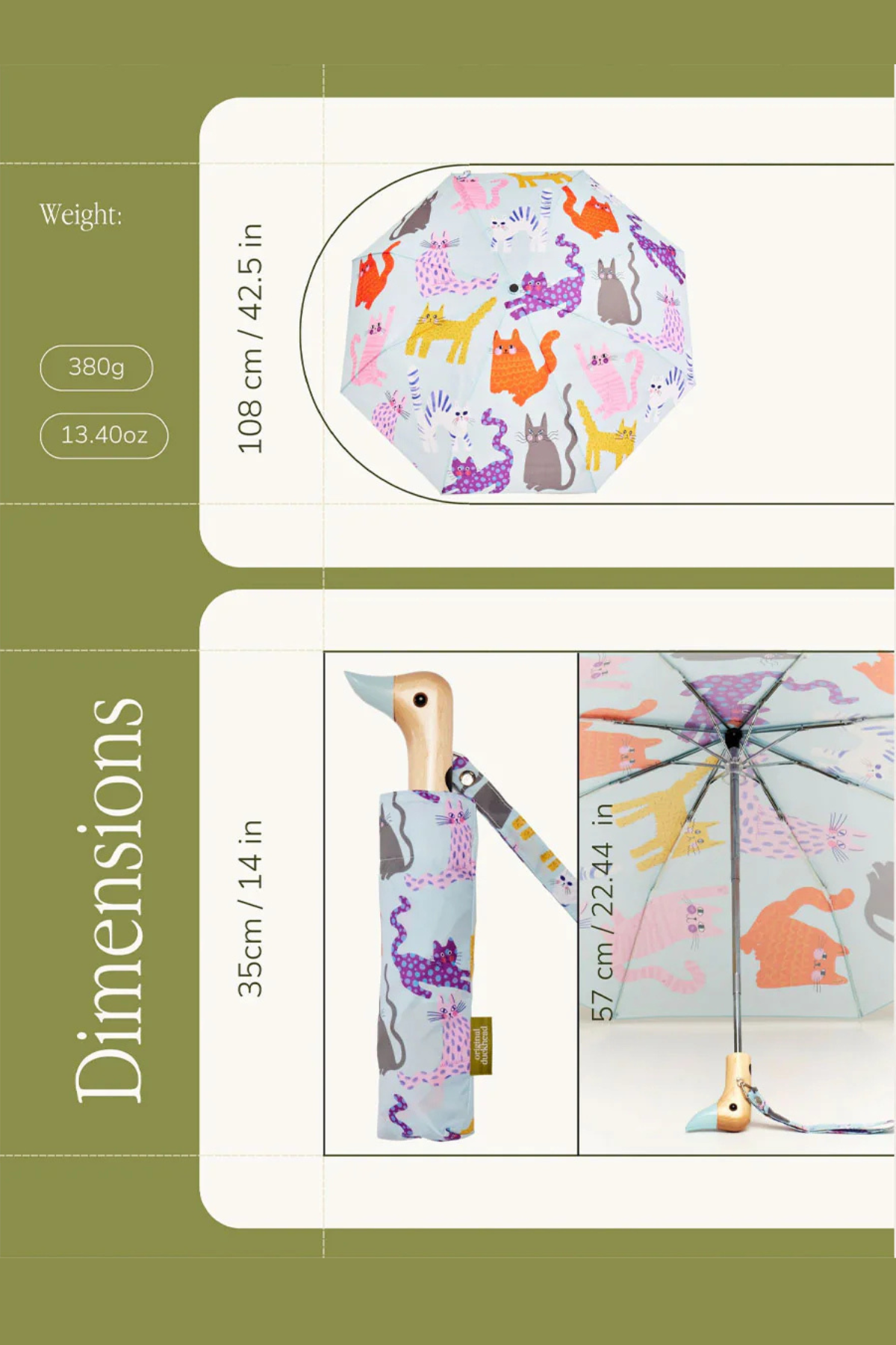 Leder du efter en bæredygtig paraply med katteprint? Ice Arty Cats Duck Umbrella fra Original Duckhead er en kompakt, vindresistent paraply fremstillet af genanvendte plastikflasker. Denne miljøvenlige paraply kombinerer farverigt kattemotiv, PFAS-fri coating og træhåndtag i ikonisk andeform. Perfekt til dig, der ønsker en eco-friendly paraply med personlighed.