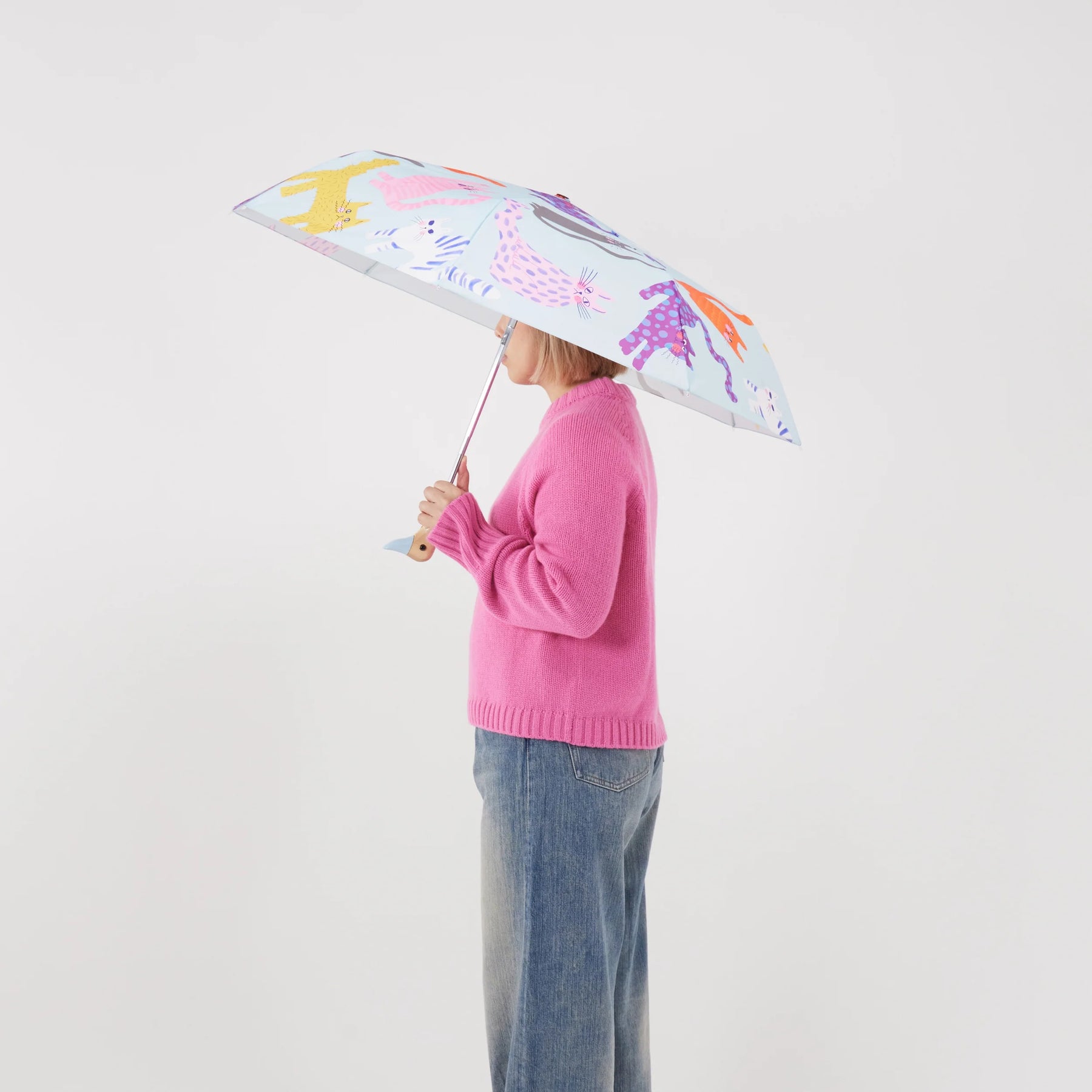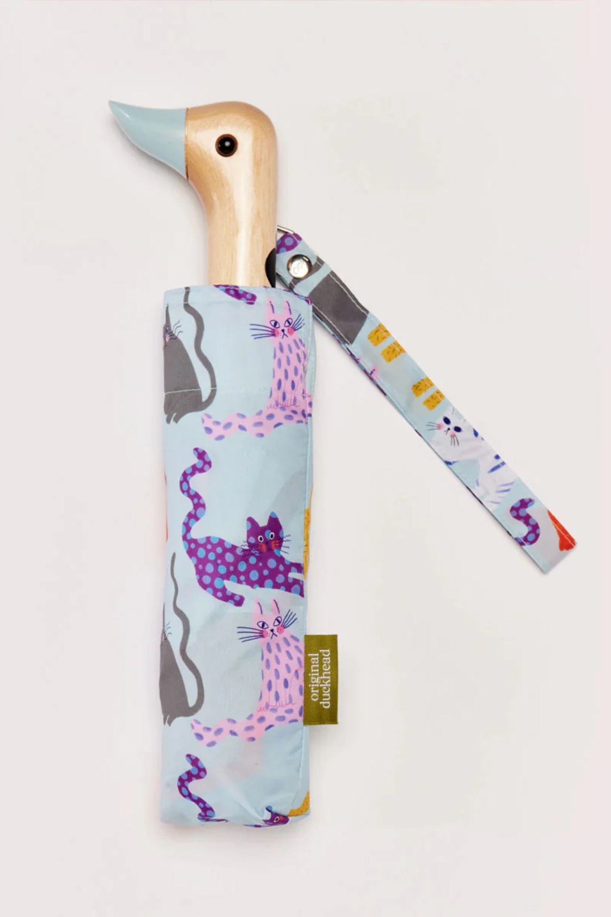 Ice Arty Cats Duck Umbrella fra Original Duckhead er en farverig, glad og ultra-chic paraply med de skønneste illustrerede katte på en kølig isblå bund. Den kombinerer leg, kvalitet og ansvarlighed – præcis som vi elsker det i Happy Fashion.