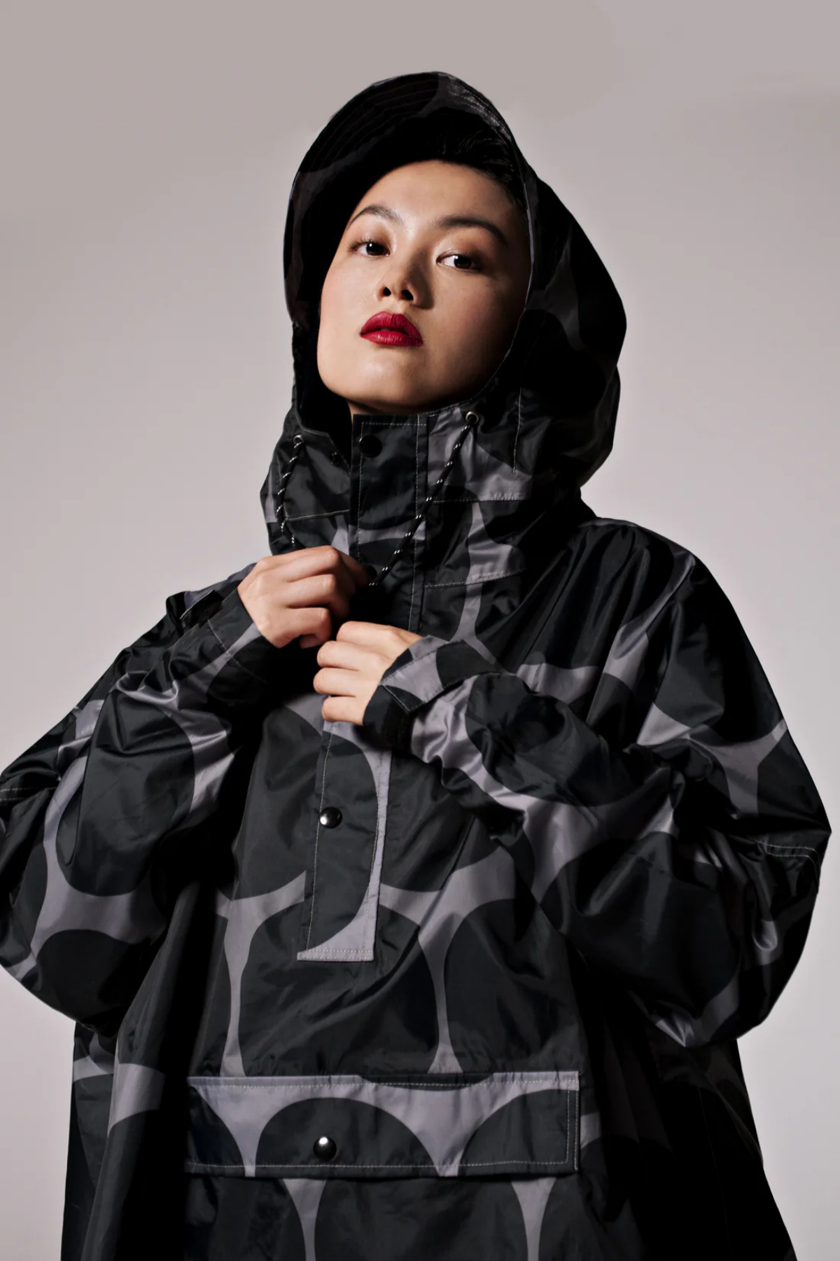 Rainkiss kombinerer genbrugsmaterialer og ansvarlig fremstilling med banebrydende designs. Vi skaber unisex ponchos, der blander både funktionalitet med modefremadrettede prints og kunstinspirerede farver. Rainkiss ponchos er lavet af 100% certificeret genbrugspolyester. Genanvendt polyester bruger PET (plastikflasker) som råvare.