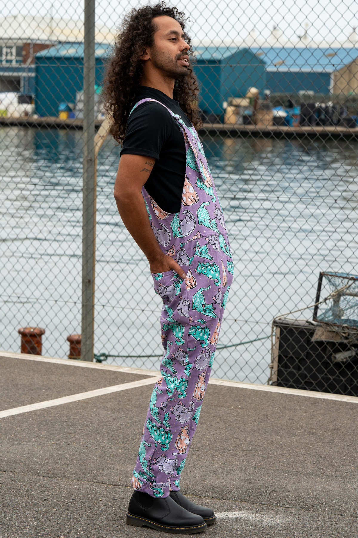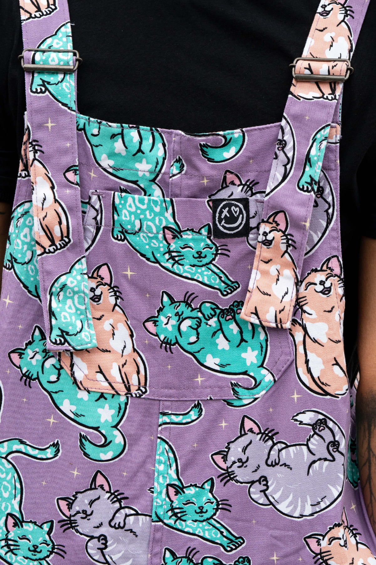 Kært barn har mange navne: Katte dungarees, pastel smækbukser, purple overalls, Rebel Romance x Abi Perry, unisex buksedragt, sjovt katteprint, purrfect cats outfit, alternative fashion, plus size overalls, kawaii cat clothing, kunstnerisk print tøj – vi skriver det hele, så du kan finde den uanset hvad du søger efter.