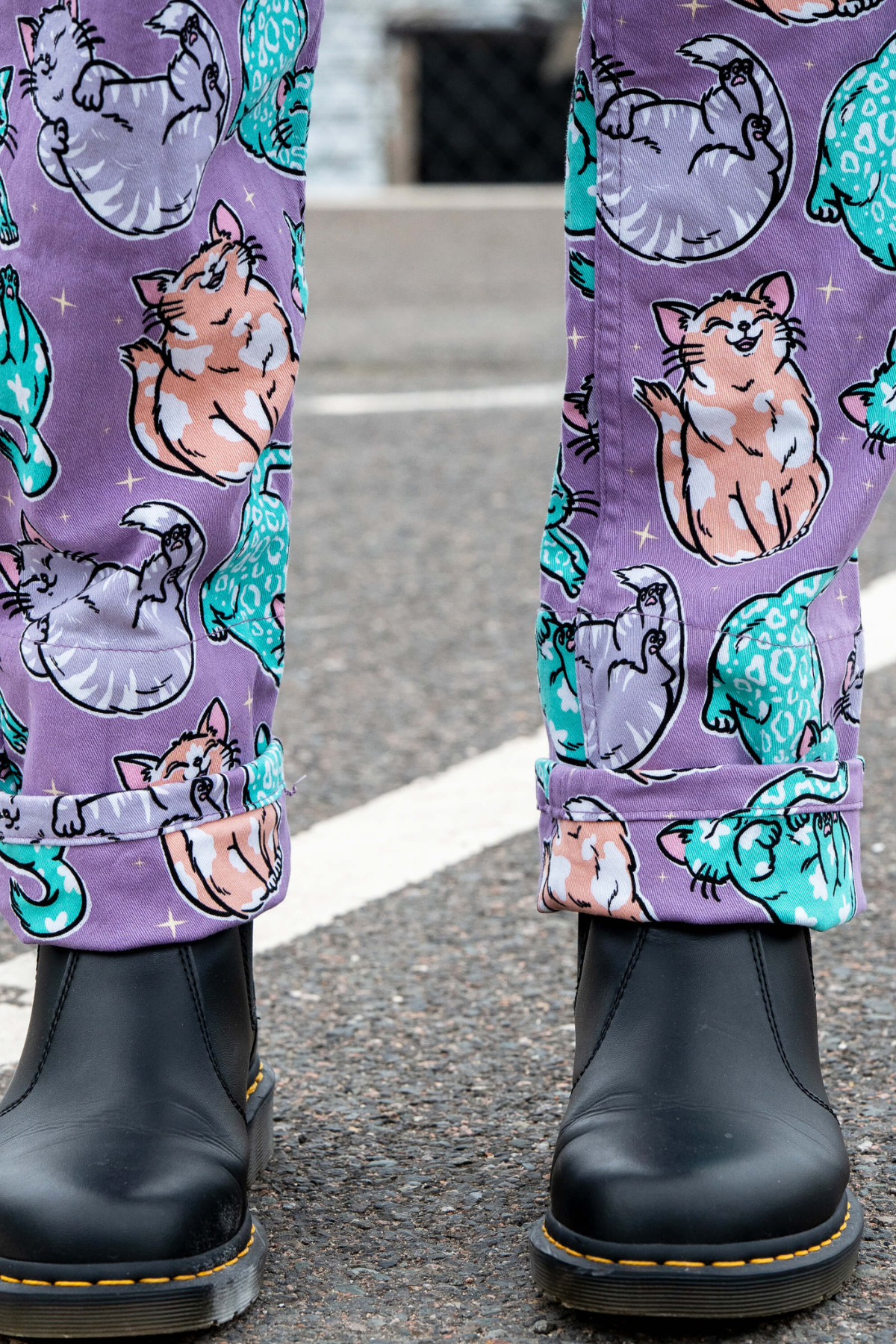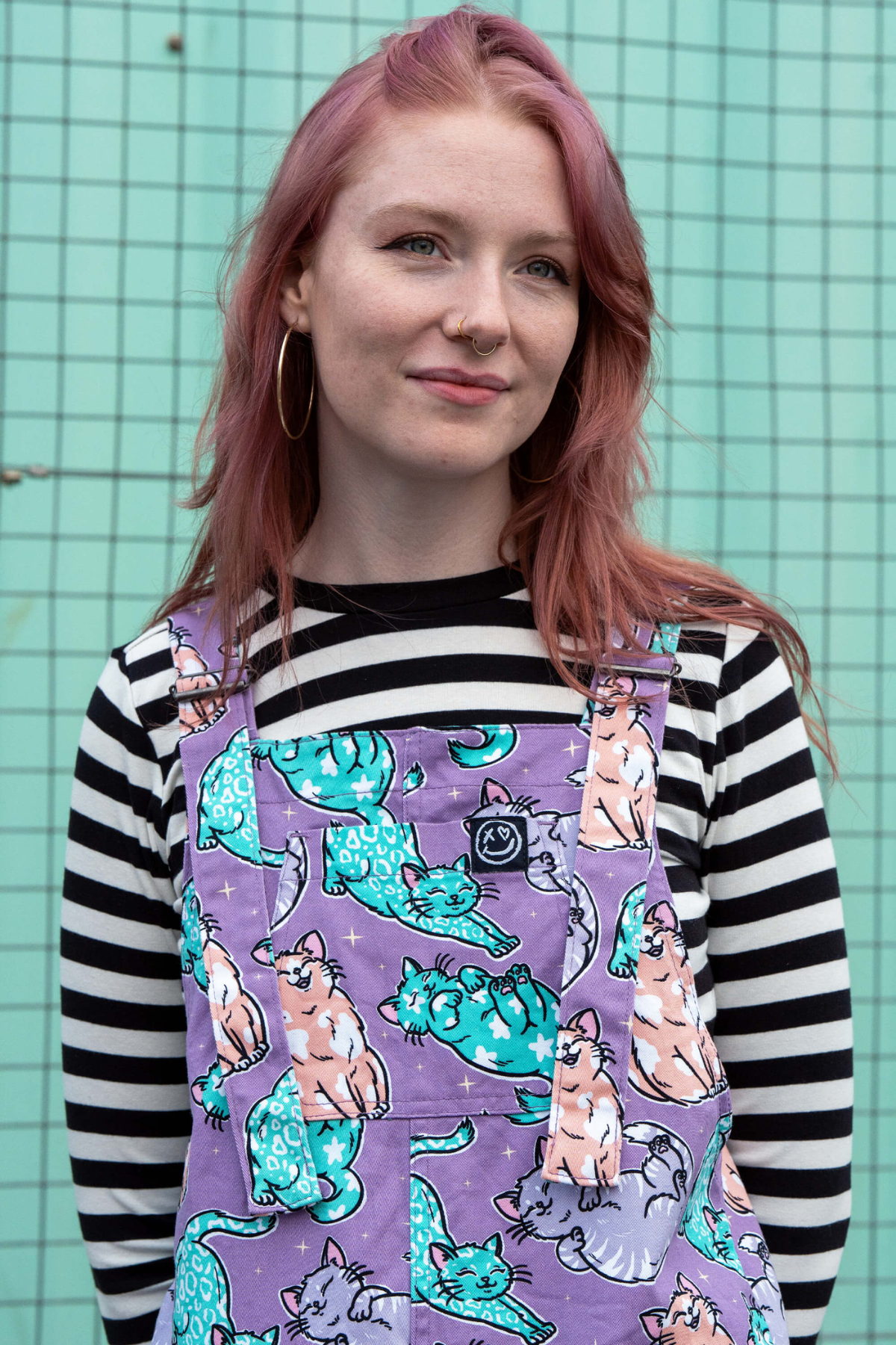 Sig hej til Purrfect Cats Stretch Dungarees, et uimodståeligt samarbejde mellem Rebel Romance og den britiske tattoo-kunstner Abi Perry (@millionmilesofwater). Disse lilla dungarees er dækket af drømmende katte i mint, fersken, grå og turkis – hver enkelt med sin egen personlighed. Resultatet? Et stykke wearable joy, der spreder gode vibes hele dagen.