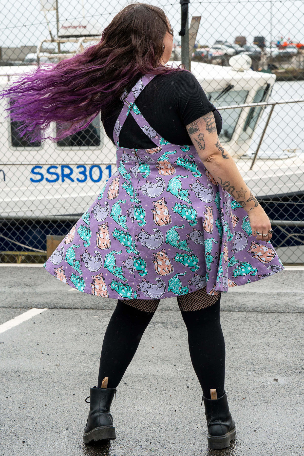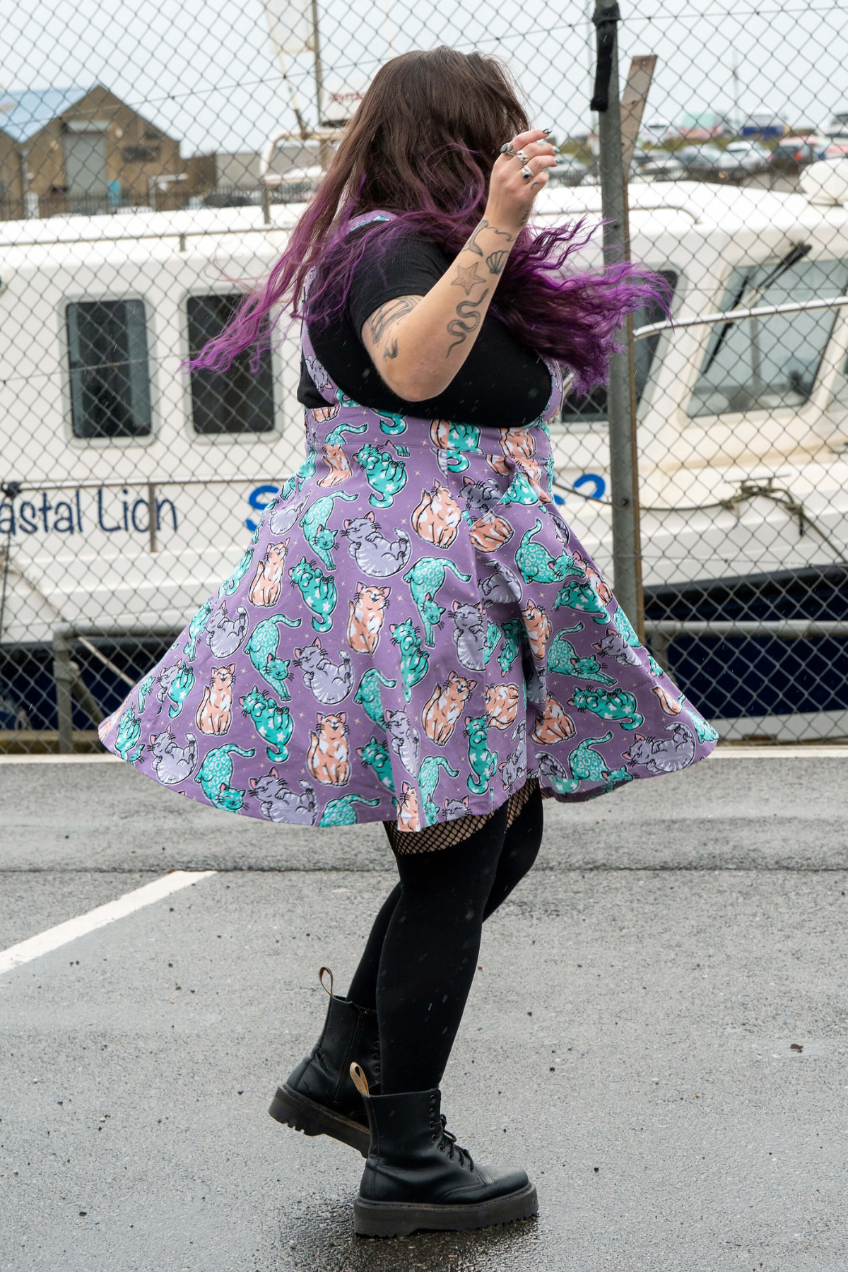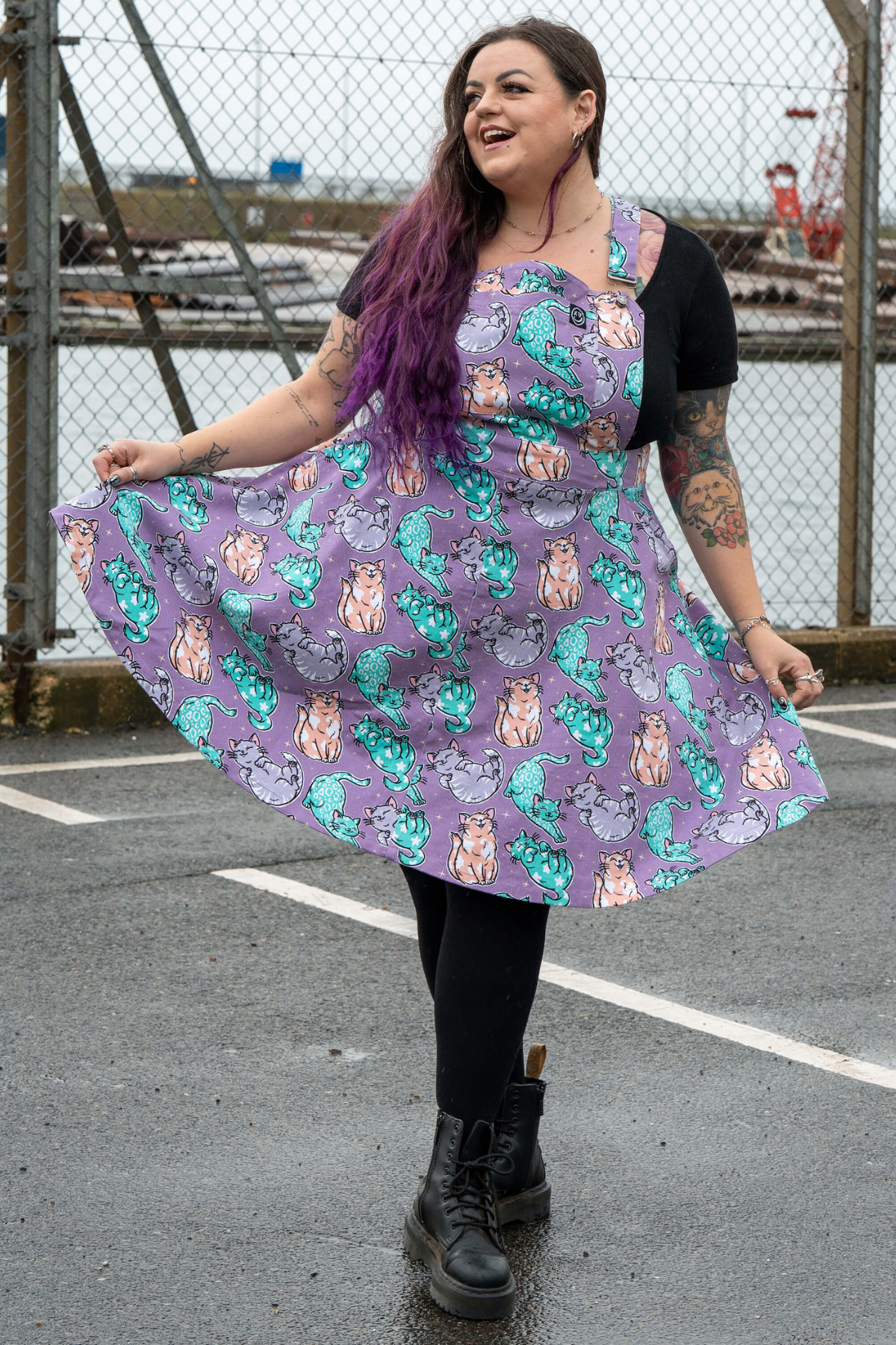 Træd ind i et pastelkatte-paradis! Denne flared pinafore er skabt af den fantastiske tattoo-artist Abi Perry, og printet er en ren kærlighedserklæring til alle katteelskere. De strækkende, sovende og smilende katte i mint, fersken, grå og teal spreder ren glæde – du kan nærmest mærke serotonin boostet 💜