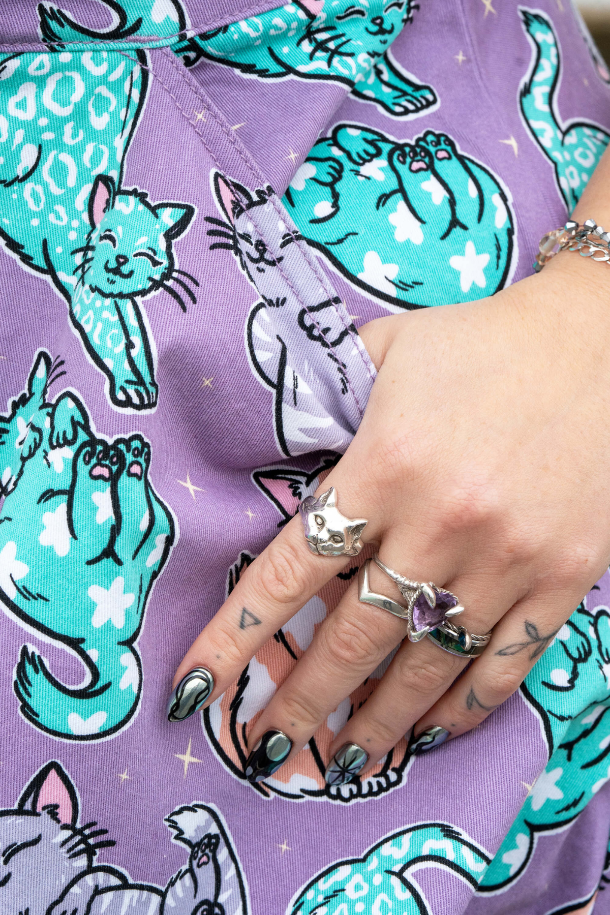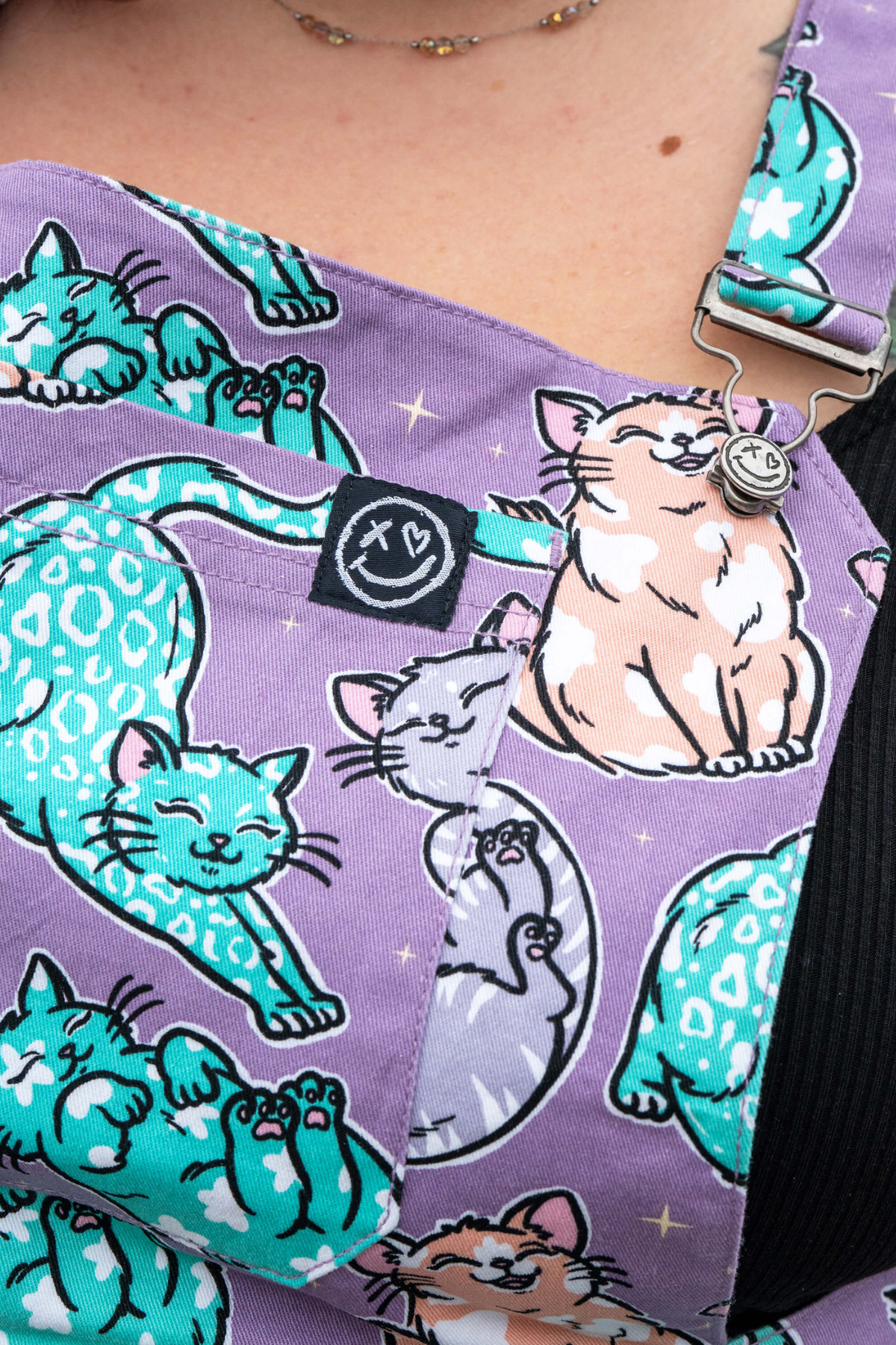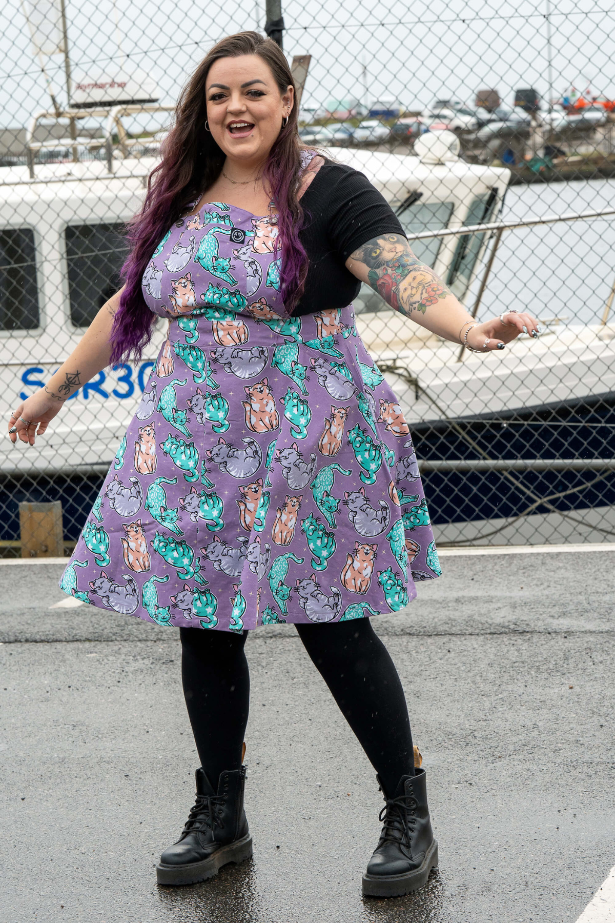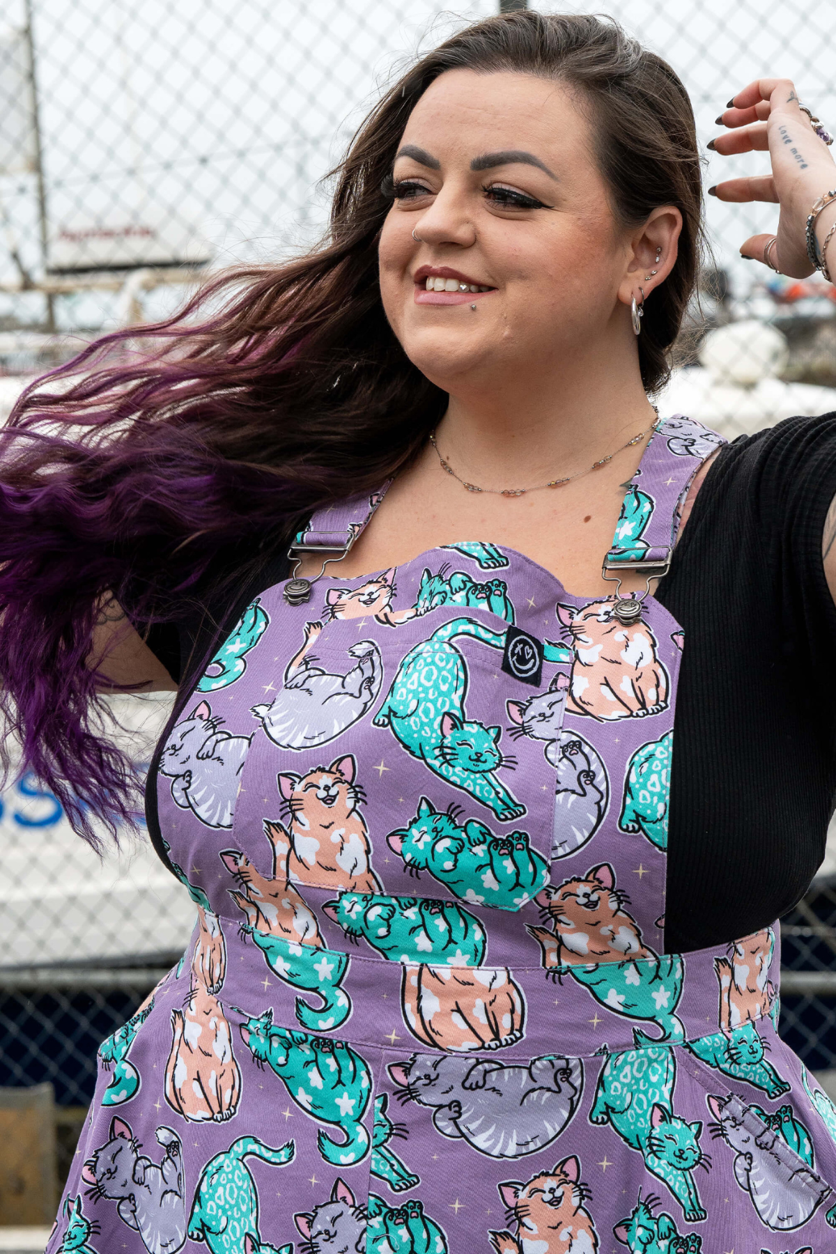 Træd ind i et pastelkatte-paradis! Denne flared pinafore er skabt af den fantastiske tattoo-artist Abi Perry, og printet er en ren kærlighedserklæring til alle katteelskere. De strækkende, sovende og smilende katte i mint, fersken, grå og teal spreder ren glæde – du kan nærmest mærke serotonin boostet 💜