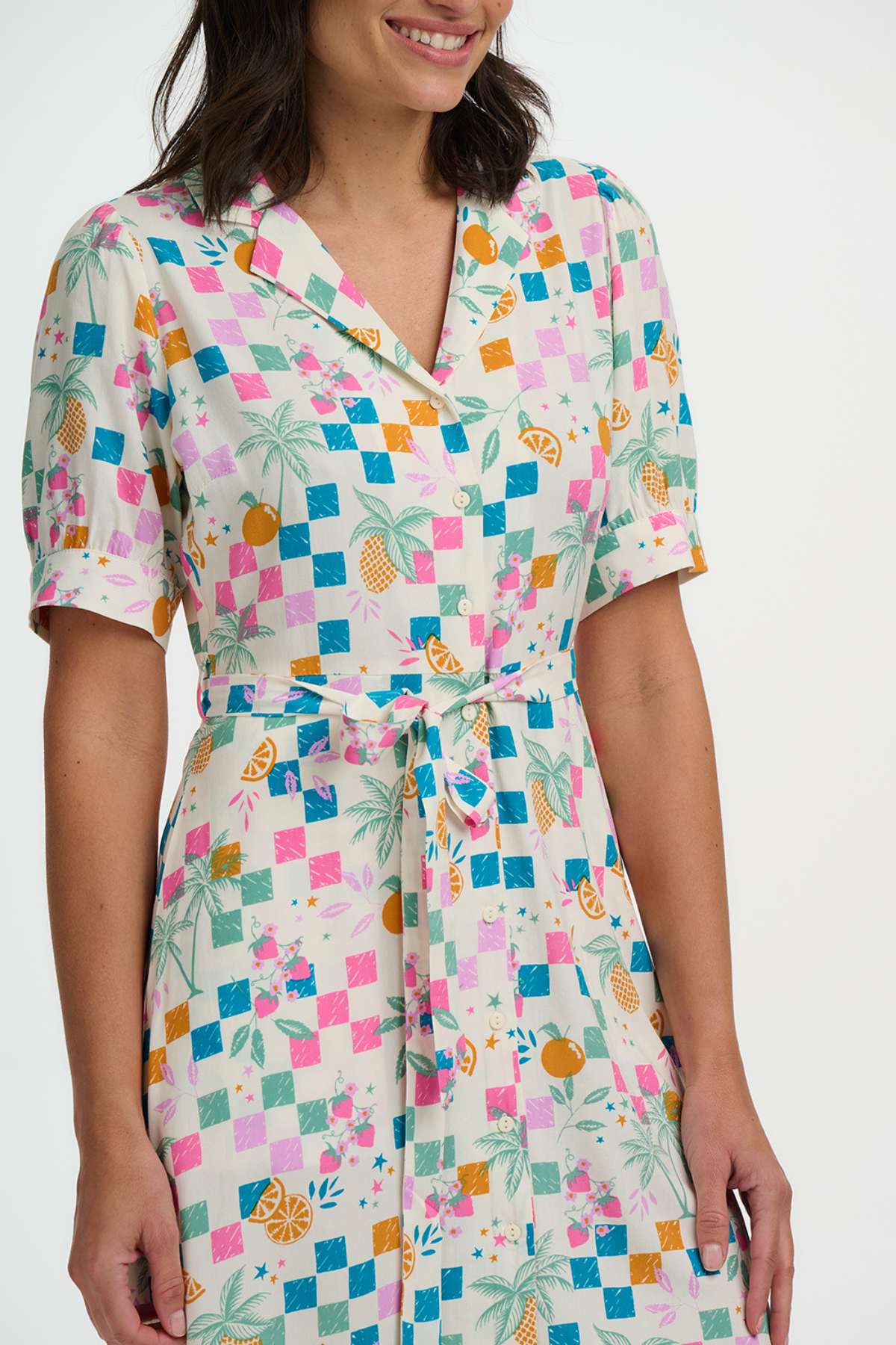 Detalje af Sugarhill Brighton kjole med knaplukning, bindebånd i taljen og farverigt print med frugter og palmer
