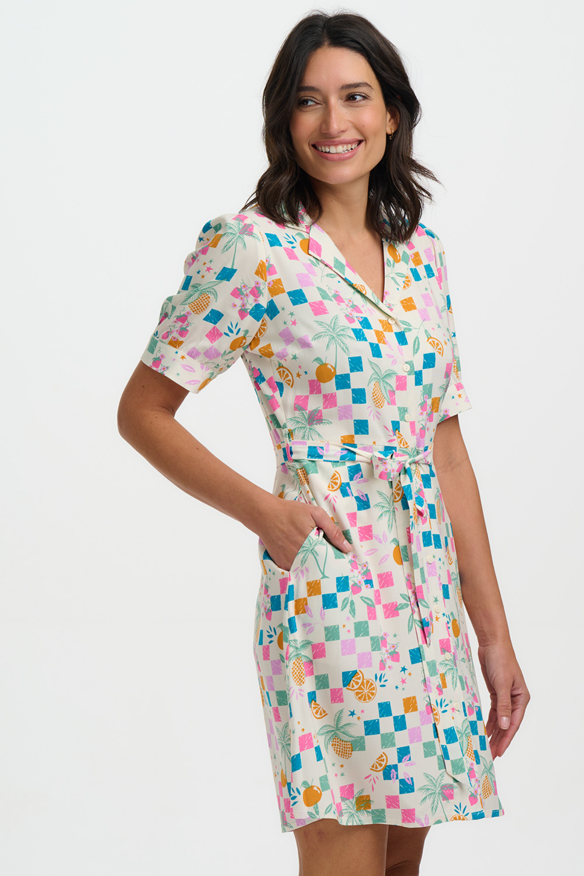 Sugarhill Brighton Rebekka Mini Shirt Dress med farverigt checkerboard print og frugtmotiver, vist på model med bindebånd i taljen